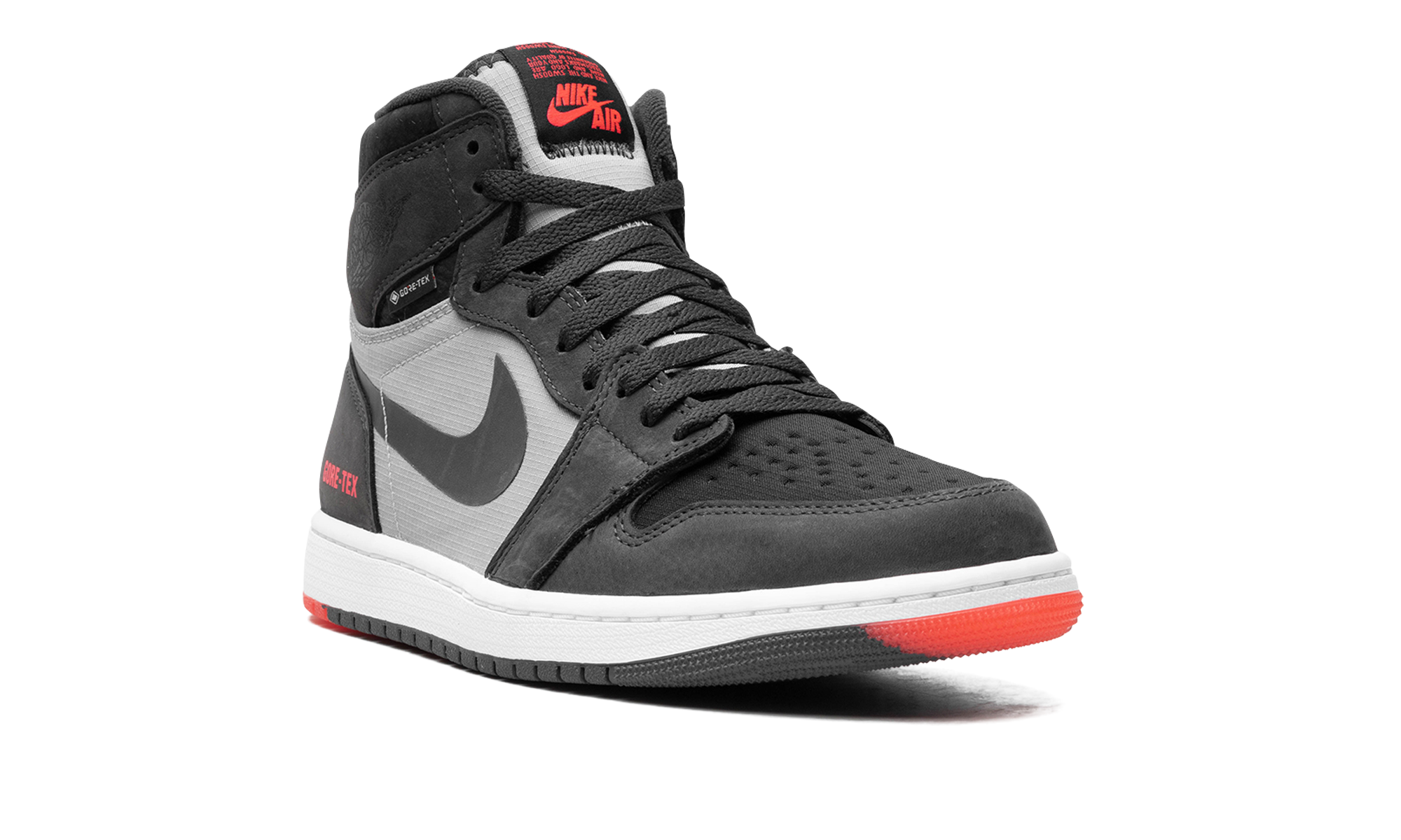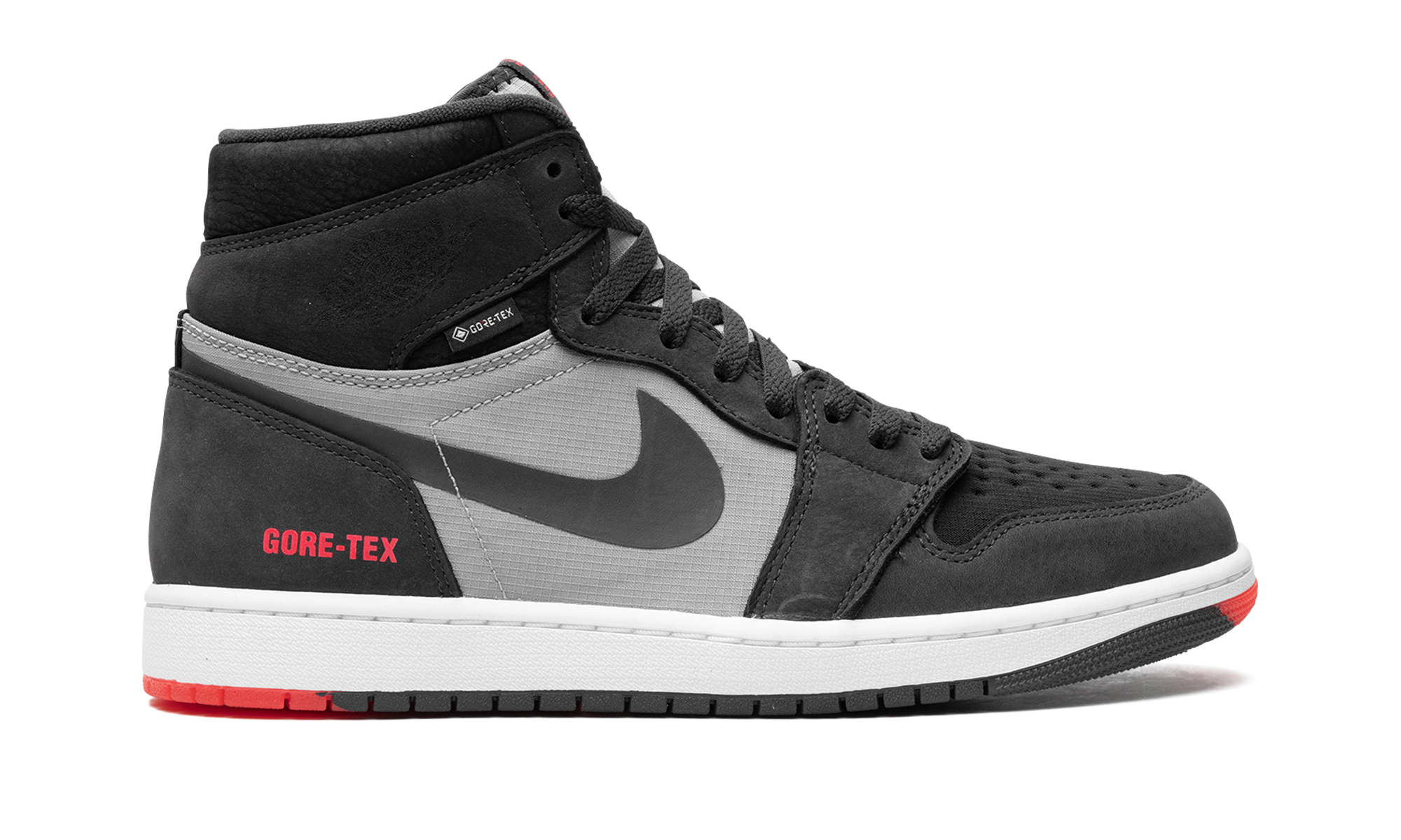 The Air Jordan 1 Element “Bred” is a colorway of the weatherproof version of Michael Jordan’s first signature shoe. The Jordan 1 Element first appeared as part of Jordan Brand’s Holiday 2021 collection and gives the venerable basketball and lifestyle shoe a rugged design that’s meant to withstand the elements, including harsh weather conditions. A Gore-Tex membrane insulates the upper, with overlays on the toe cap, forefoot, and eyelets appearing in black nubuck. A grey ripstop-like material appears on the mid-panel and a black textile is found on the perforated toe. A black Swoosh logo is located on the sides. A tonal “Wings” logo resides on the collar and red “Gore-Tex” branding is printed on the lateral side of the heel. Release date: December 12, 2023