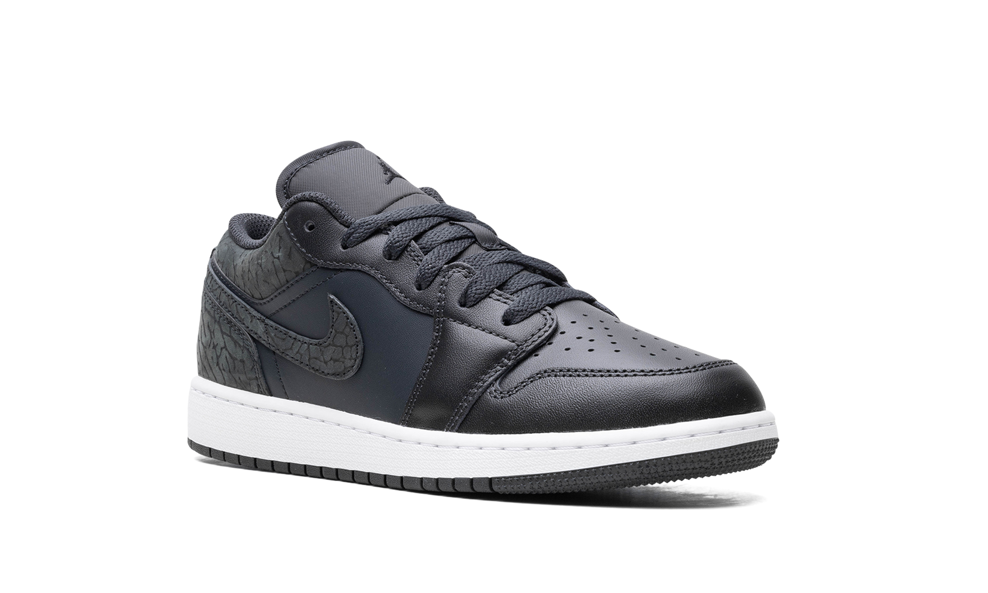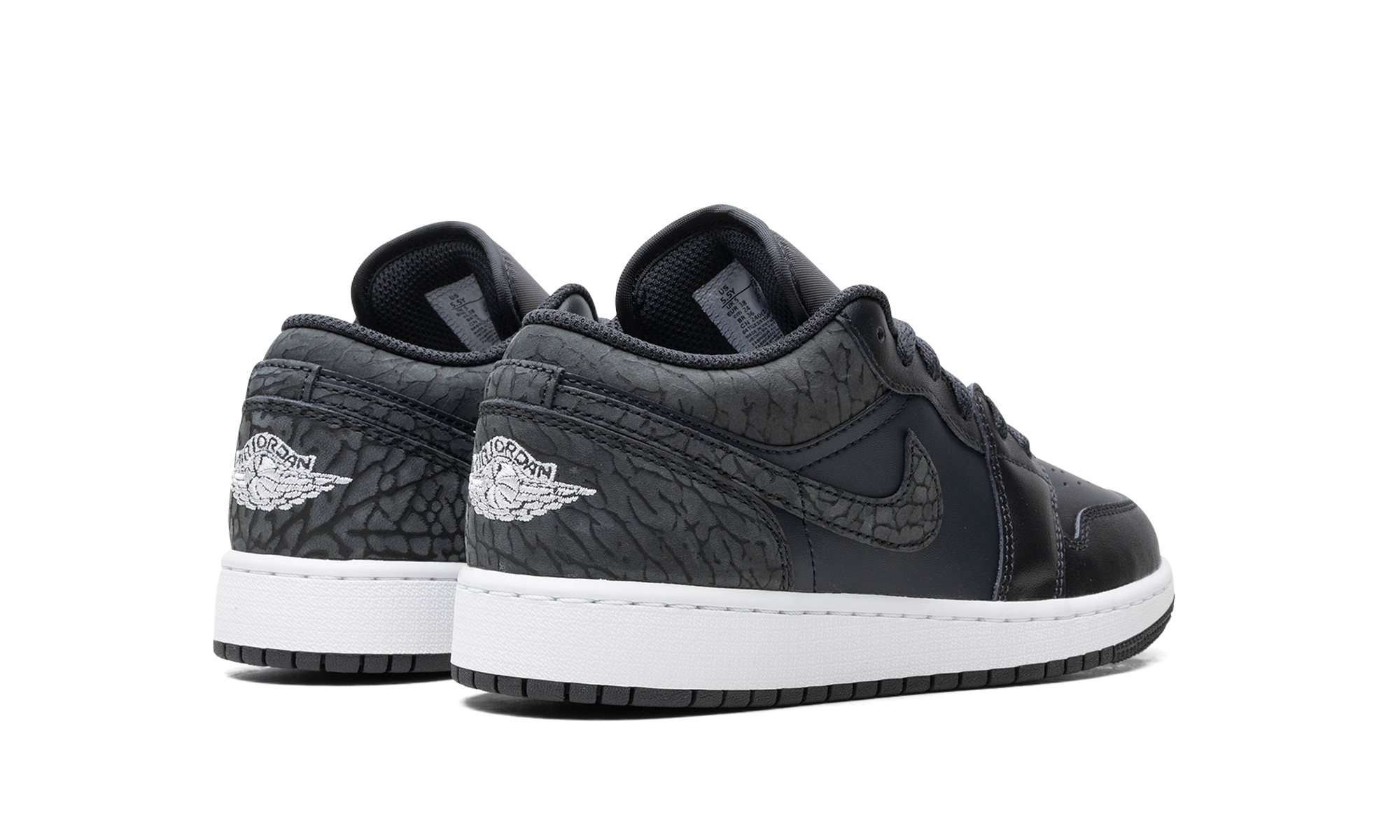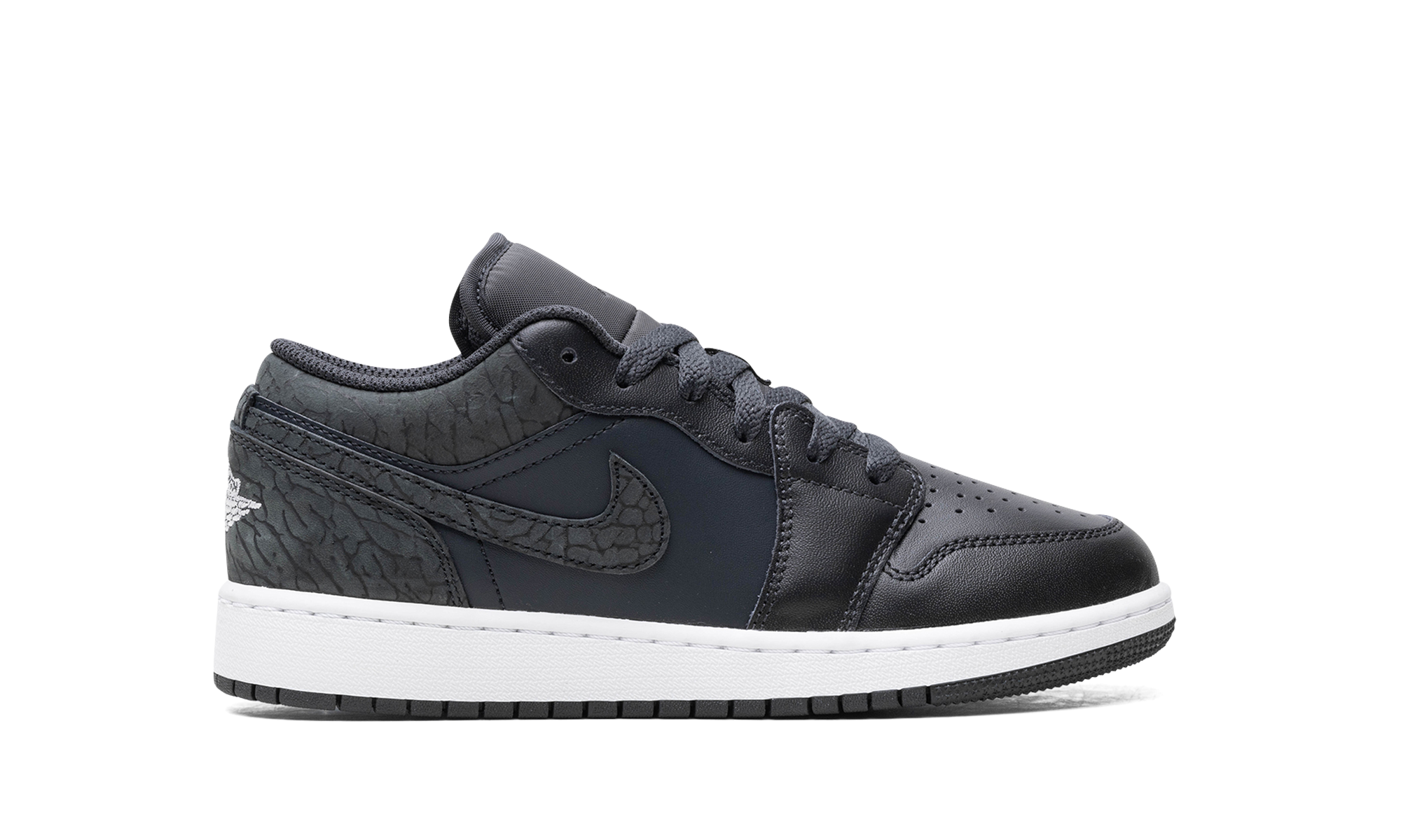 The Air Jordan 1 Low GS “Black Elephant” is the youth sizing of the retro basketball shoe in a colorway with classic Air Jordan detailing. The Jordan 1 Low GS “Black Elephant” features the same elephant patterning that was found on the Air Jordan 3 when it debuted in 1988. The print appears on the black Swoosh logo on either side of the shoe, on the heel, and on the collar. The rest of the shoe features a black leather construction and a black nylon tongue. A black Jumpman is embroidered on the tongue. Underfoot, a white midsole and black outsole complete the look. Release date: October 20, 2023