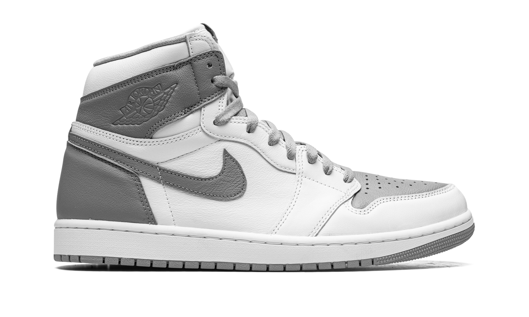 The Air Jordan 1 High OG “Stealth” is a versatile, two-tone, white and grey colorway of Michael Jordan’s first signature shoe. The “Stealth” is one of the most wearable versions of the popular Jordan 1 High OG model around, and it’s easy to see why based on the shoe’s classic appearance. Stealth, or grey, leather can be found on the perforated toe, collar, heel, and Swoosh. Contrasting white leather appears on the toe, forefoot, mid-panel, and collar. A tonal “Wings” logo is located on the collar, and white “Nike Air” and Swoosh detailing can be found on the grey nylon tongue tag on the white nylon tongue. Underfoot, a white midsole and grey outsole finish off the look. Release date: August 27, 2022