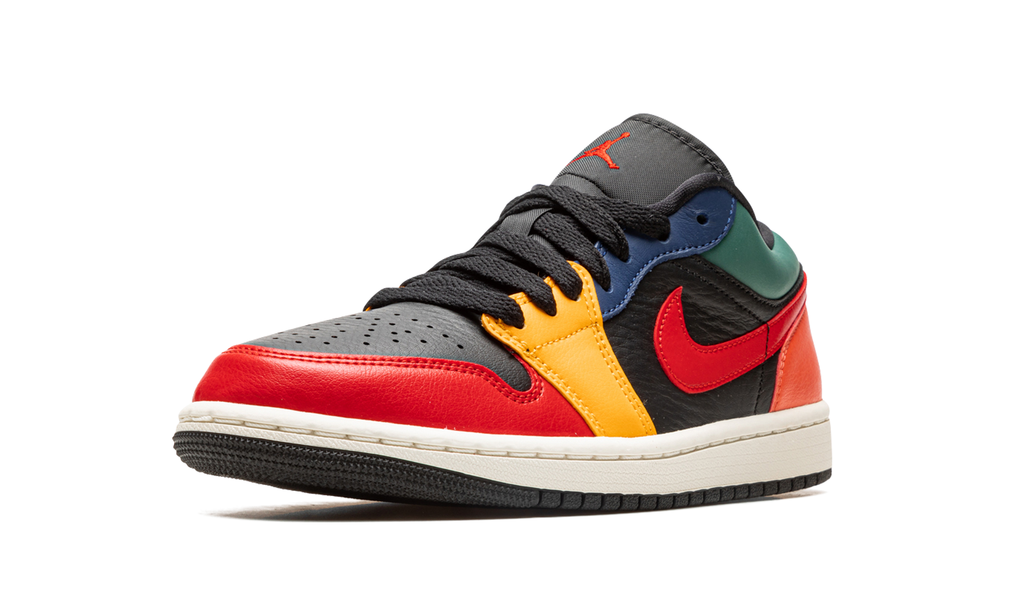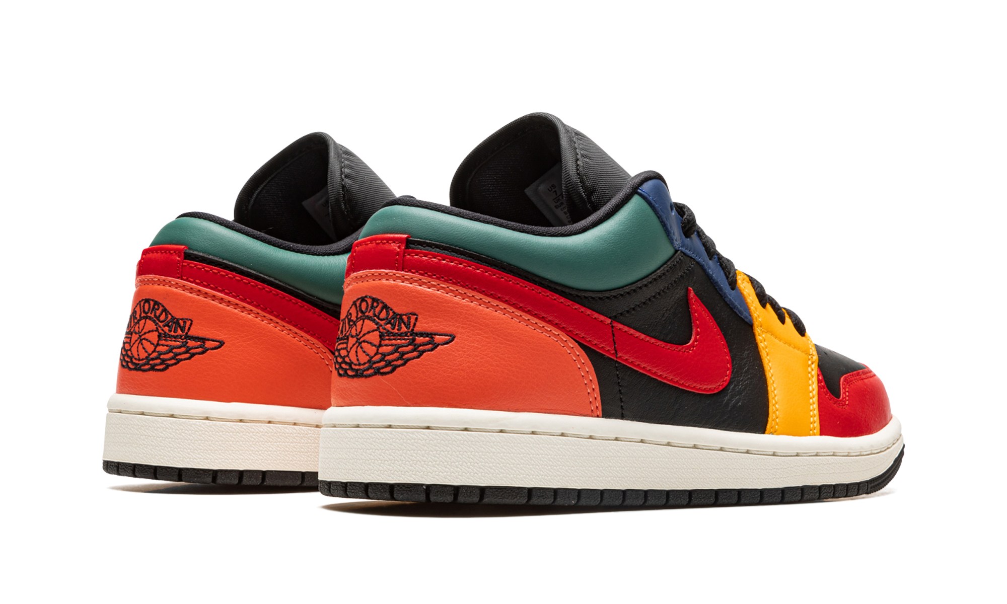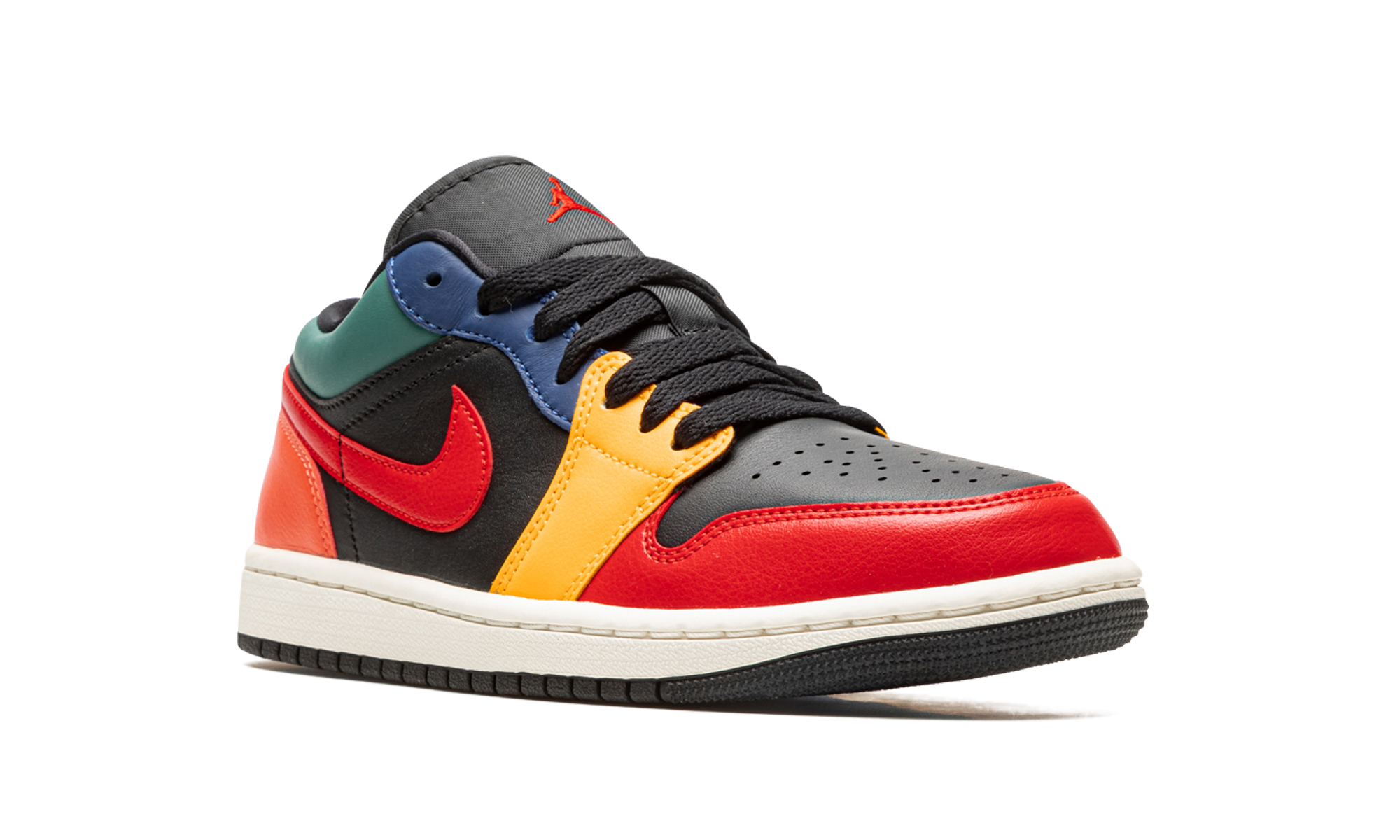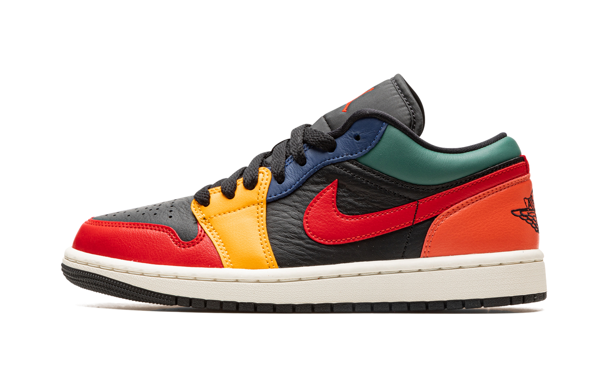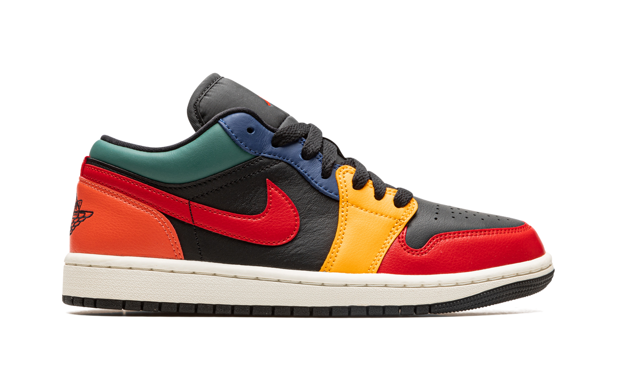 The Women’s Air Jordan 1 Low “Black Multicolor” is a women’s-exclusive colorway that combines various hues across its design. Reminiscent of the Women’s Air Jordan 2 “Multi-Color,” and other styles with a colorful appearance, the “Black Multicolor” is complete with a black leather base, and colorful leather overlays. A Fire Red leather Swoosh appears on either side of the shoe while a black “Wings” logo can be found on the heel. A red Jumpman is located on the black nylon tongue. A cream rubber midsole and black outsole complete the look.