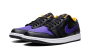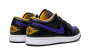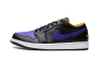The Air Jordan 1 Low “Dark Concord” is a colorway of Michael Jordan’s first signature shoe in the low-top style that is loosely inspired by the Los Angeles Lakers. In spite of its color scheme that mimics the team uniform colors of the Lakers, the “Dark Concord” nonetheless is only a wink-and-nod to the popular basketball team, as no official “Lakers” branding is found on the design. The shoe features black leather on its overlays, mid-panel, and heel. Contrasting Dark Concord leather appears on the perforated toe and on the Swoosh. A Taxi-colored “Wings” logo is embroidered on the heel while a yellow Jumpman is found on the tongue. Release date: December 6, 2022