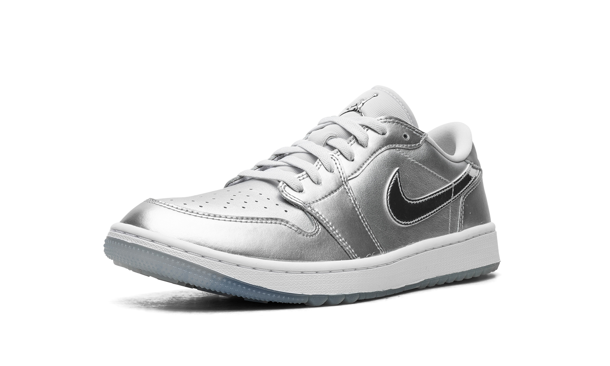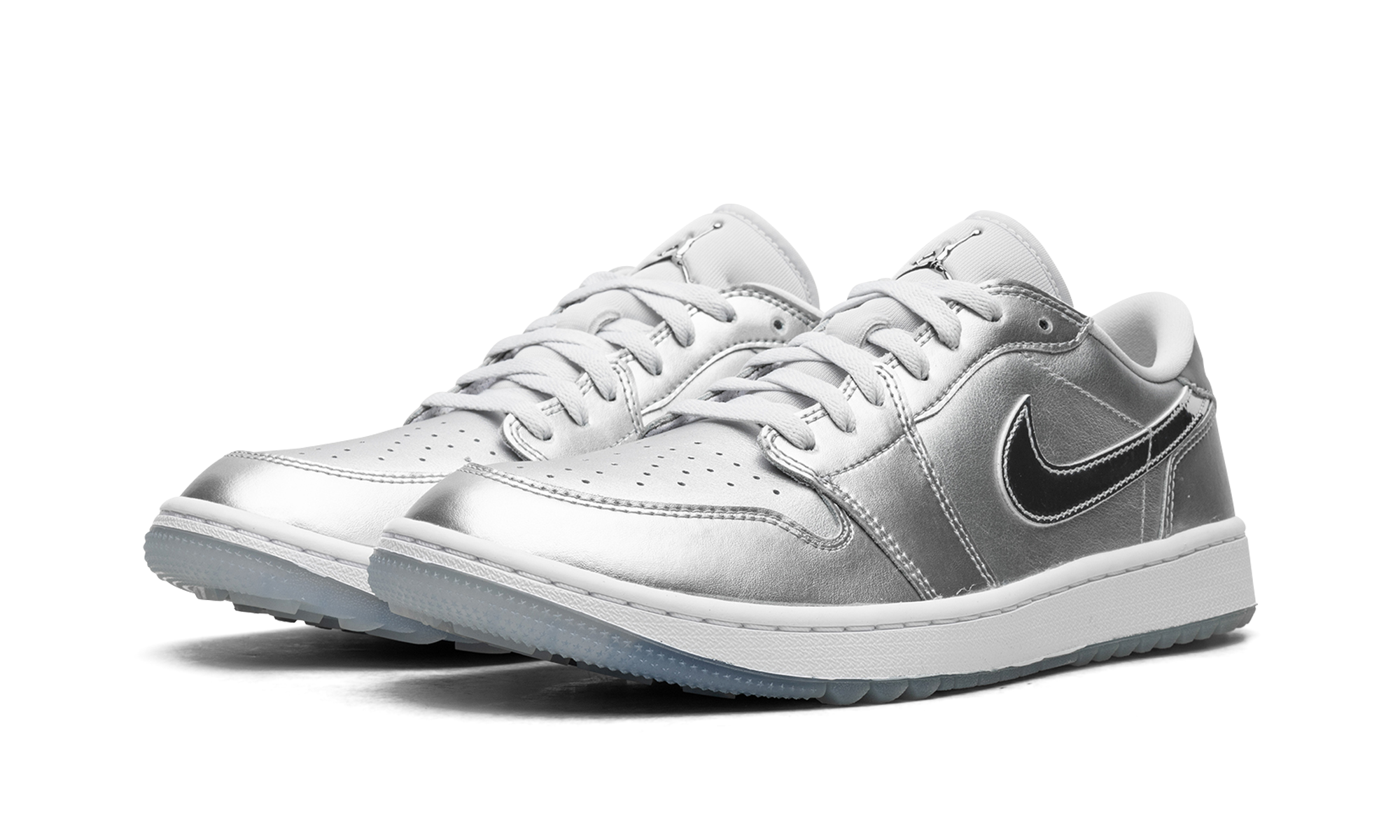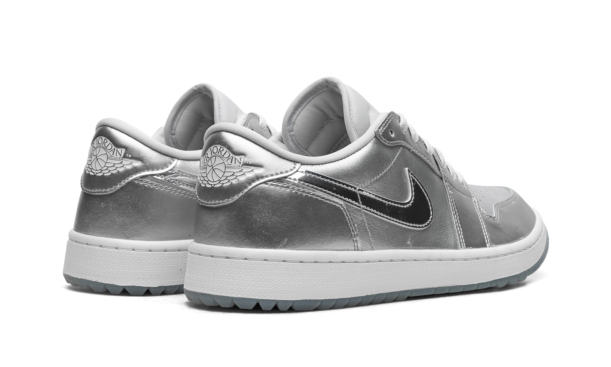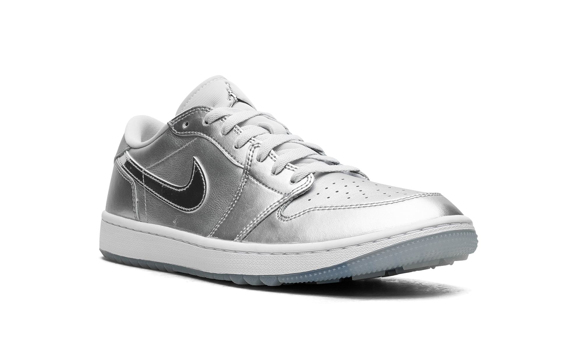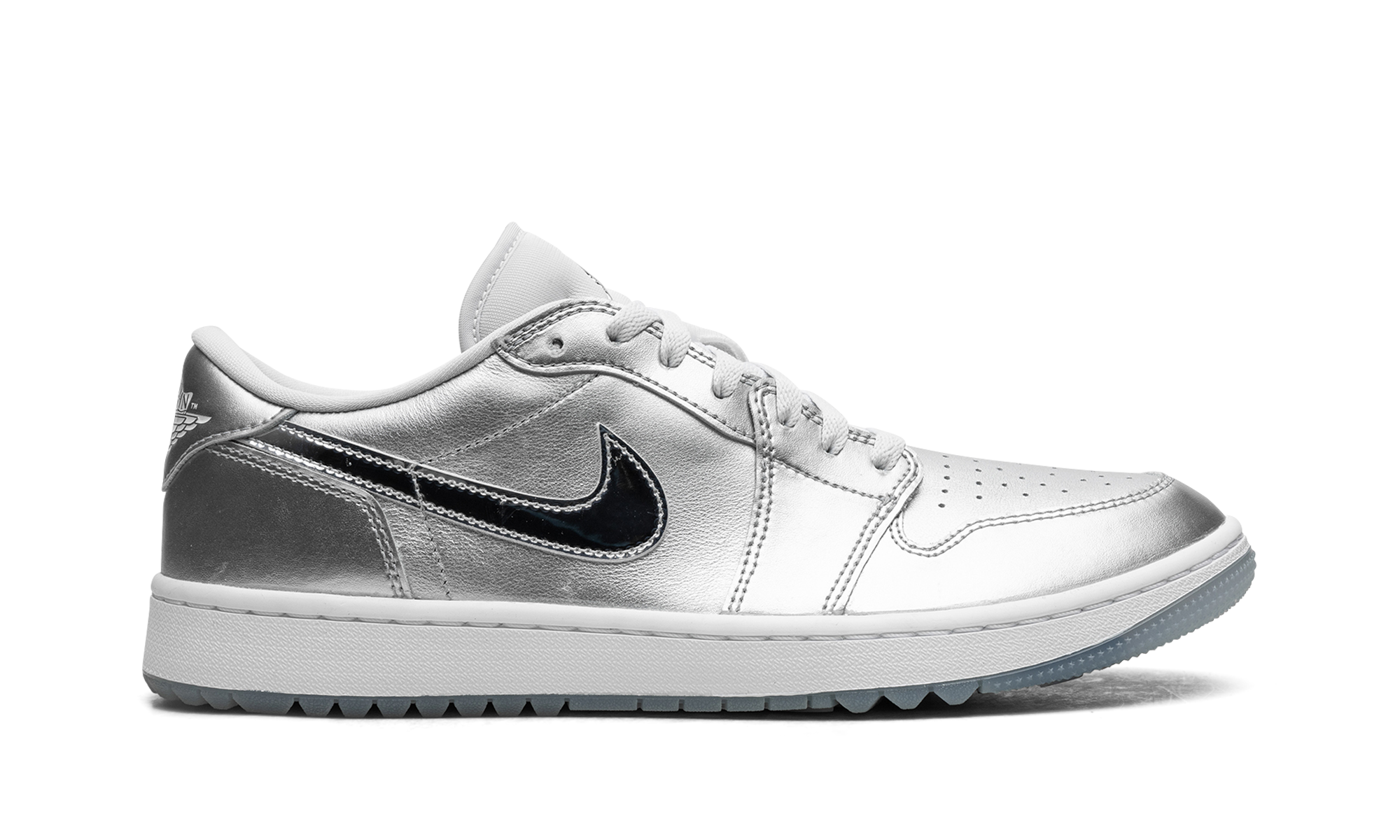 The Air Jordan 1 Low Golf “Gift Giving” is a colorway of the alternate version of the retro basketball shoe made for the golf course with an eye-catching, silver-based look. Loosely inspired by the Jordan 1’s “Tokyo” colorway that surfaced as part of Nike’s former “Concept Japan” or “Co.Jp” collection from the early 2000s, the “Gift Giving” features Metallic Silver accents throughout its design, with the flashy silver hue appearing on the base and overlays. A white leather Swoosh can be found on either side of the shoe. A “Wings” logo appears on the heel and a Metallic Silver Jumpman emblem is found on the tongue. Underfoot, a white rubber midsole and icy blue translucent outsole with small nubs completes the look. Release date: November 17, 2023
