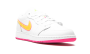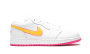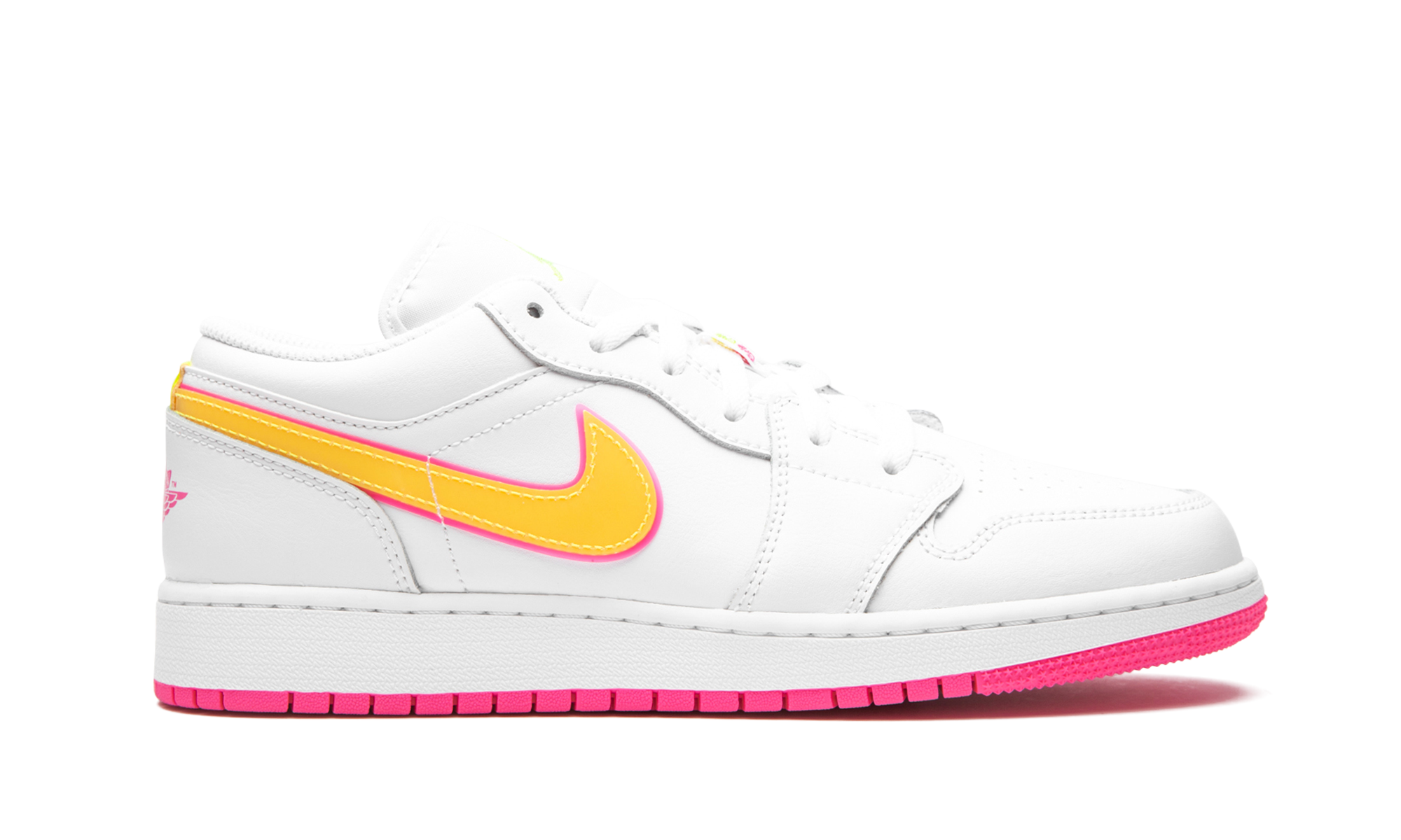 The Air Jordan 1 Low GS “Edge Glow” is the youth sizing of the summertime inspired colorway of Michael Jordan’s first signature shoe. In low-top form, the Air Jordan 1 Low is wearable, comfortable, and always in style. Those superlatives describe the “Edge Glow,” as well. The upper features smooth white leather on the mid-panel, collar, and heel. A perforated toe and tonal overlays on the forefoot, collar, and heel add additional styling to the look of the shoe. Jordan Brand places a Venom Yellow leather Swoosh with Pink Blast accenting on either side for a unique look that appeals to kids. Lime green and pink embroidered “23” detailing appears on the lace overlay and a small green Jumpman dots the white leather tongue to finish the look.