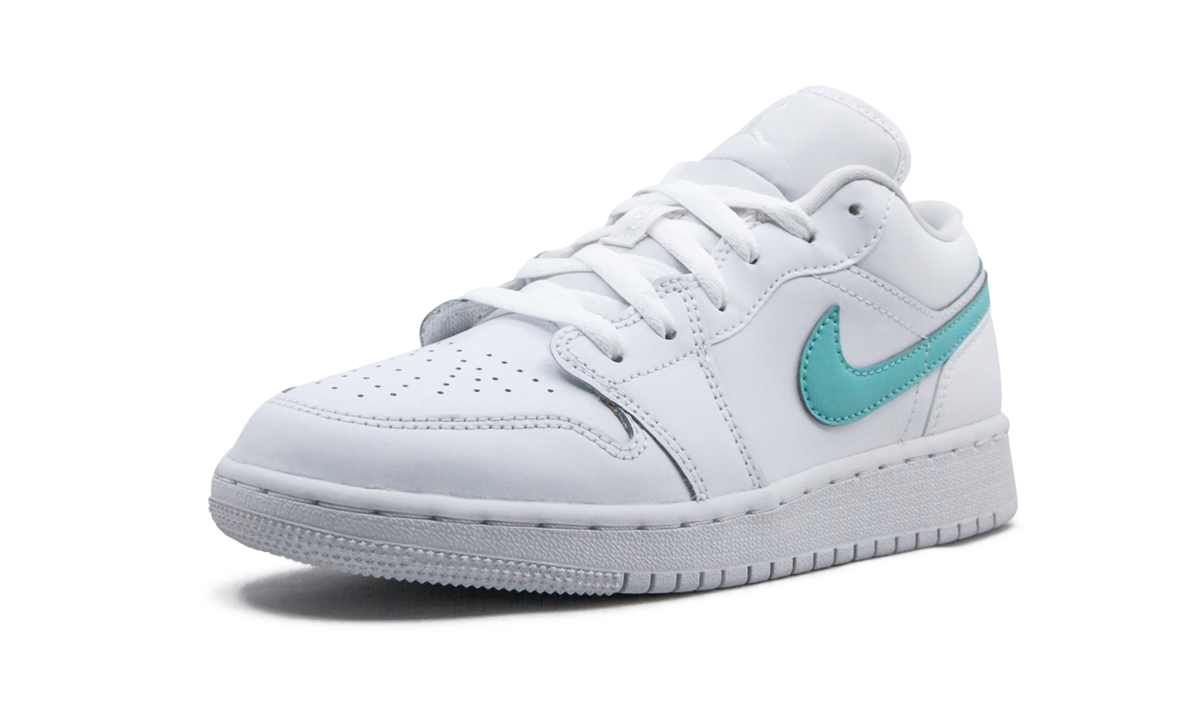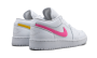 The Air Jordan 1 Low GS “Multicolor Swoosh” is the youth sizing of Michael Jordan’s first signature shoe in an appealing colorway for children. Timeless and versatile, the Jordan 1 Low is one of the most popular silhouettes under Jordan Brand’s umbrella of footwear classics. Here, the “Multicolor Swoosh” features super crisp white leather detailing on the perforated toe, mid-panel, collar, and heel. As its name suggests, this shoe displays different colored leather Swooshes. The left shoe features a Light Aqua leather Swoosh on the outside and yellow leather Swoosh hit on the medial side. The right shoe displays pink and neon green Swooshes on the outside and inside of the shoe, respectively. Tonal Jumpman embroidery can be found on the white nylon tongue. A white nylon tongue and white “Wings” branding on the heel complete the appearance of this Jordan 1 Low in youth sizing.