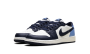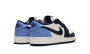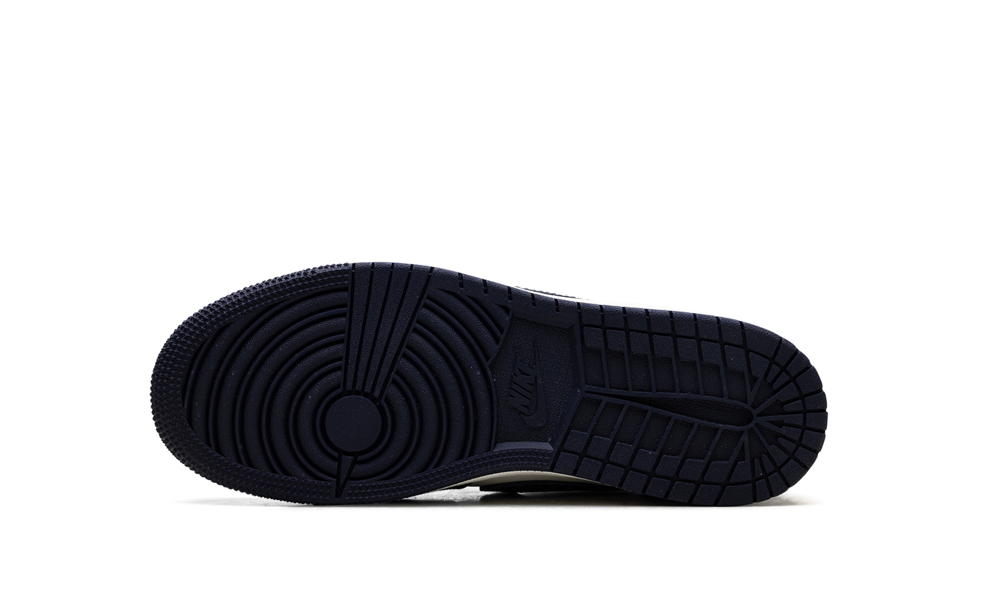 The Air Jordan 1 Low GS “Obisidian” is the grade school version of the 2025 lowtop. The kids’ AJ1 Low OG “Obisidian” has a leather upper that combines shades of navy and light blue with off-white. The lowtop Jordan 1 has a Wings logo on the heel and a navy Swoosh.