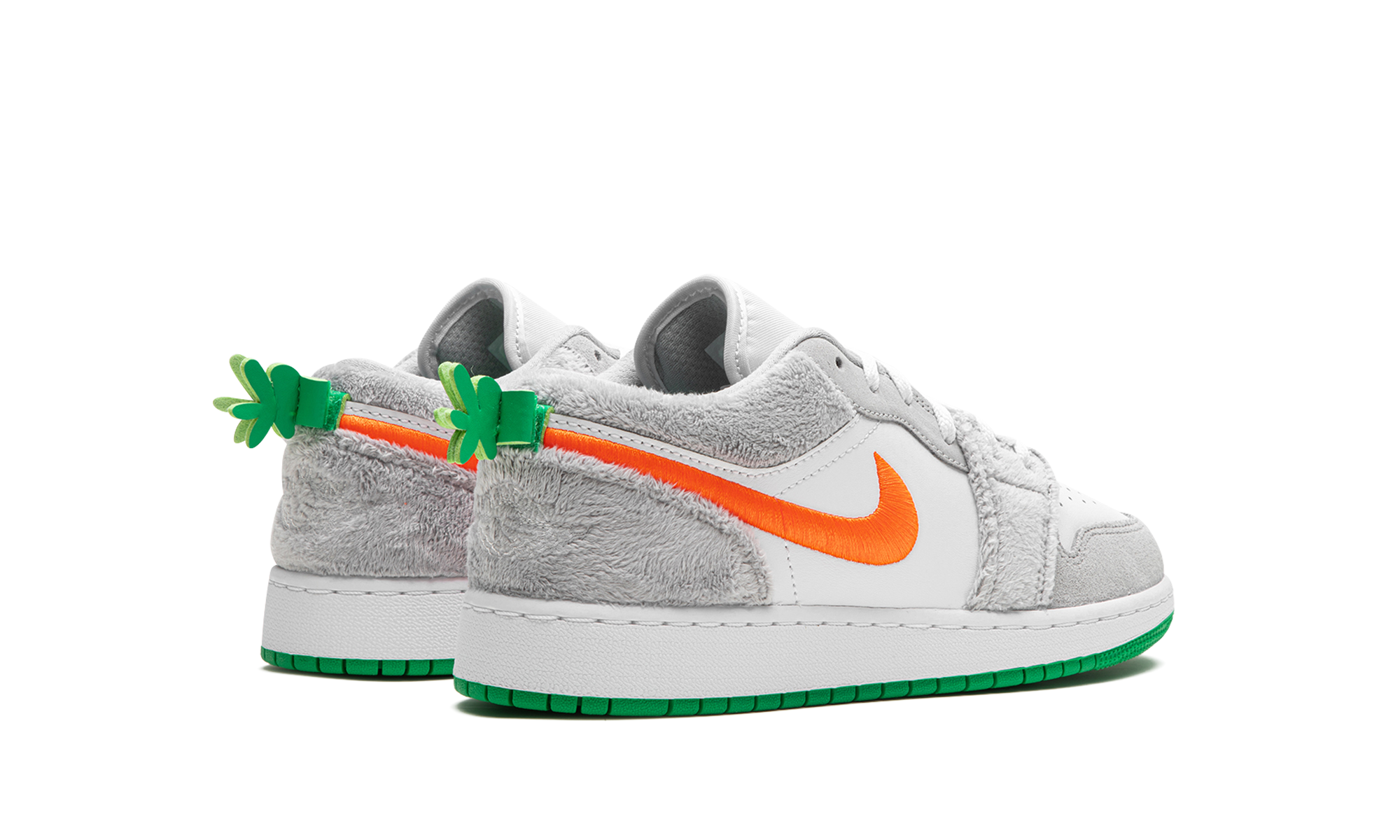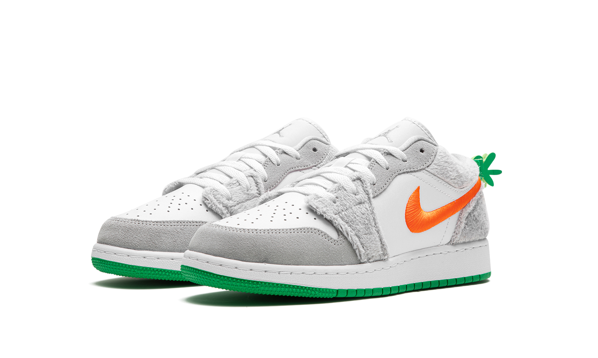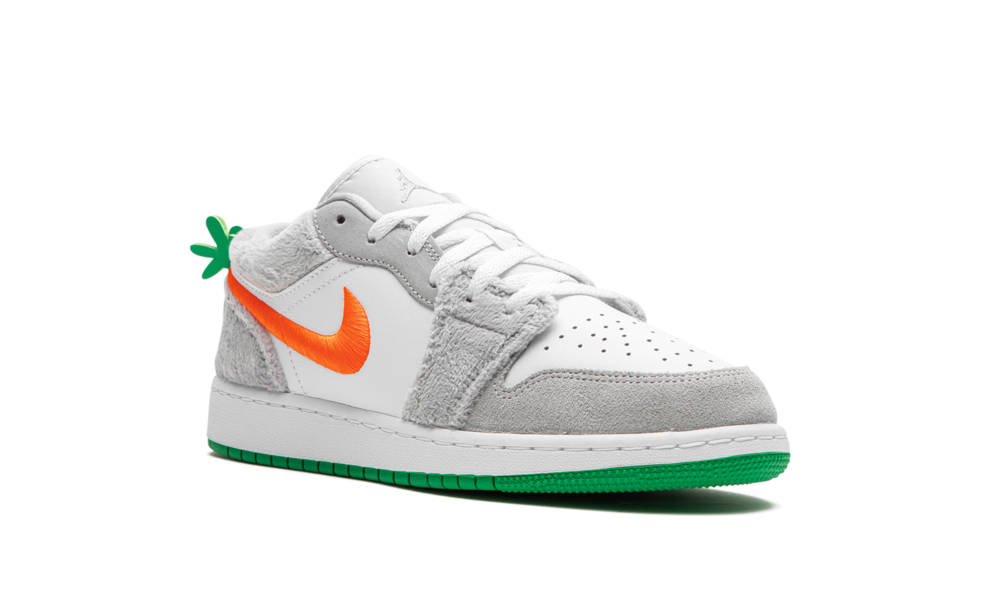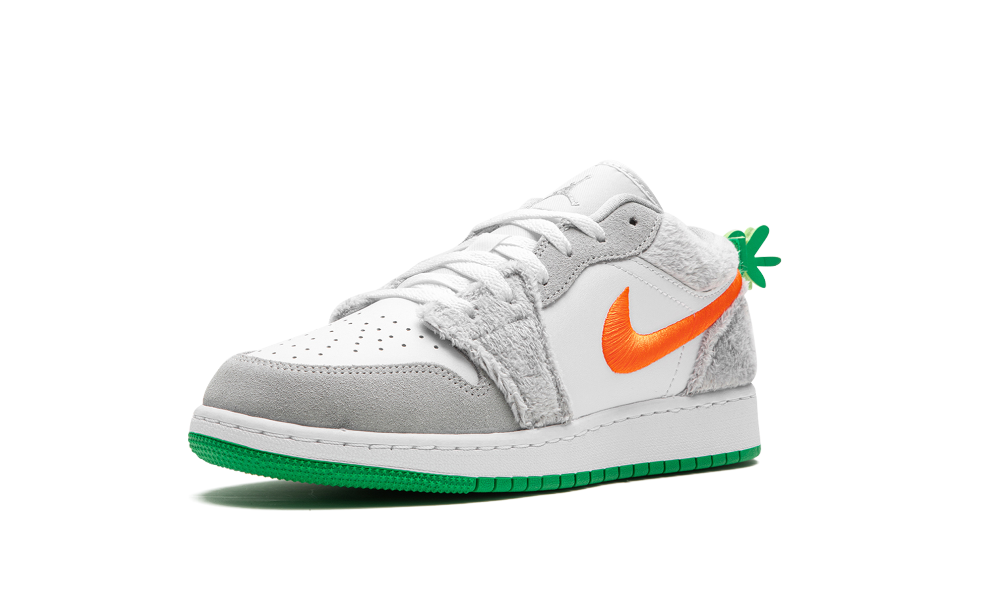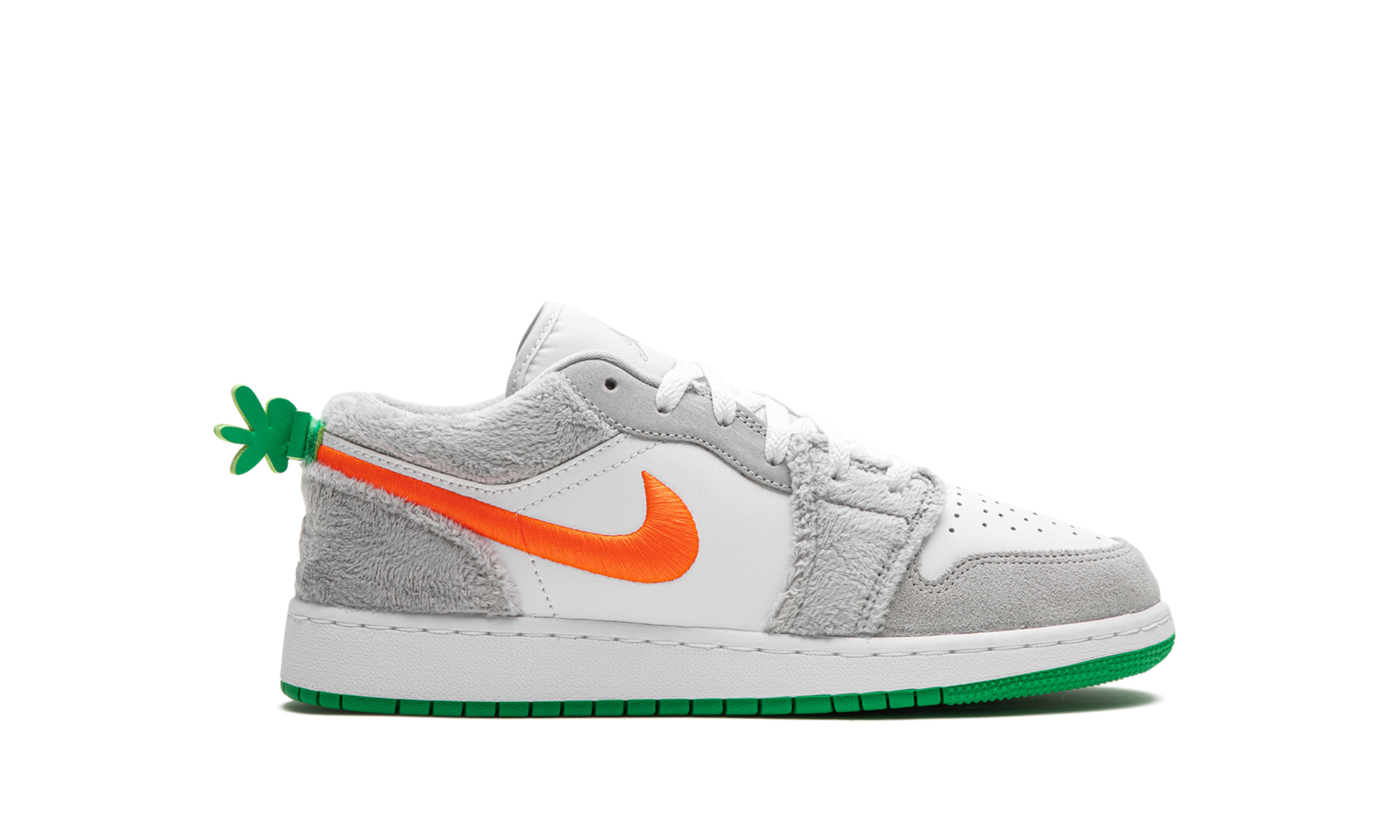 The Air Jordan 1 Low GS “Rabbit” is the youth sizing of the retro basketball shoe in a colorway inspired by Bugs Bunny. While not officially affiliated with Bugs Bunny, the “Rabbit” Jordan 1 Low nonetheless shows love to the cartoon character that famously joined Michael Jordan in the movie “Space Jam” in 1996. The shoe features a white leather base with furry grey overlays no doubt inspired by Bugs. An orange Swoosh is embroidered on the side. A green carrot stem is found on the heel. Release date: August 31, 2023