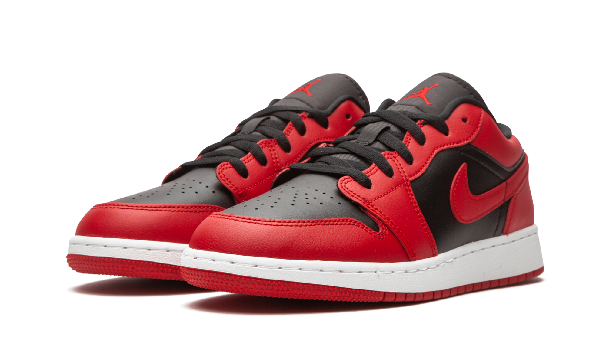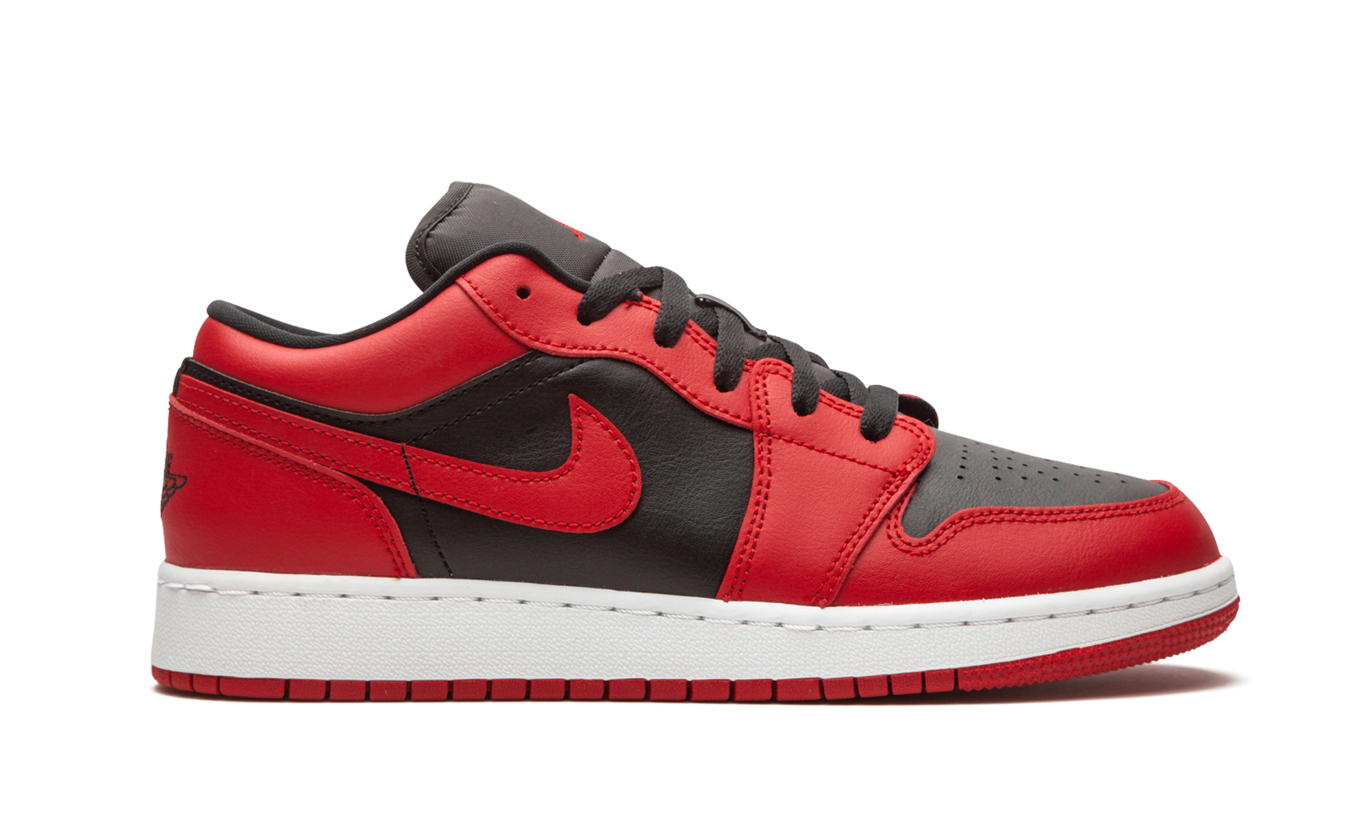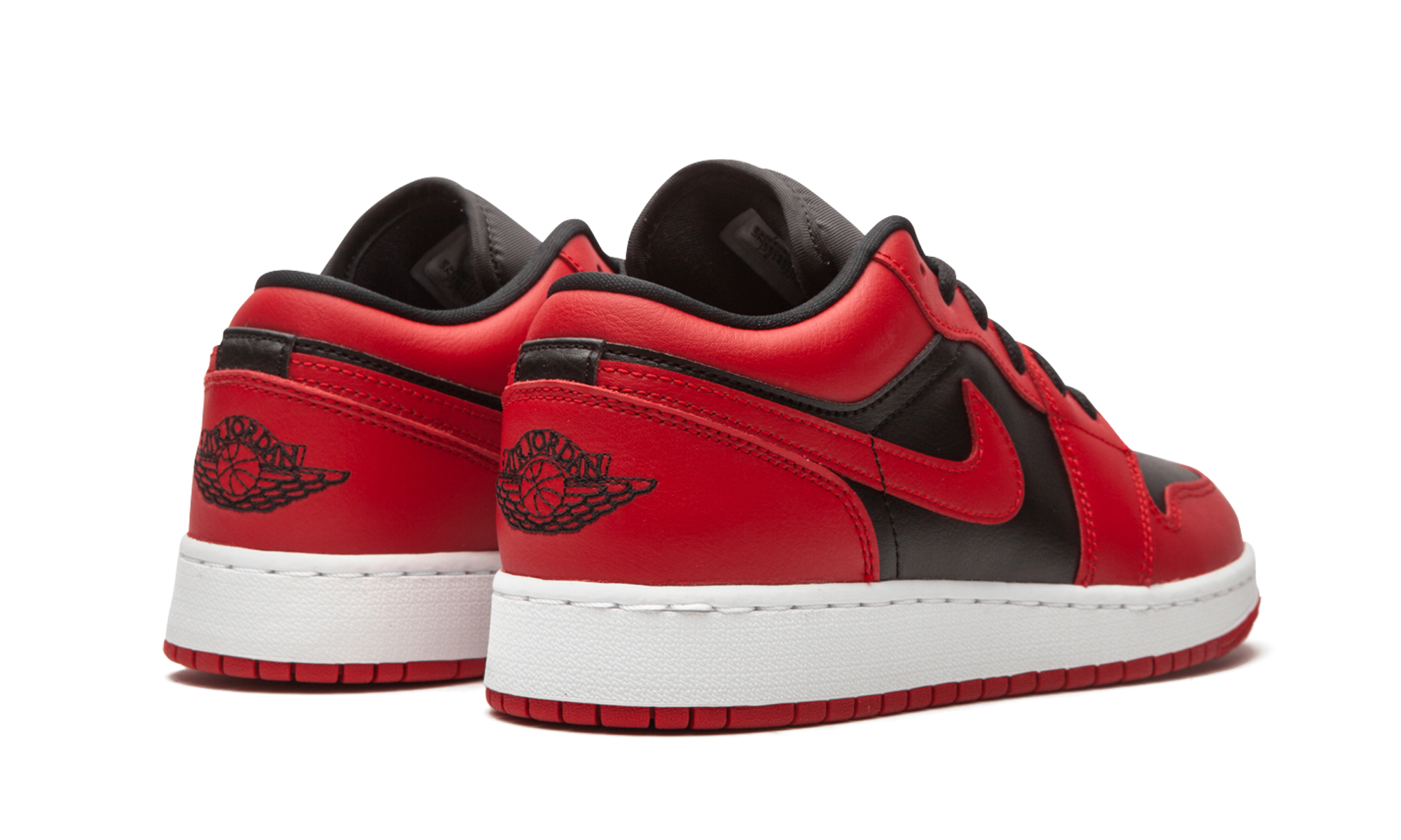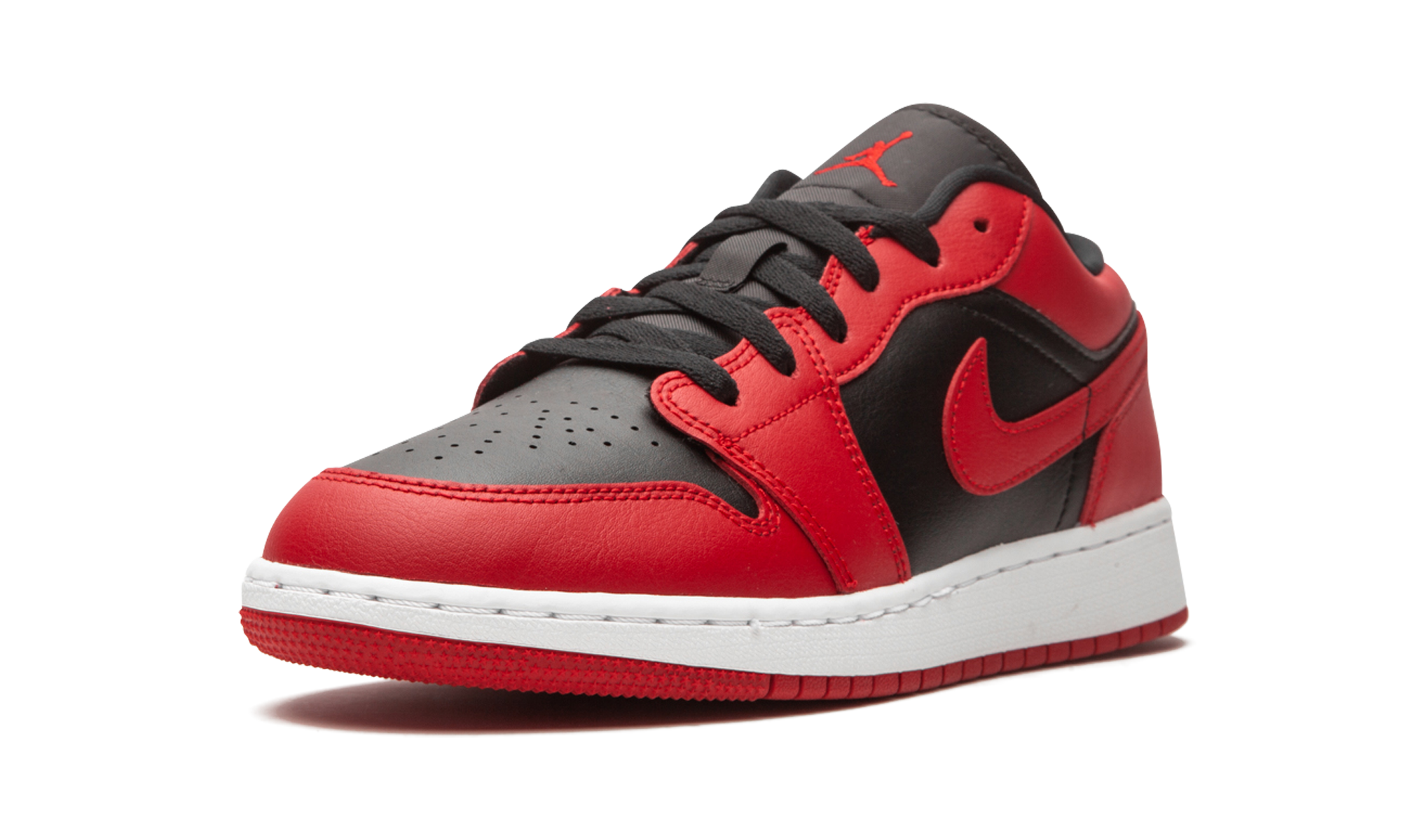 The Air Jordan 1 Low GS “Reverse Bred” is the youth sizing of Michael Jordan’s first signature shoe that flips the iconic “Bred” color block for a fresh new style. The design is reminiscent of the Jordan 1 ‘85 “Varsity Bred” in that it features red leather overlays on the forefoot and eyelets that are contrasted by a perforated black leather toe. The original “Bred” displayed black overlays and a red leather toe. As for the styling of the rest of the shoe, additional red leather detailing can be found on the collar and heel. Classic “Wings” embroidery is located on the heel. A mini red Jumpman resides on the black nylon tongue to round out the design of this Jordan 1 Low “Reverse Bred” fitted in youth sizing.