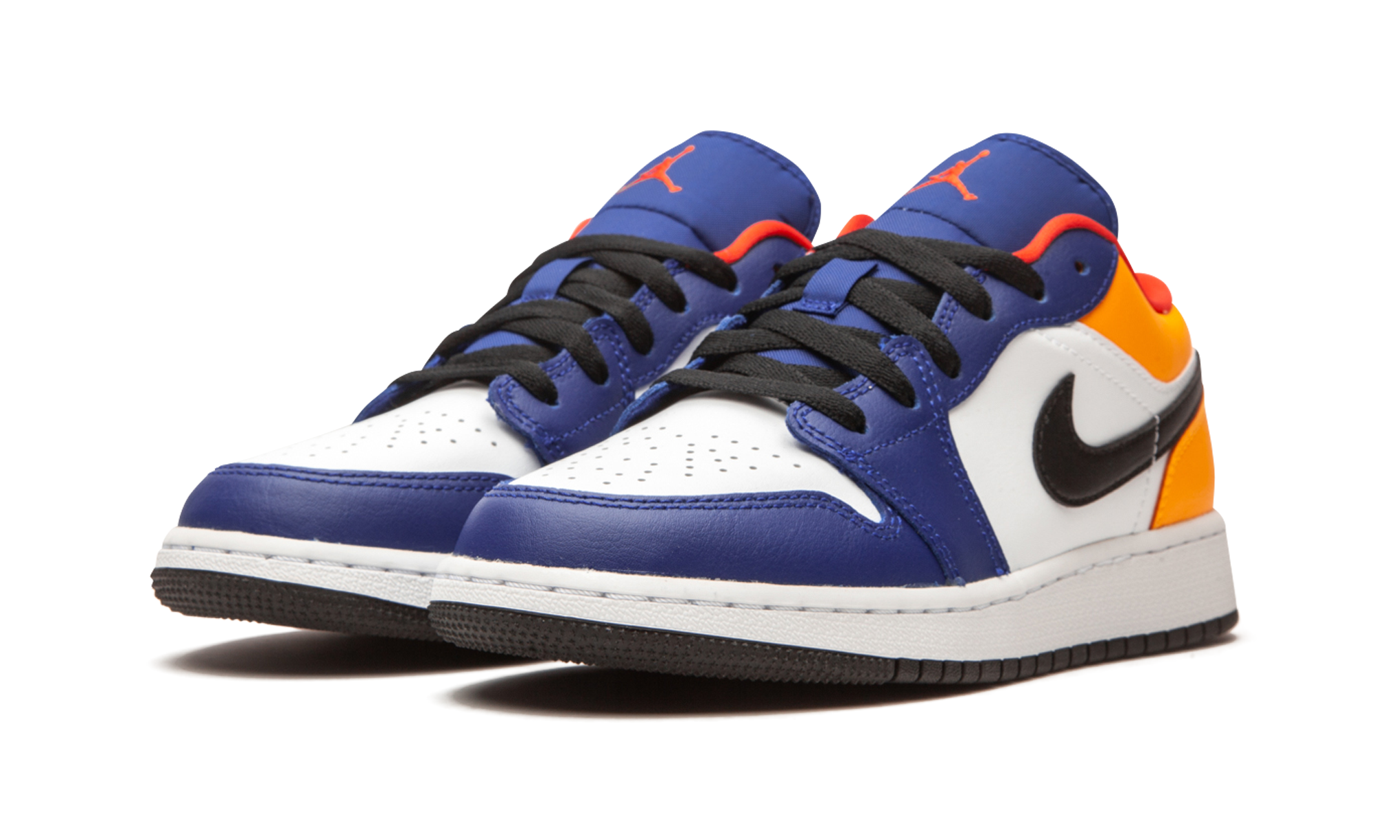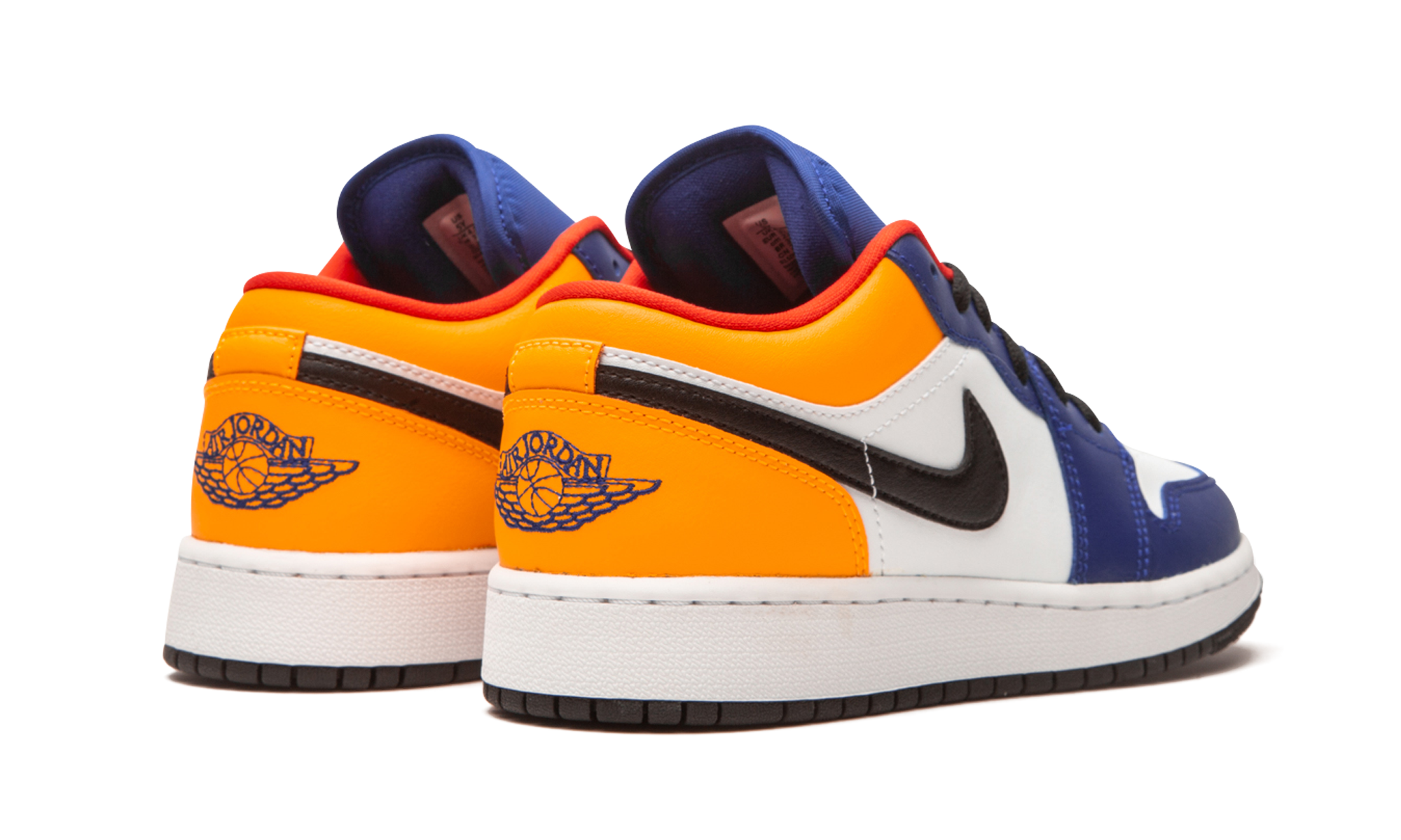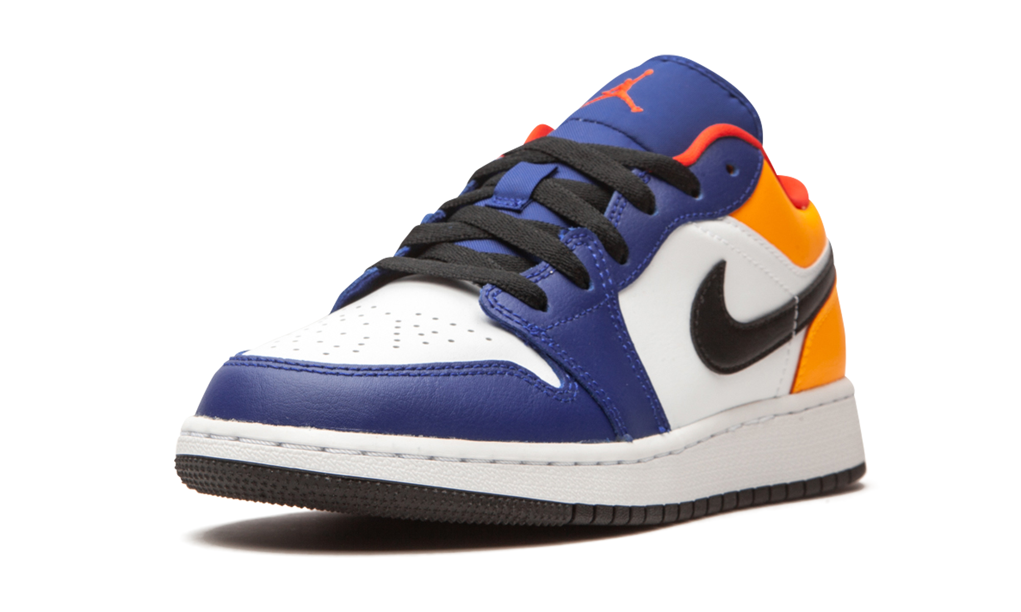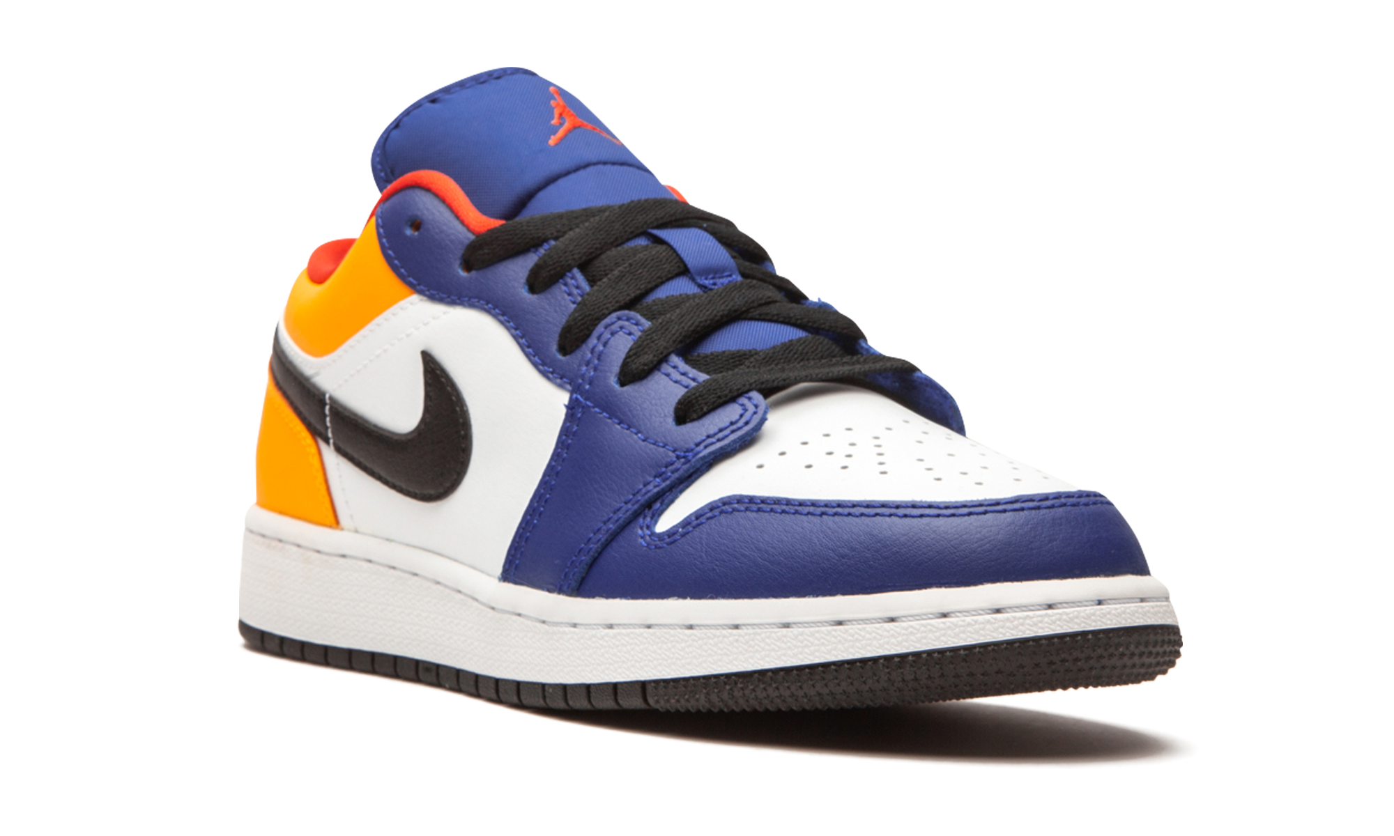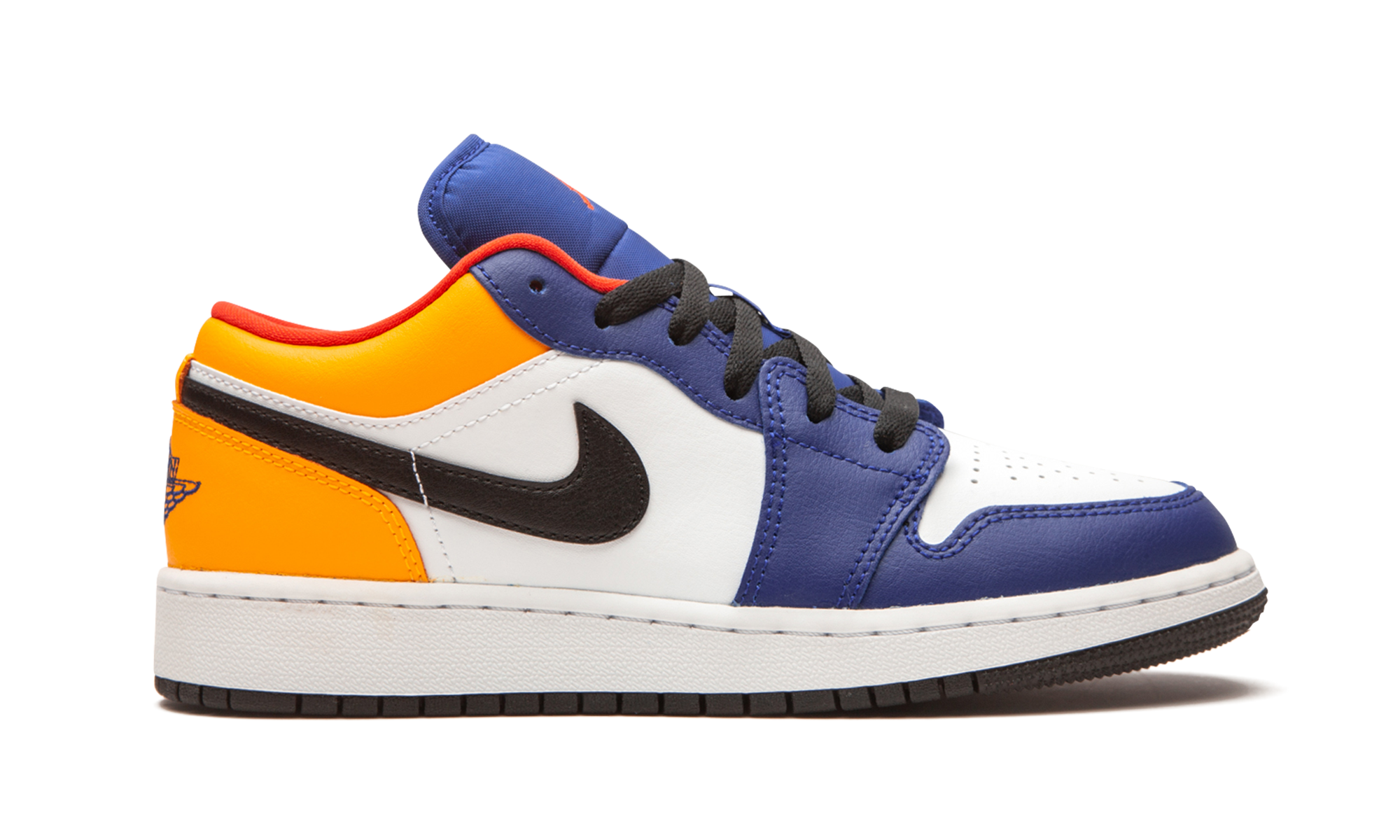 The Air Jordan 1 Low GS “Royal/Yellow” is a multicolor take on Michael Jordan’s first signature shoe fitted in youth sizing. Appearing on the alternate low-top Jordan 1, the “Royal/Yellow” design is the kind of bold shoe that kids enjoy wearing. The upper features white leather on the perforated toe and mid-panel. Royal leather overlays on the forefoot and eyelets break up the neutral appearance. Jordan Brand opts for yellow leather around the collar and heel. A black leather Swoosh dots the mid-panel, and blue “Wings” embroidery is sewn onto the heel. Red Jumpman insignia is located on the blue nylon tongue. Black shoelaces, a red liner, and white midsole finish off the look of this Air Jordan 1 Low in youth sizing.