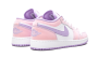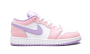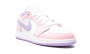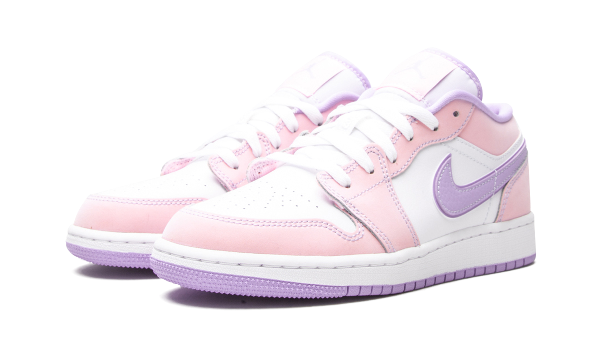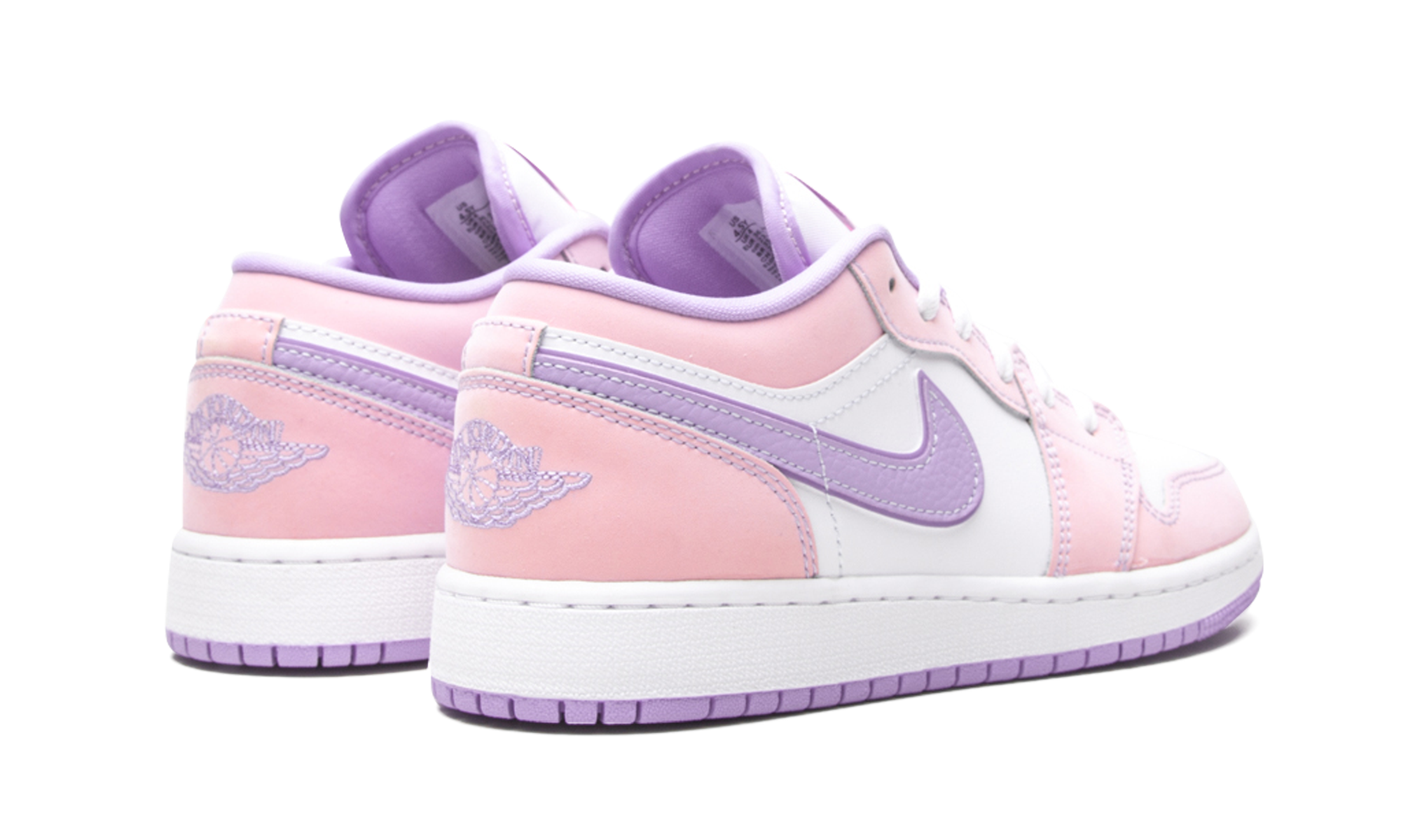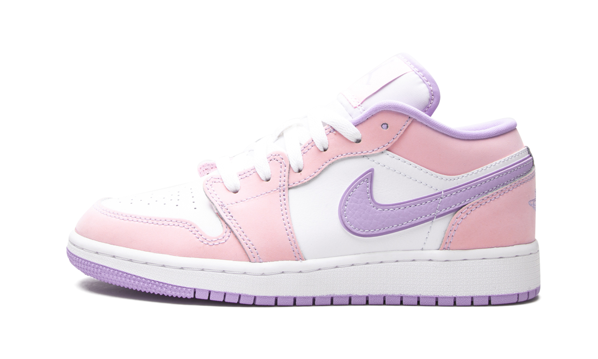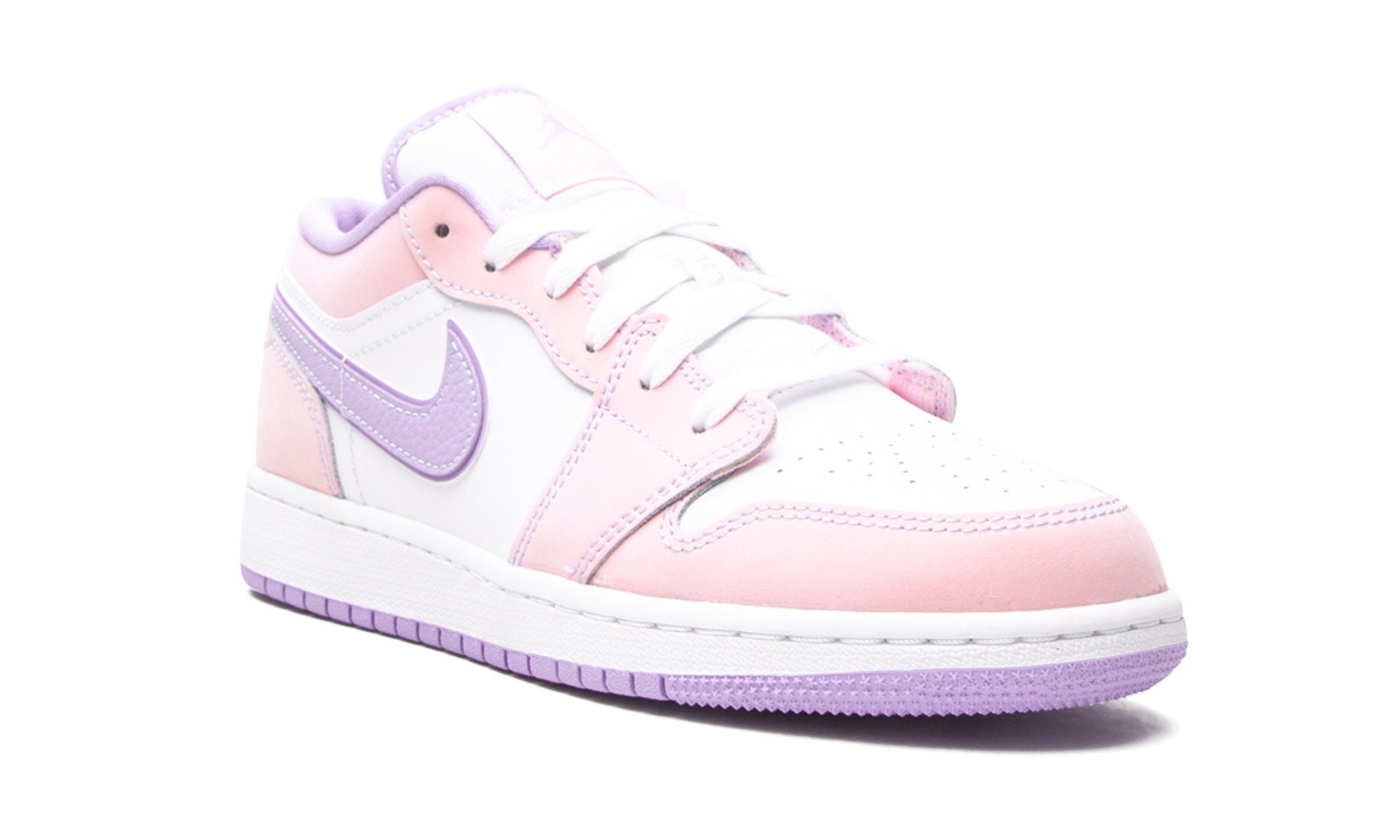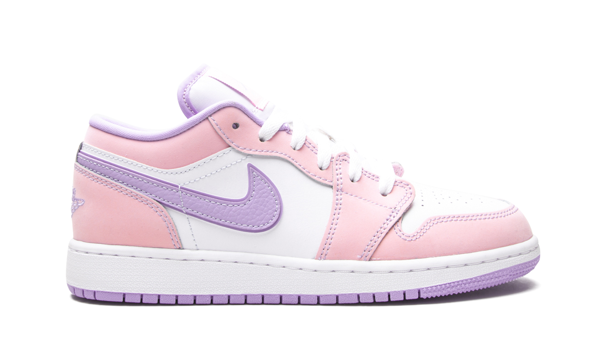 The Air Jordan 1 Low SE GS “Arctic Punch” is a youth version of Michael Jordan’s first signature shoe dressed in a warm weather inspired colorway. Released near the Easter holiday in 2021, the “Arctic Punch” is a decidedly springtime-ready look for the popular low-top edition of the Jordan 1. White leather forms the base of the shoe. A calming pastel pinkish hue of leather can be found on the forefoot, eyelets, collar, and heel, contrasting with the aforementioned neutral colored base. A violet leather Swoosh and violet embroidered “Wings” logo on the heel provide retro branding cues. A white Jumpman logo can be found on the branding tag stitched onto the top of the white nylon tongue. Jordan Brand finishes off the look with a white midsole and purple outsole.