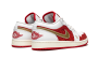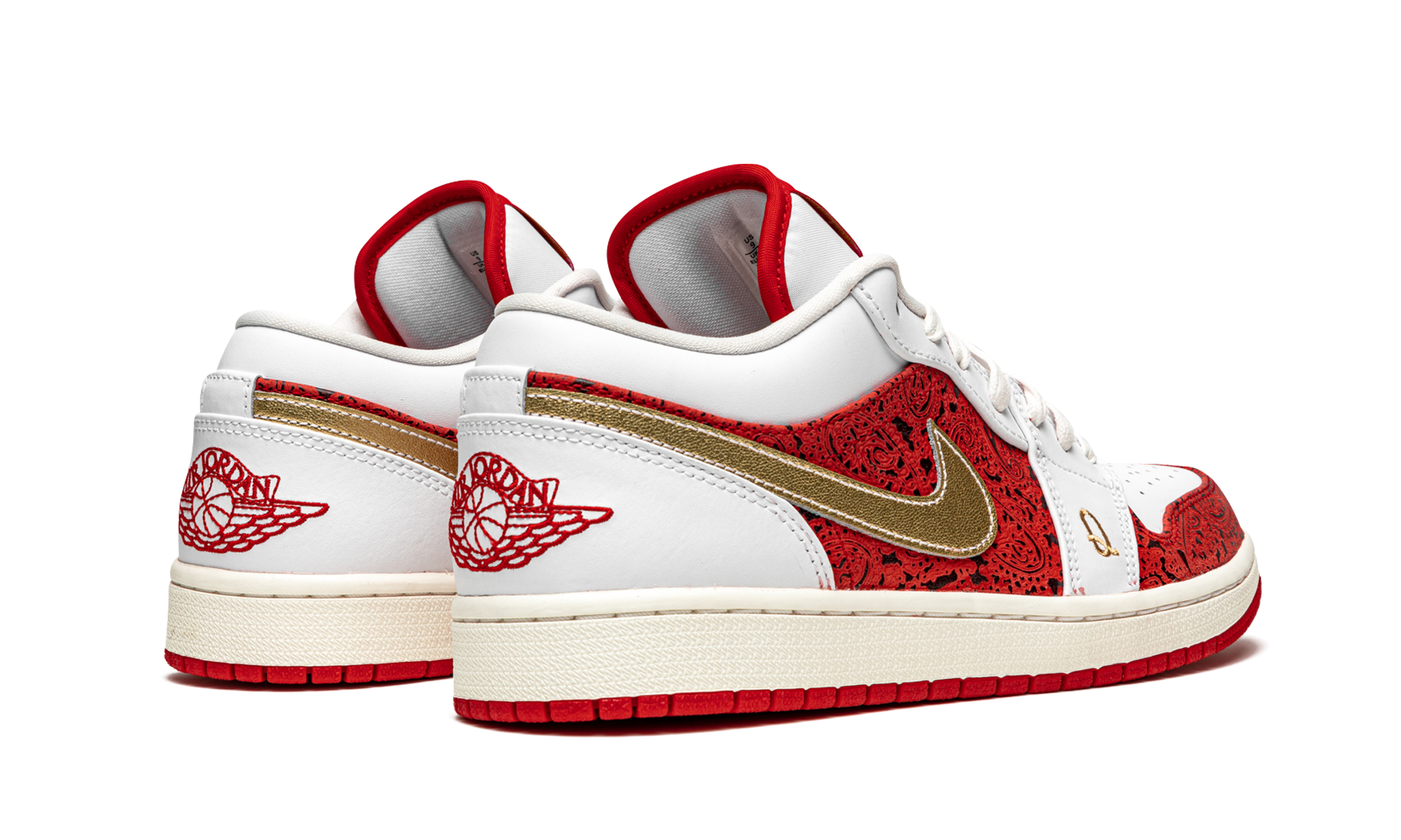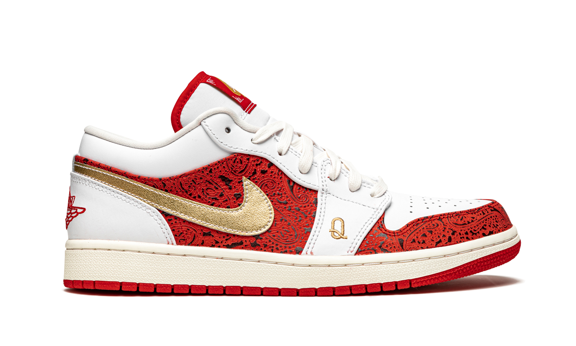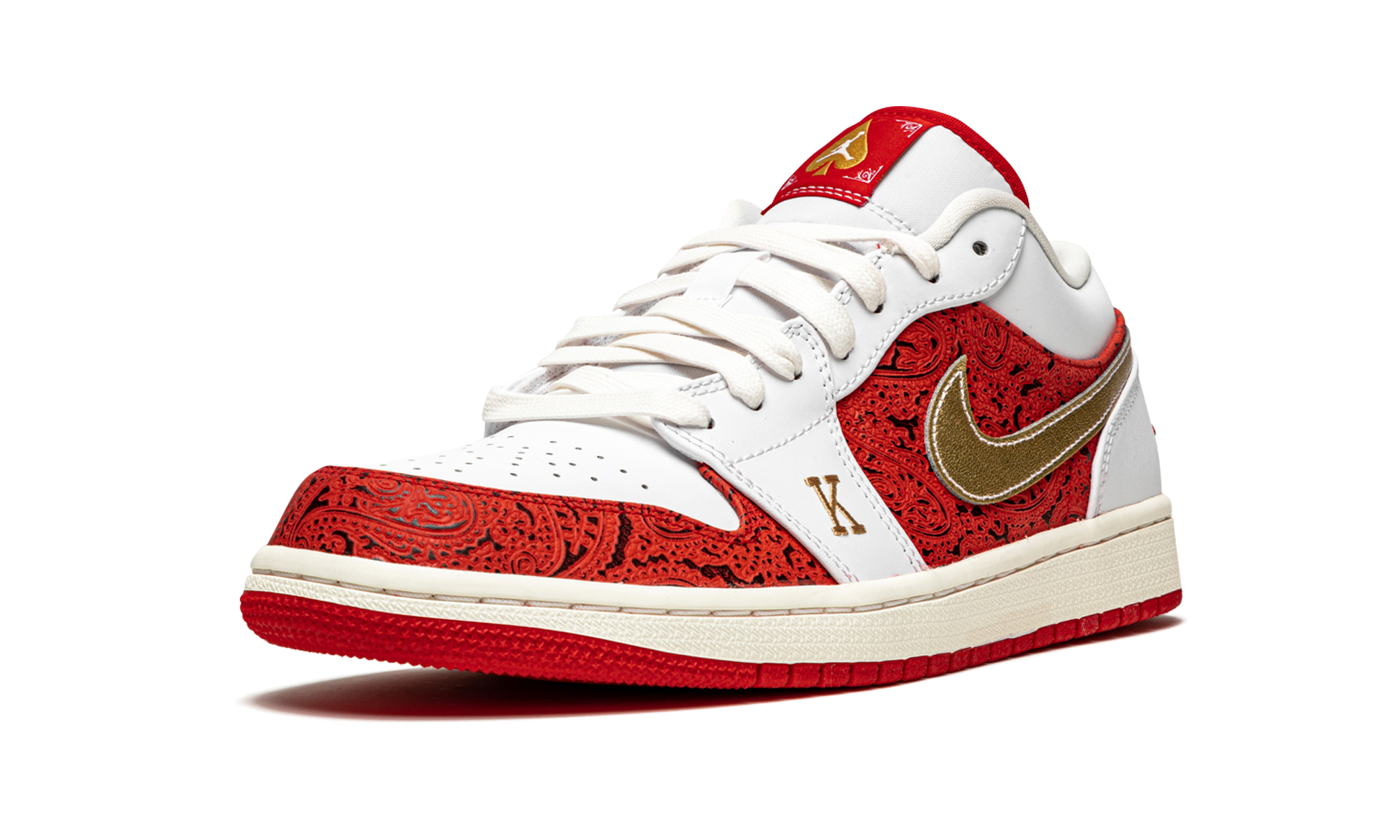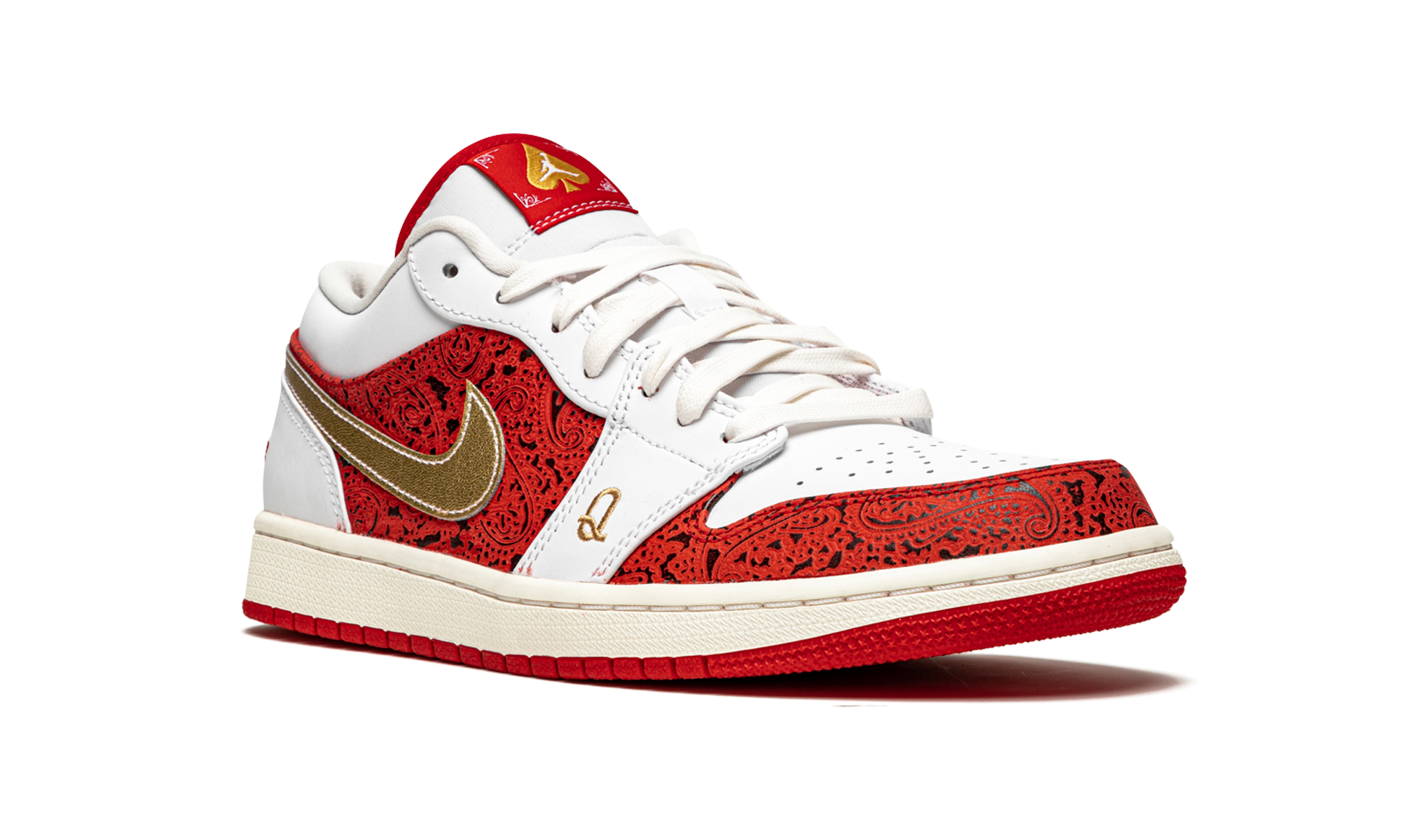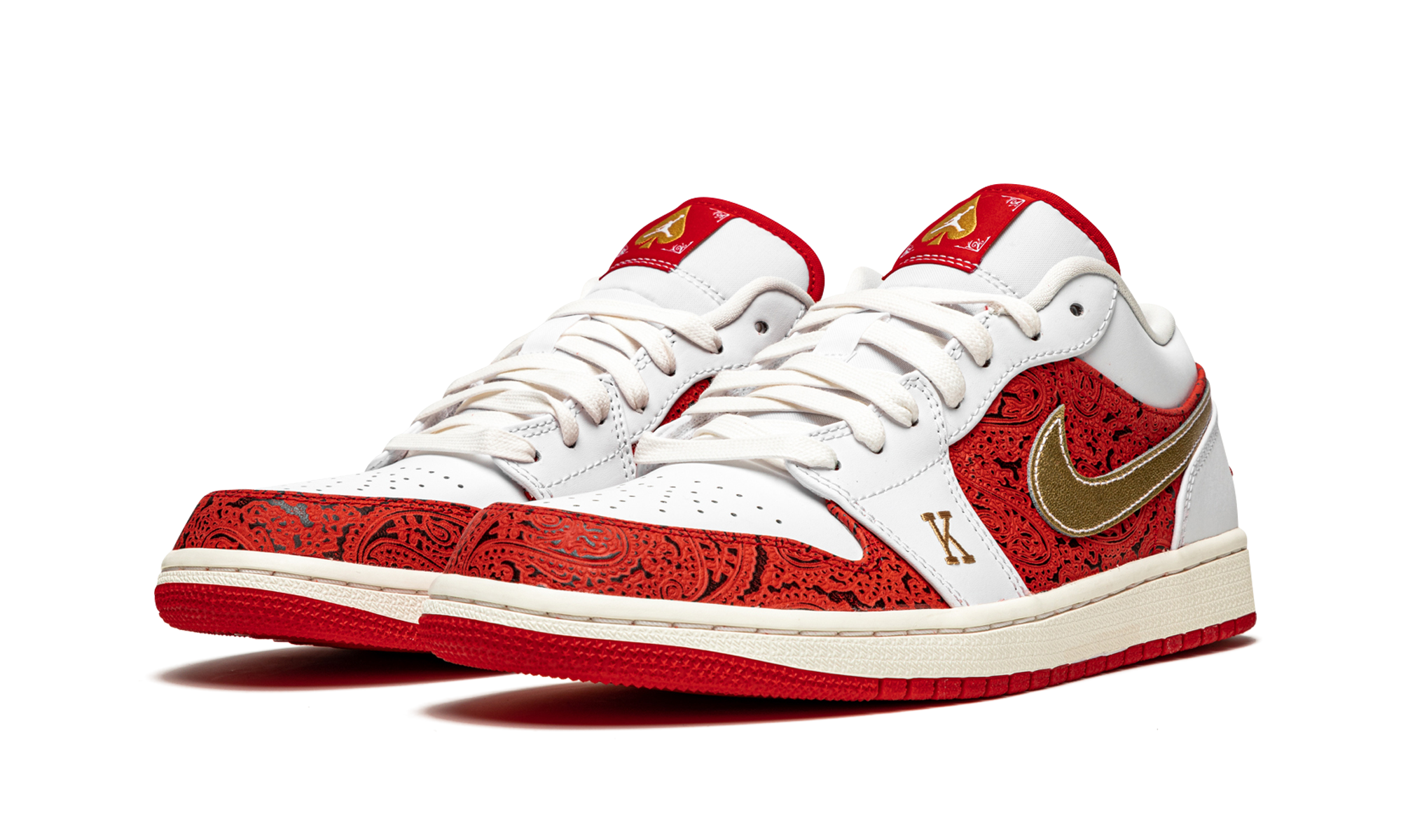 The Air Jordan 1 Low SE “Spades” is a unique colorway of Michael Jordan’s first signature shoe inspired by playing cards. Constructed on the always-in-style low-top Jordan 1, the “Spades” exudes a luxury influence with lavish red-and-black leather detailing inspired by the background of a playing card on the toe cap and mid-panel. Jordan Brand goes as far as to embroider a gold “K” and “Q” on the white leather forefoot overlay on the left and right shoe, respectively. The letters represent the king and queen cards found in a deck of cards. Moreover, a gold spade graphic resides on the red tongue tag on the white leather tongue. Metallic gold leather Swooshes on either side combine with a red embroidered “Wings” logo on the heel to give the Air Jordan 1 Low SE “Spades” a classic, retro-inspired look. Release date: May 27, 2021.