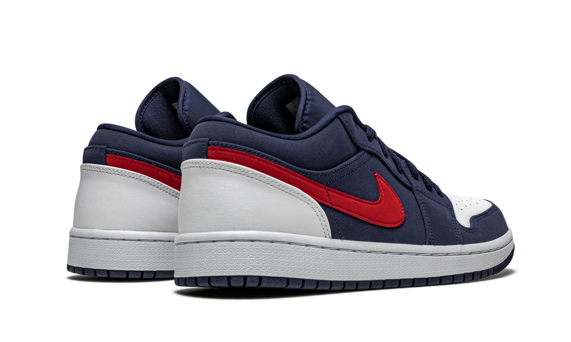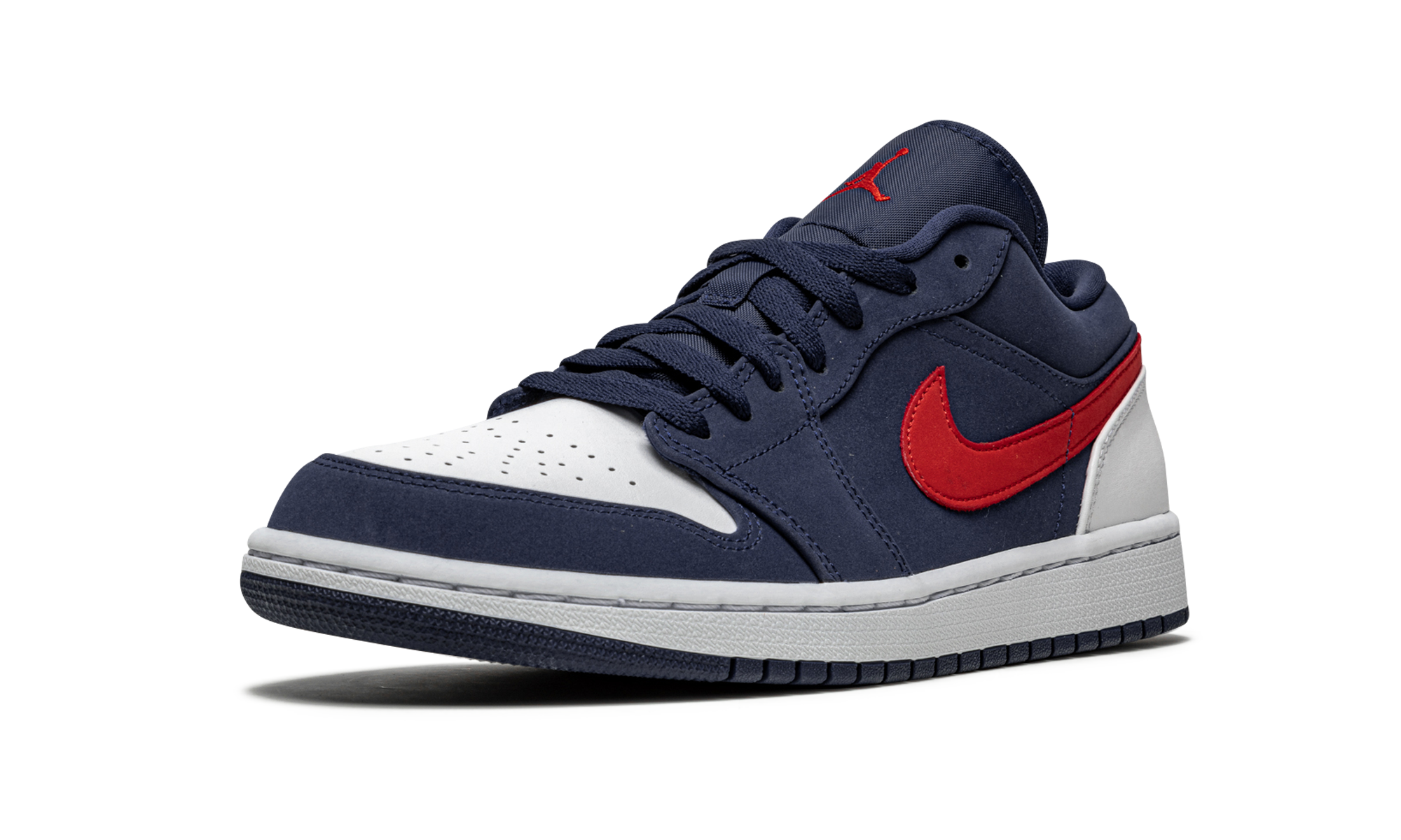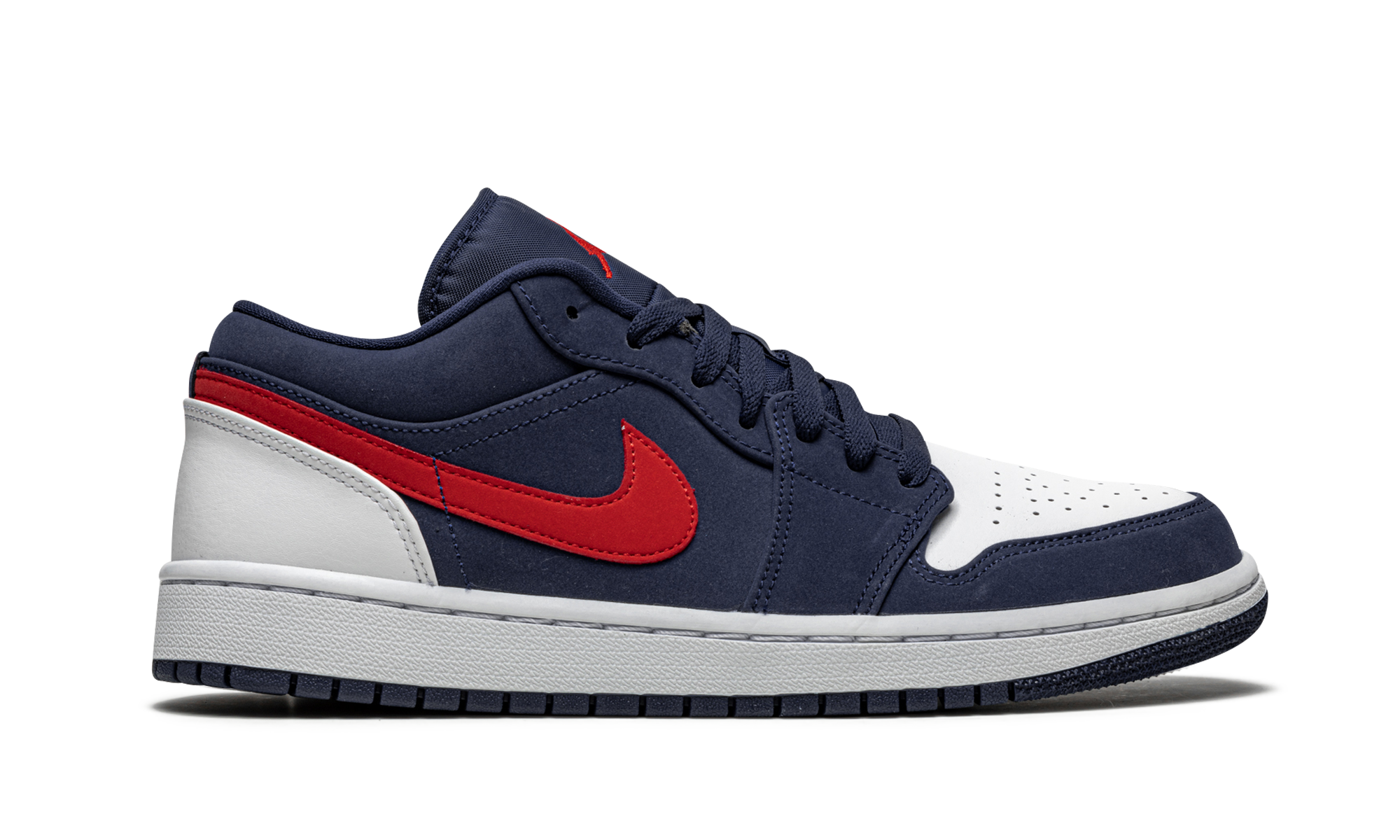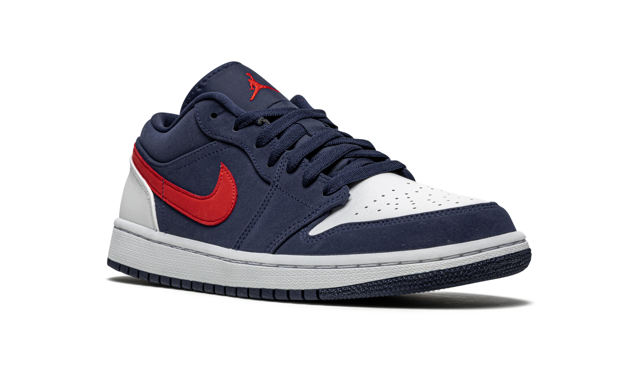 The Air Jordan 1 Low SE “USA” is a patriotic colorway of Michael Jordan’s first signature shoe in the popular low-top style. Jordan Brand’s dedication to elevating the Jordan 1 Low into the upper echelons of sneaker culture has seen the brand use the model in collaborations with Dior and Travis Scott since 2019. Here, the “USA” adds to the impressive assortment of Jordan 1 Lows by featuring the red, white, and blue color scheme of the American flag. A Midnight Navy suede material appears on the forefoot, mid-panel, collar, and eyelets. The University Red leather Swoosh logo on either side of the shoe breaks up the look. White leather can be found on the perforated toe and on the heel. A red embroidered Jumpman is stitched onto the navy blue nylon tongue. Finishing touches include a white rubber midsole and Midnight Navy outsole.