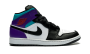 The Air Jordan 1 Mid “Aqua” is a colorway of the casual shoe with a ‘90s-inspired color scheme. In no way associated with the Charlotte Hornets, the “Aqua” Jordan 1 Mid nonetheless features the basketball team’s uniform colors from the ‘90s on its design, which gives the shoe a decidedly retro flair. The upper has white leather on the perforated toe and mid-panel, and Court Purple leather on the collar and heel. The collar underlay is designed in an Aqua hue, while the Swoosh appears in black leather. A red “Wings” logo is seen on the collar, and red Jumpman and orange “Air” detailing appear on the tongue tag. Underfoot, a white rubber midsole and black rubber outsole complete the look.