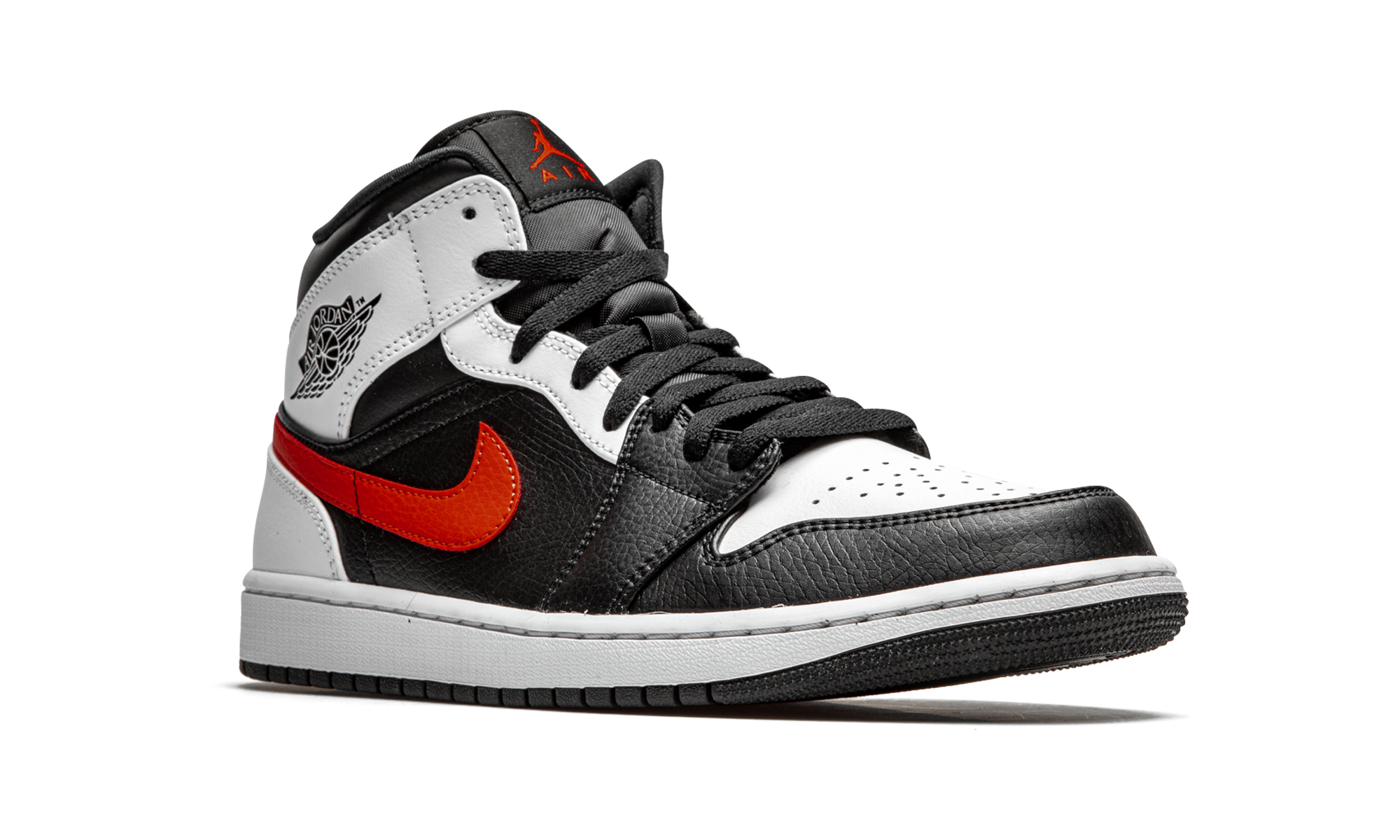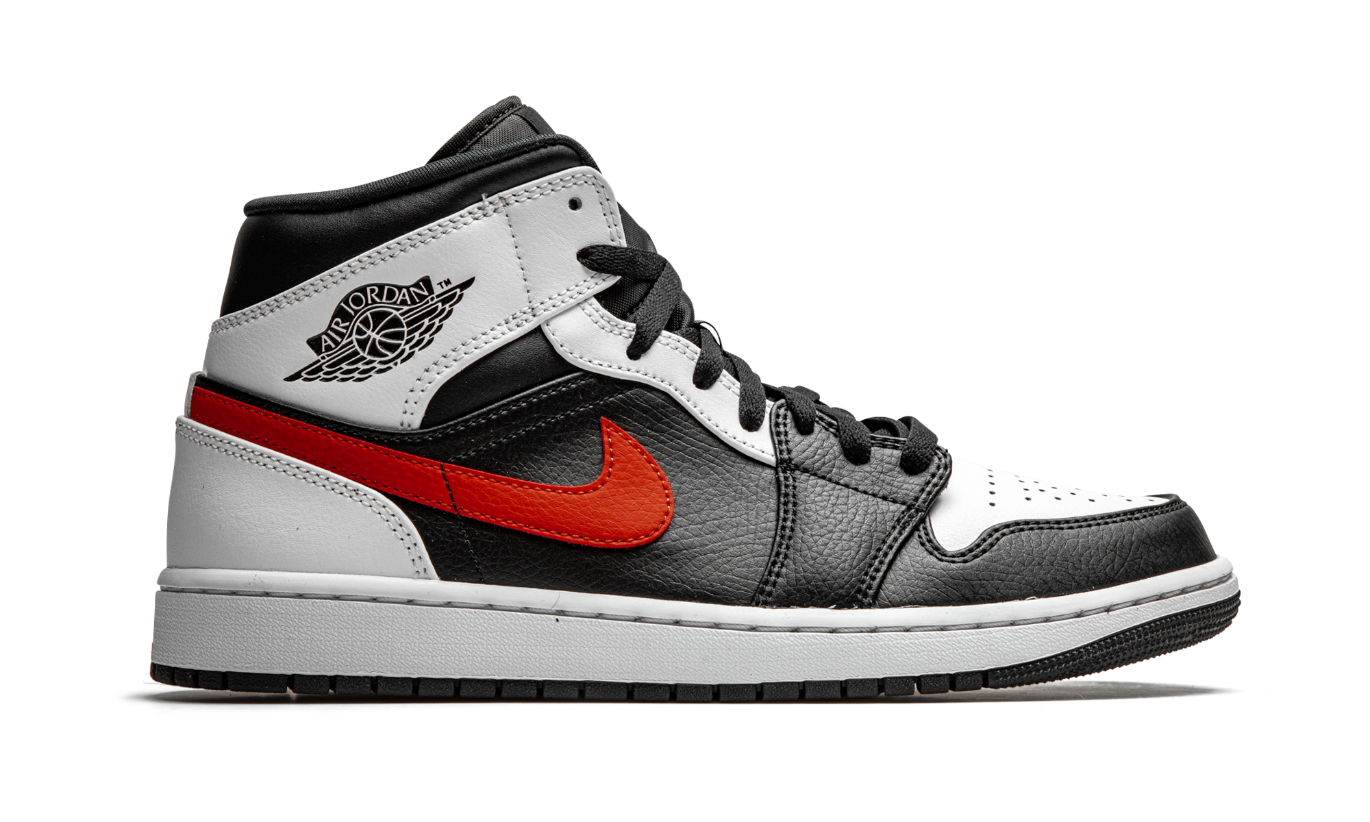 The Air Jordan 1 Mid “Chile Red” is a Chicago Bulls inspired look for Michael Jordan’s first signature shoe in its mid-top silhouette. The Bulls’ red, black, and white team uniform colors are proudly on display on the “Chile Red,” though the aforementioned shade of red is slightly darker than the hue associated with the NBA team. Nonetheless, the arrangement of colors make for yet another versatile Jordan 1 Mid. Black tumbled leather overlays contrast the matte white leather construction of the perforated toe and the upper eyestay, collar, and heel. A Chile Red leather Swoosh appears on either side and a black “Wings” graphic can be found on the collar. Additional branding appears in the form of a red Jumpman on the nylon tongue tag.