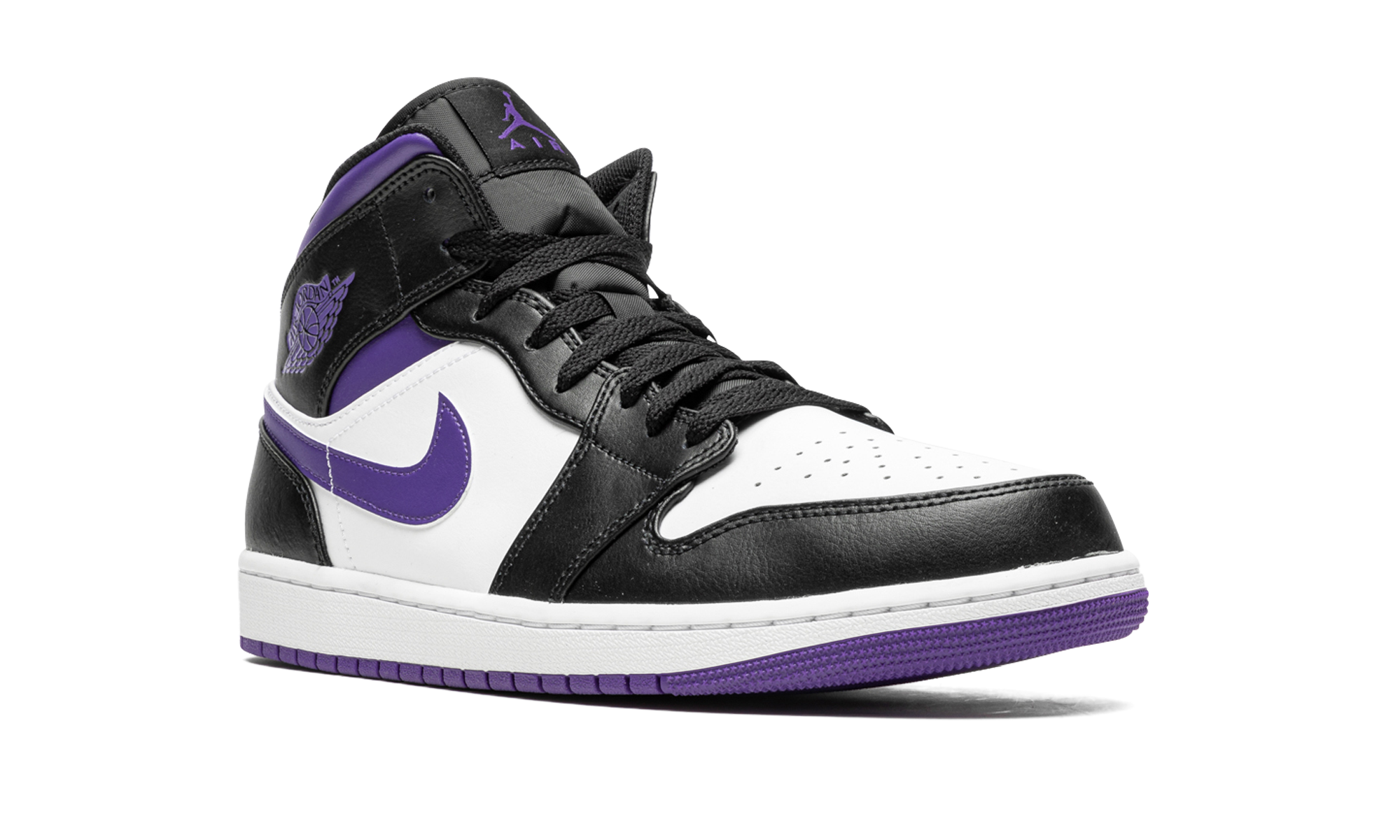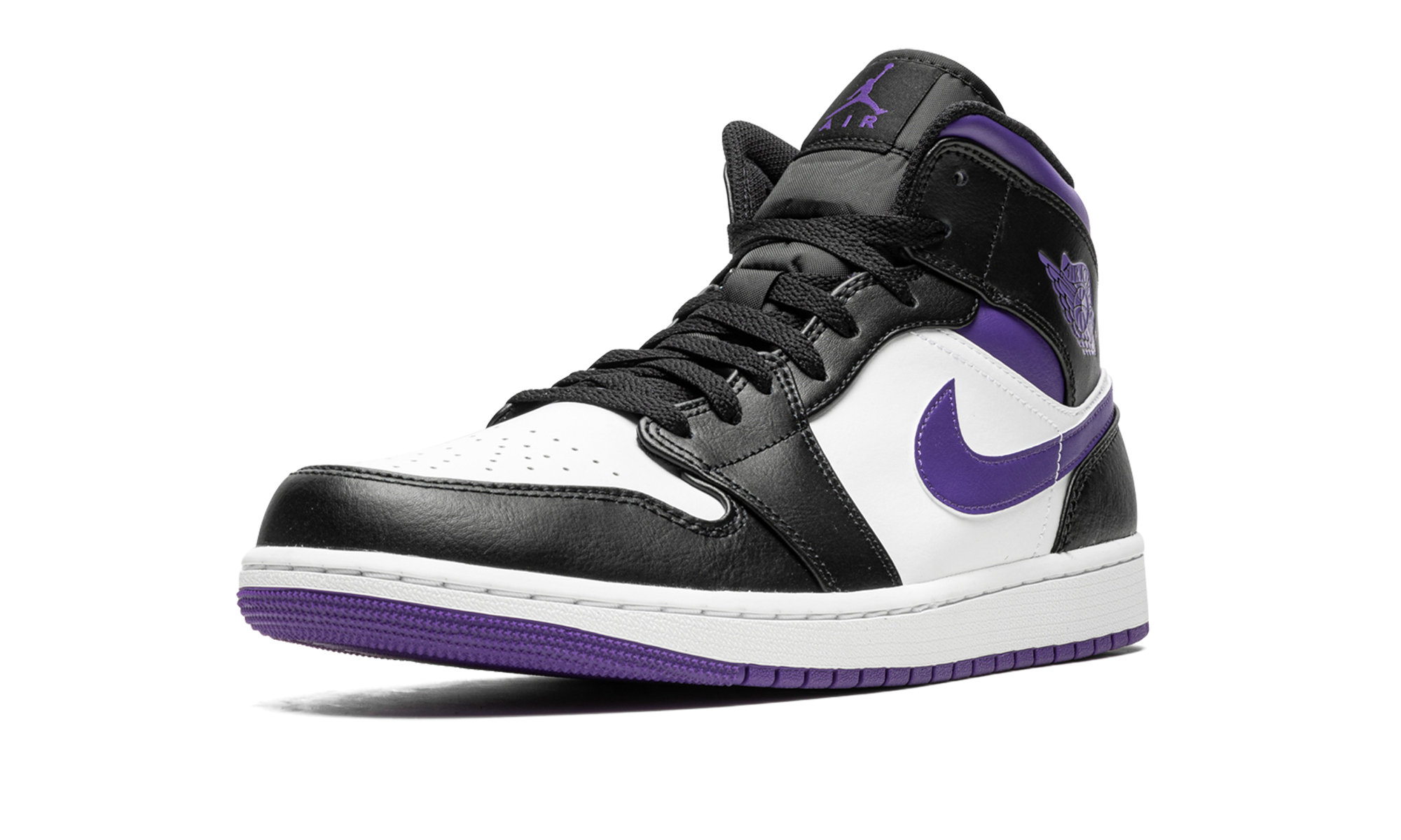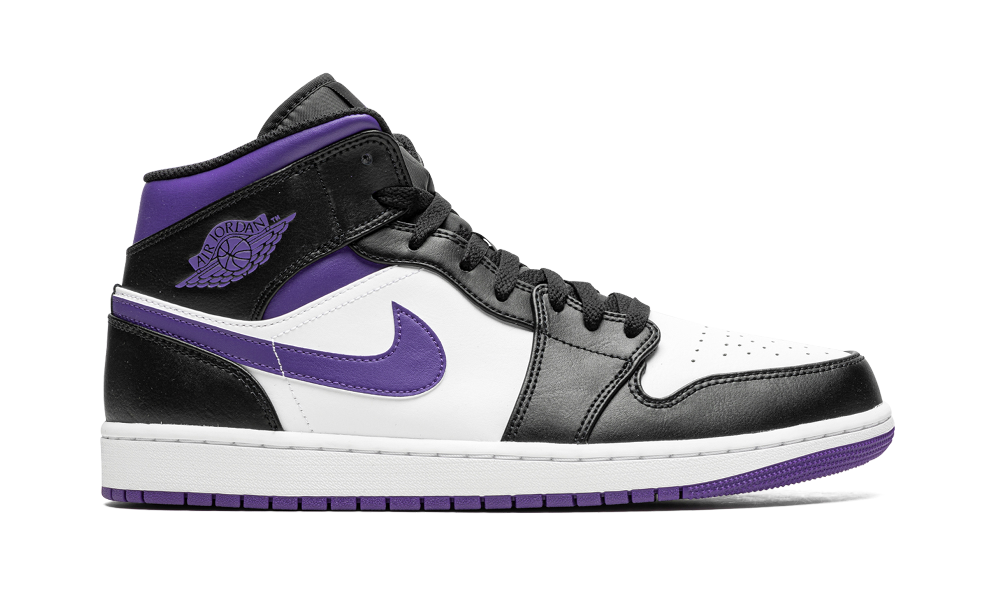 The Air Jordan 1 Mid “Dark Iris” is a colorway of the mid-top version of Michael Jordan’s first signature shoe that unofficially shows love to the Sacramento Kings. Dressed in the basketball team’s black, white, and purple team uniform colors, the “Dark Iris” is in no way affiliated with the Kings, but brings to mind all of the great Player Exclusive Air Jordan colorways worn by former Kings players and Team Jordan members Mike Bibby and Mitch Richmond. The shoe features a white perforated leather toe and mid-panel. Contrasting black leather overlays appear on the forefoot, eyelets, collar, and heel. A Dark Iris leather Swoosh is found on the sides. The purple hue also appears on the “Wings” logo, on the collar, and on the Jumpman and “Air” branding on the tongue tag.