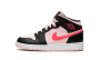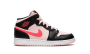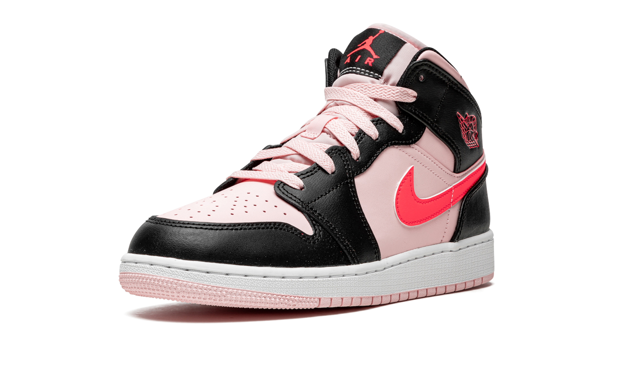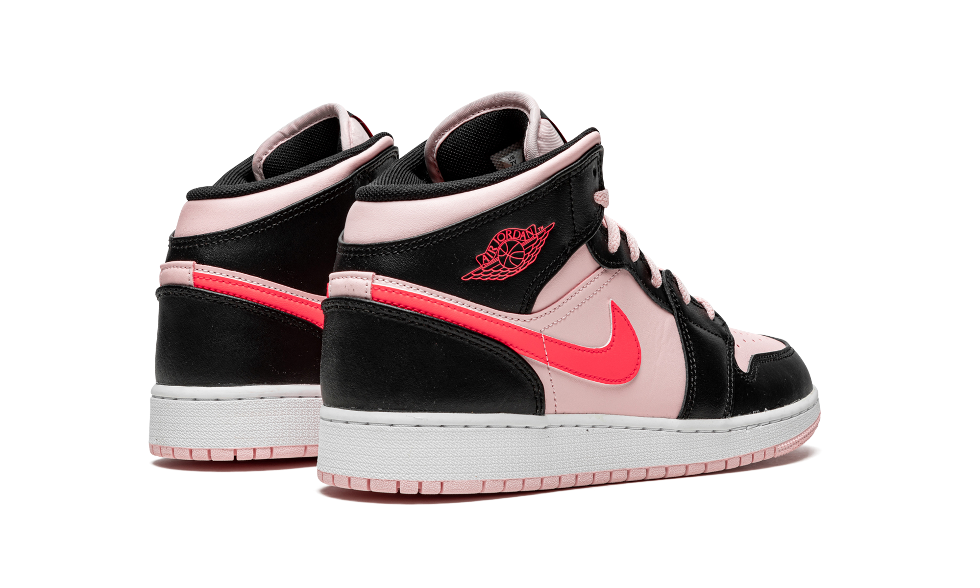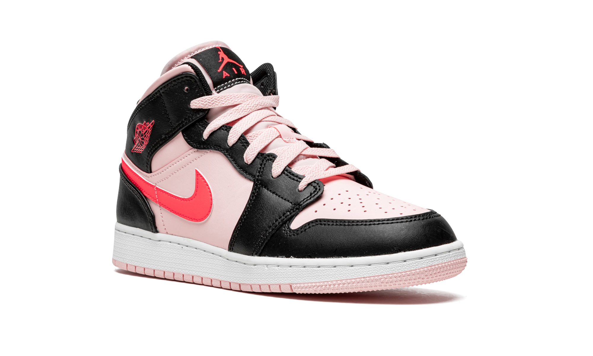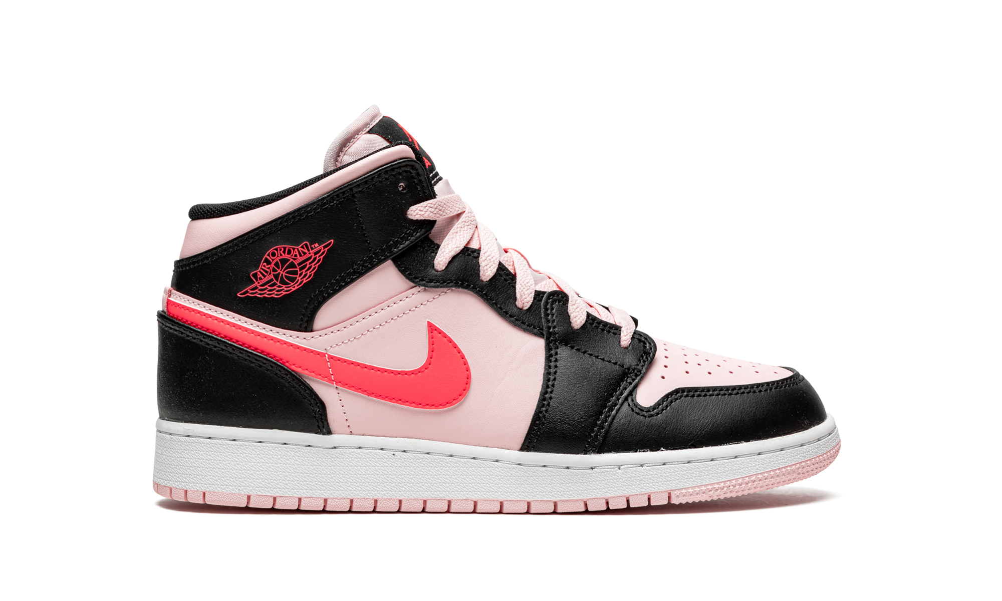 The Air Jordan 1 Mid GS “Atmosphere/Infrared” is a youth-sized version of the mid-top lifestyle shoe in a fun, head-turning colorway. The Jordan 1 Mid for kids in “Atmosphere/Infrared” has a light pink leather base with contrasting black overlays on the forefoot, eyelets, collar, and heel. A neon pink leather Swoosh appears on either side of the shoe and pink “Wings” branding can be found on the collar overlay. Additional pink accenting comes into play on the Jumpman and “Air” branding located on the black tongue tag. Both the laces and nylon tongue are designed in light pink. A two-tone, white midsole and pink outsole finish off the look.