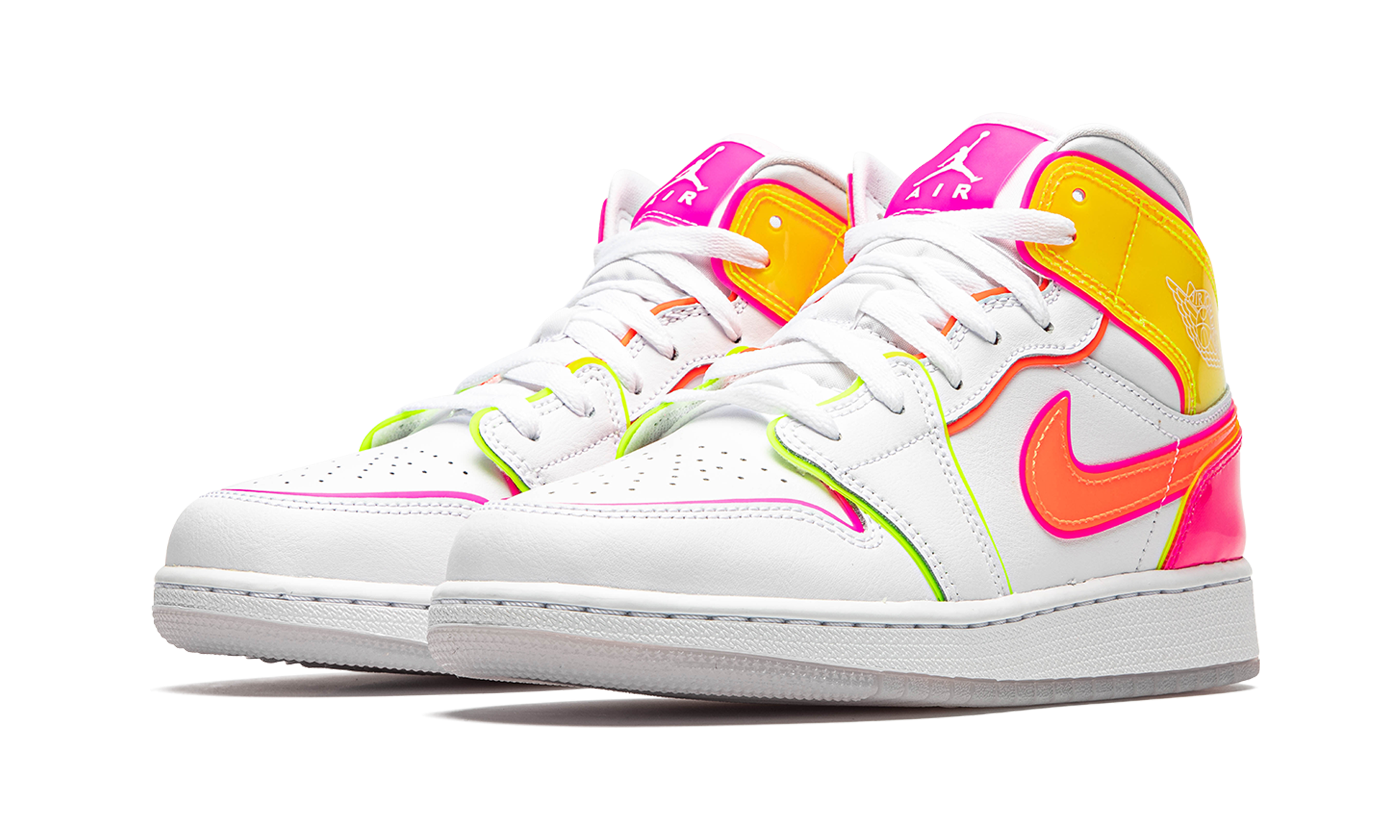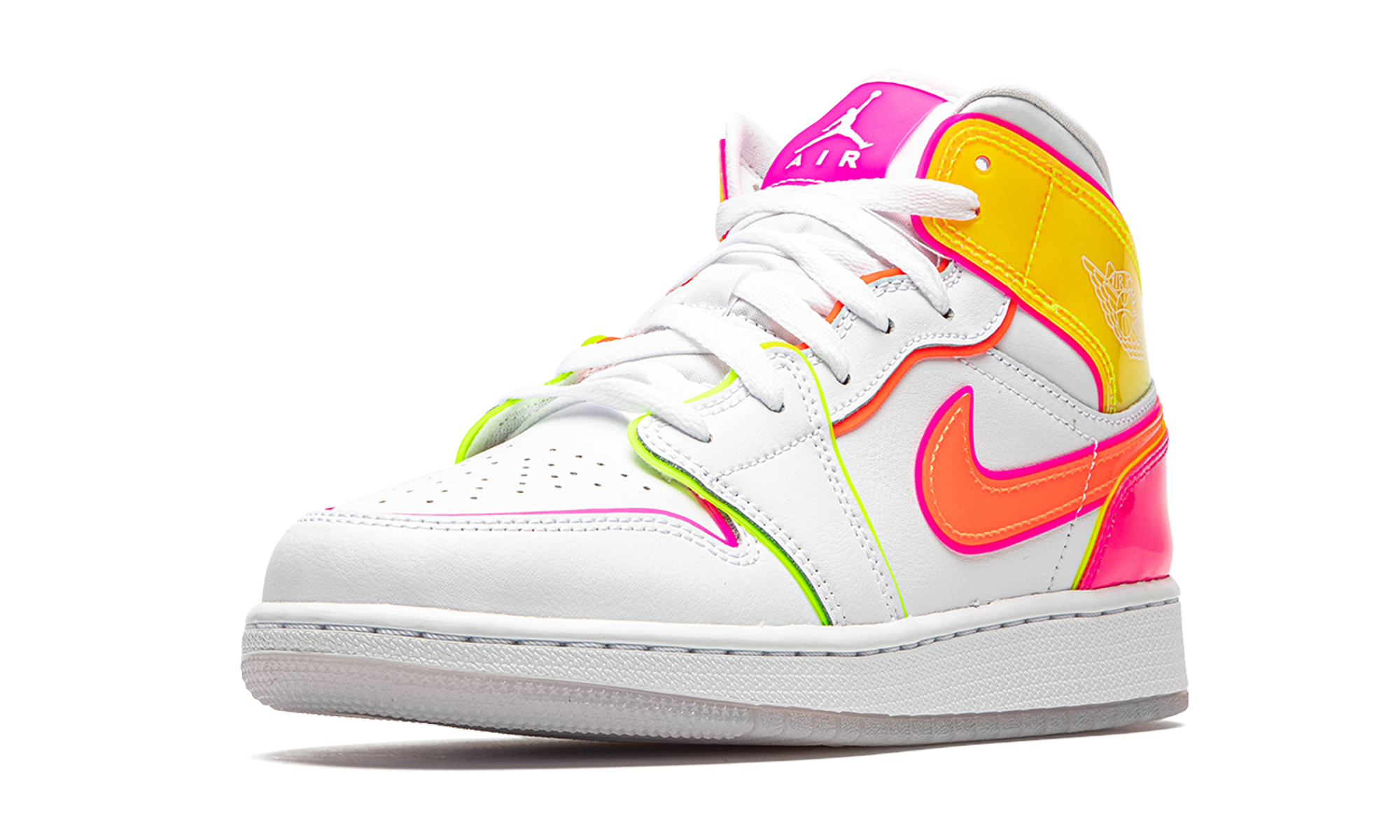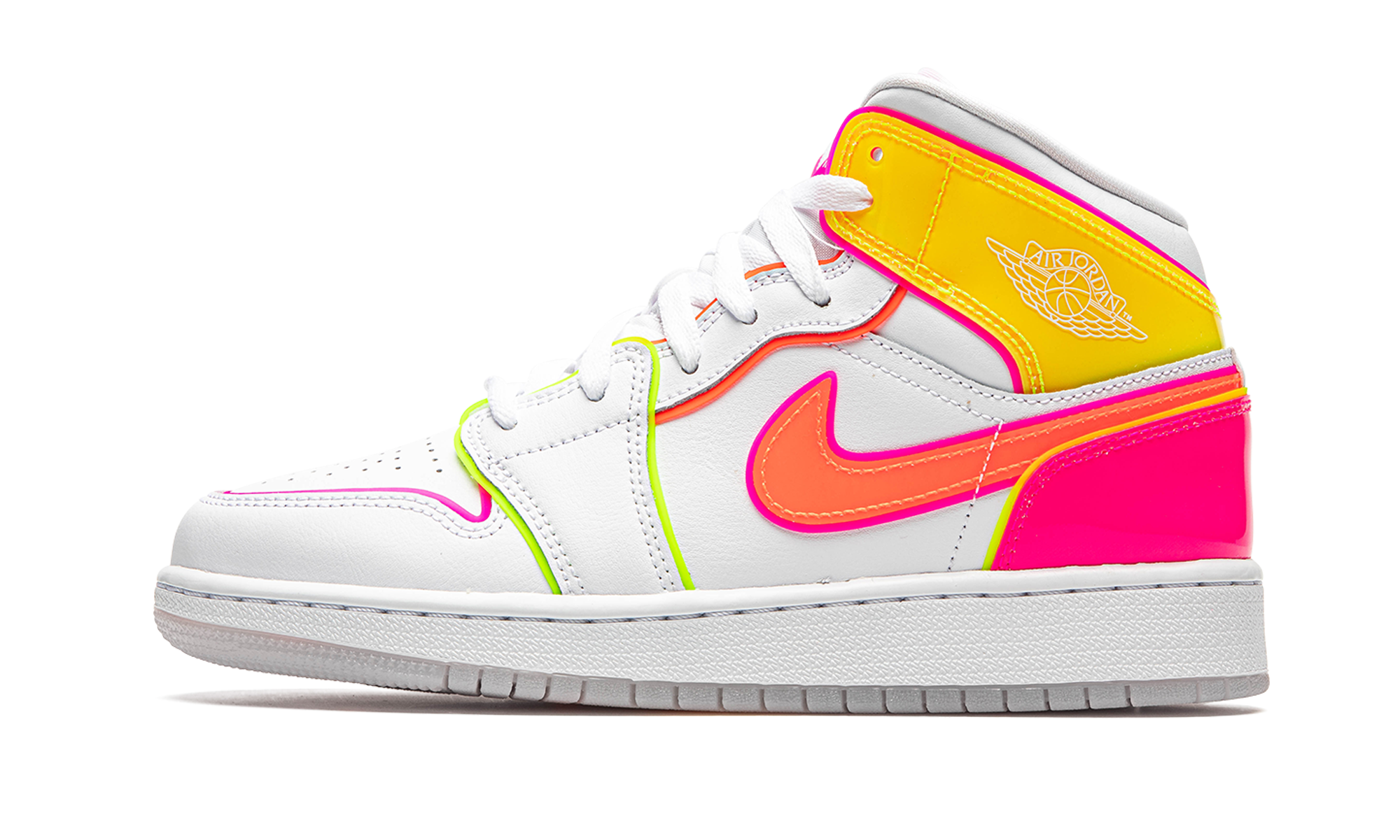 The Air Jordan 1 Mid GS “Edge Glow” is a colorful colorway of Michael Jordan’s signature shoe that has been re-engineered in youth sizing. One of the boldest looks of any Jordan 1, the lively color scheme of the “Edge Glow” matches the energy output of children everywhere. White leather covers the perforated toe and mid-panel. Contrasting hues of highlighter pink, neon green, and orange piping break up the neutral appearance between each panel. Exquisite Hyper Crimson patent leather Swoosh branding with pink trim appears on either side. Pink patent leather dots the heel and yellow patent leather can be found on the collar. White “Wings” detailing is located on the collar. The white nylon tongue displays a fuchsia nylon tongue tab with white Jumpman branding.
