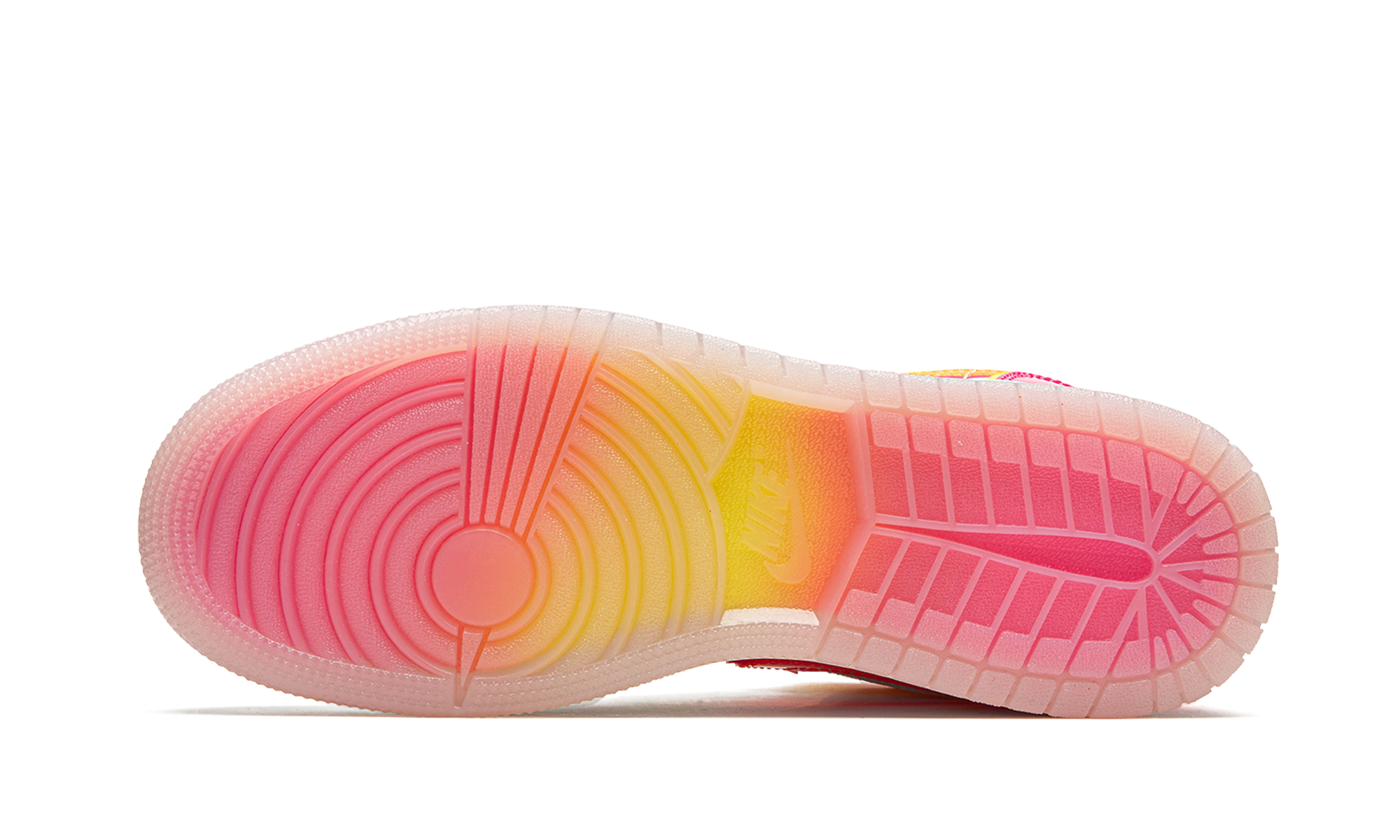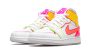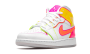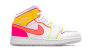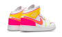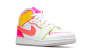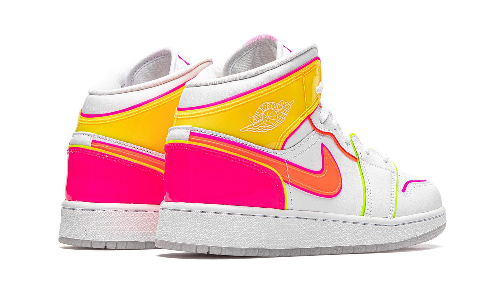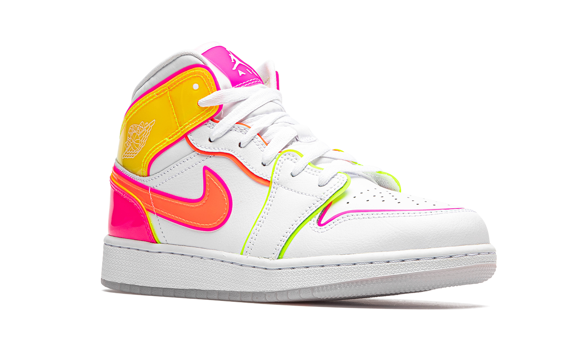The Air Jordan 1 Mid GS “Edge Glow” is a colorful colorway of Michael Jordan’s signature shoe that has been re-engineered in youth sizing. One of the boldest looks of any Jordan 1, the lively color scheme of the “Edge Glow” matches the energy output of children everywhere. White leather covers the perforated toe and mid-panel. Contrasting hues of highlighter pink, neon green, and orange piping break up the neutral appearance between each panel. Exquisite Hyper Crimson patent leather Swoosh branding with pink trim appears on either side. Pink patent leather dots the heel and yellow patent leather can be found on the collar. White “Wings” detailing is located on the collar. The white nylon tongue displays a fuchsia nylon tongue tab with white Jumpman branding.