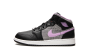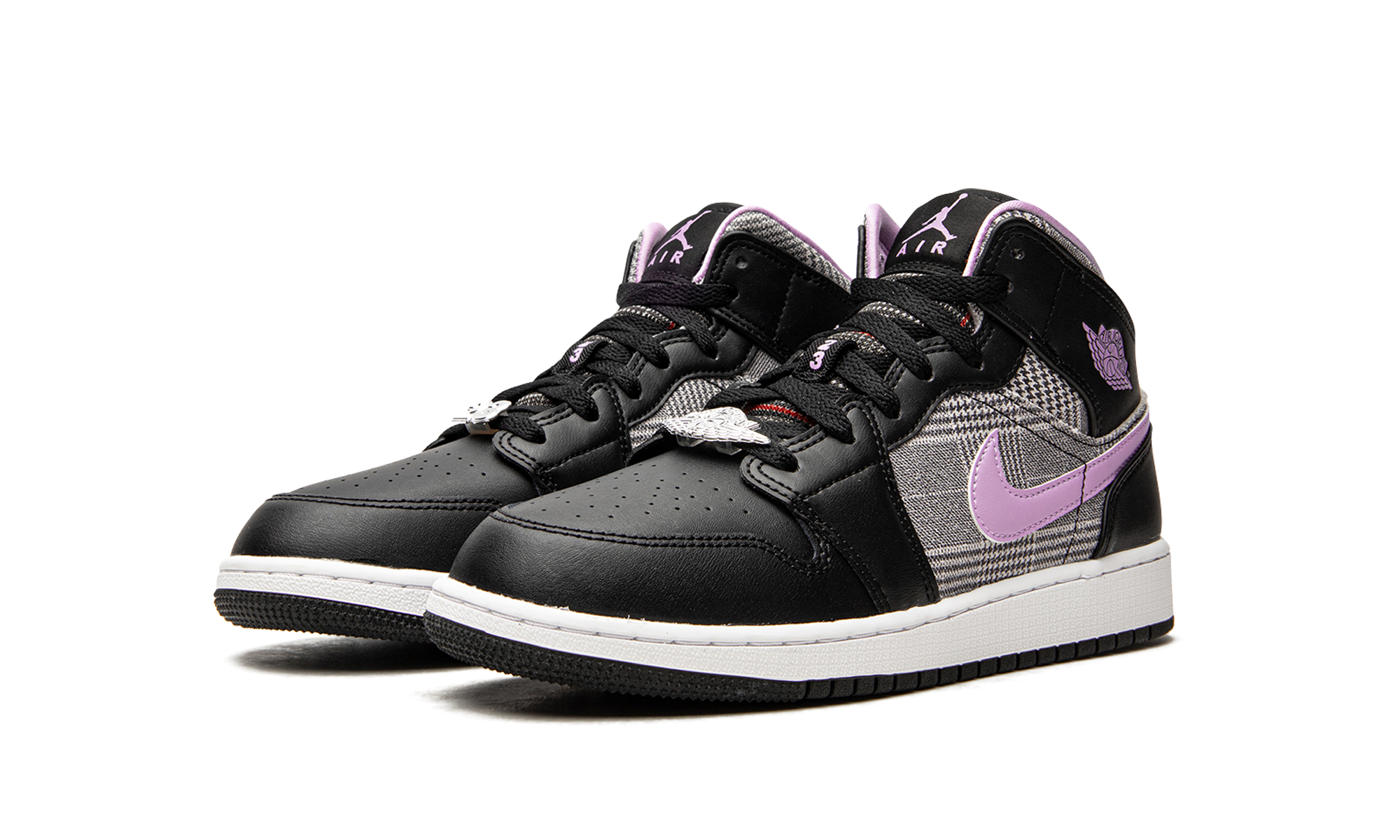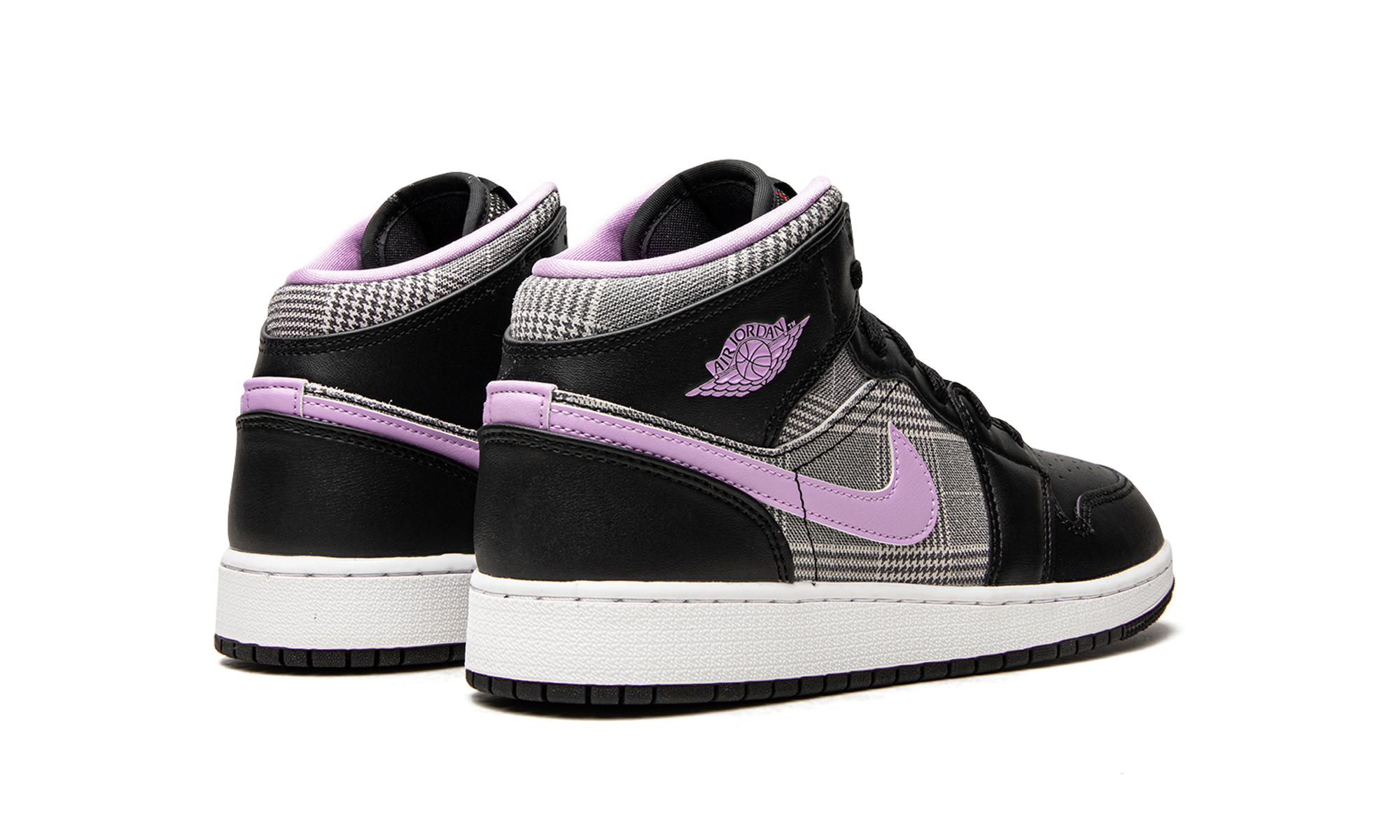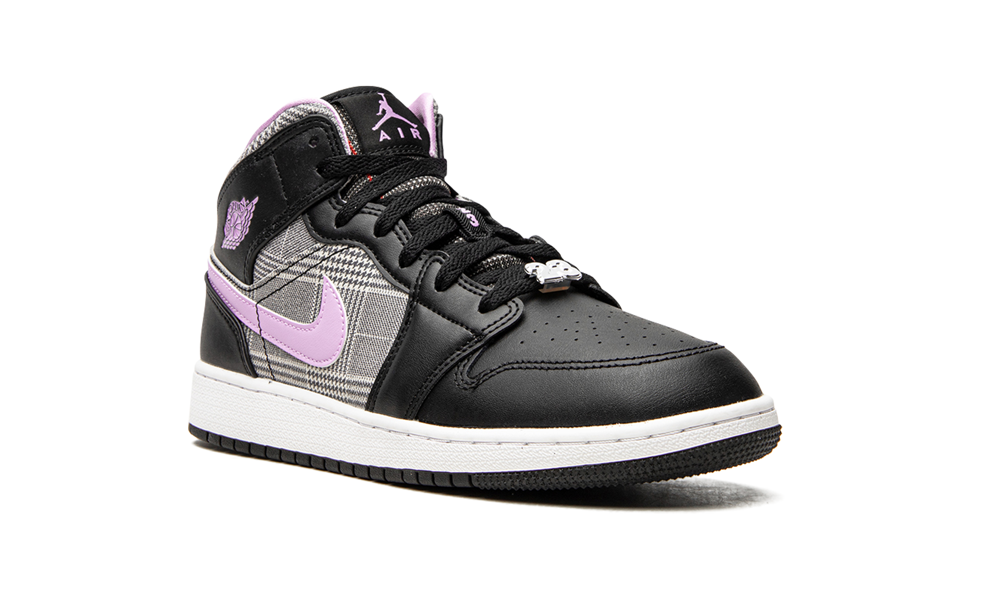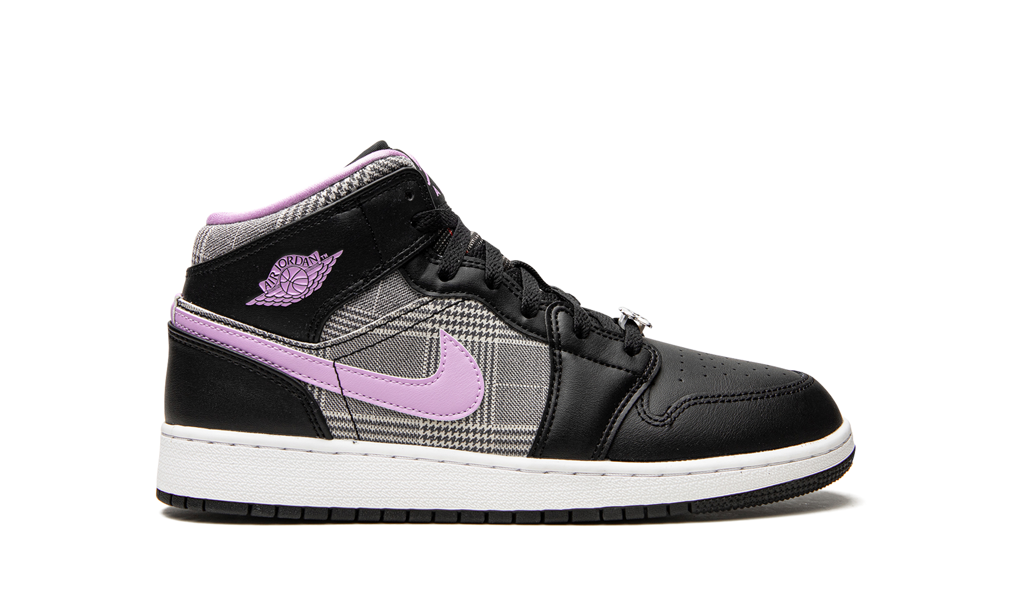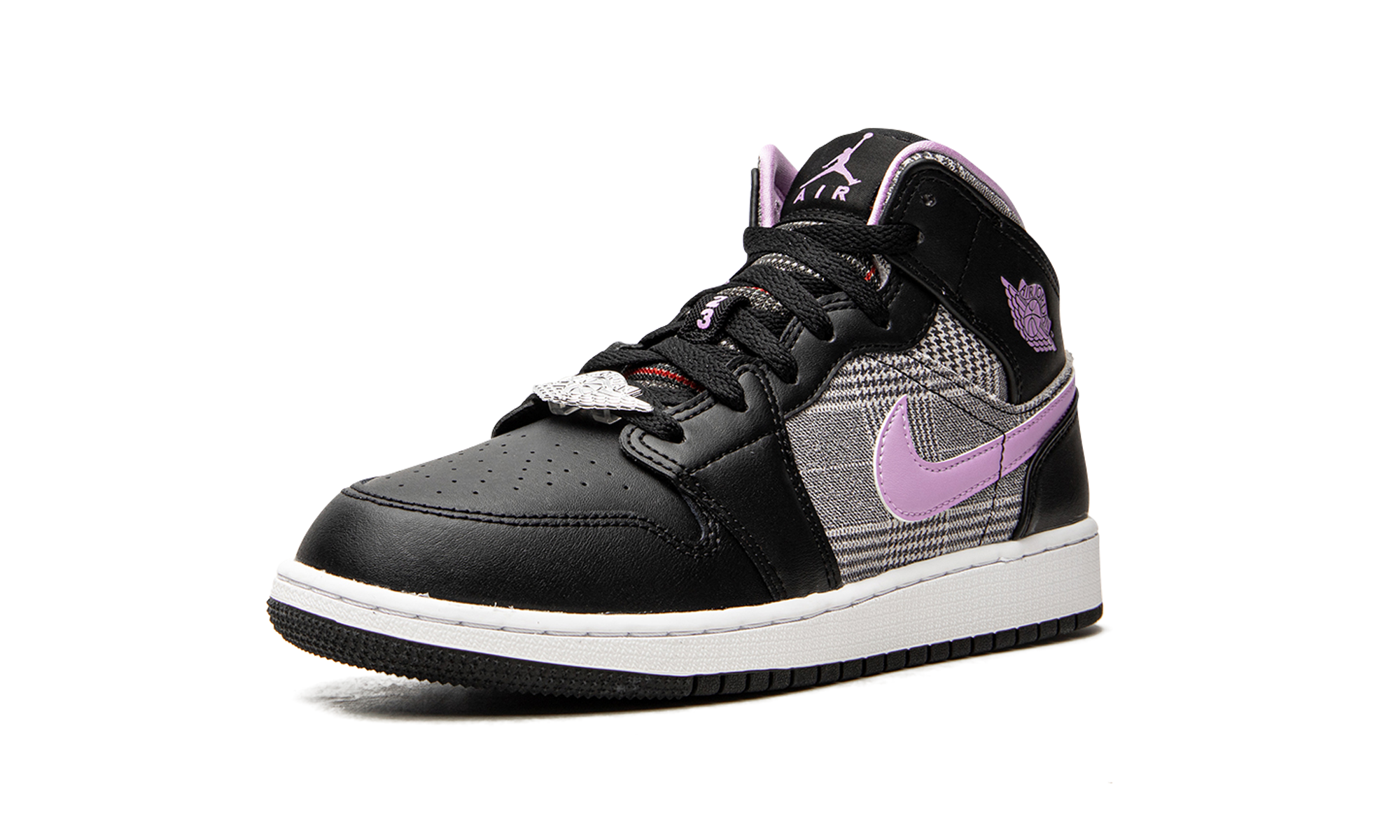 The Air Jordan 1 Mid GS “Houndstooth” is the youth sizing of the popular mid-top shoe in a premium colorway that features a combination of cold weather-inspired materials. The “Houndstooth” is a Fall/Winter 2021 release by Jordan Brand for kids that is complete with a black leather base and lilac-colored leather Swoosh and “Wings” logos. The shoe features a mixed plaid patterned houndstooth fabric on the mid-panel and collar. A lilac Jumpman is found on the black nylon tongue tag on the tongue and lilac “23” detailing appears on the lace overlay. Jordan Brand adds a silver “Wings” dubrae to the shoe to complete the look.