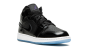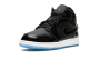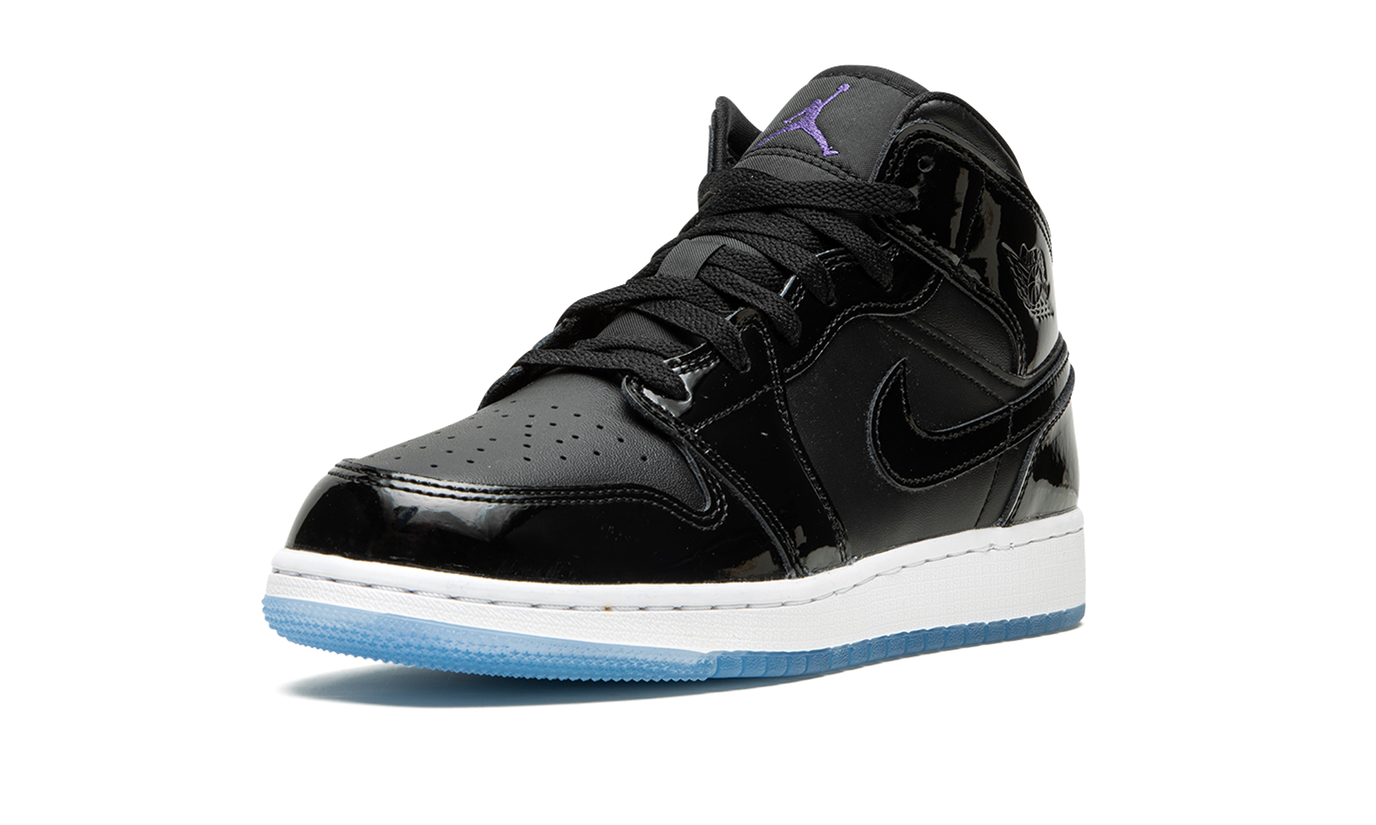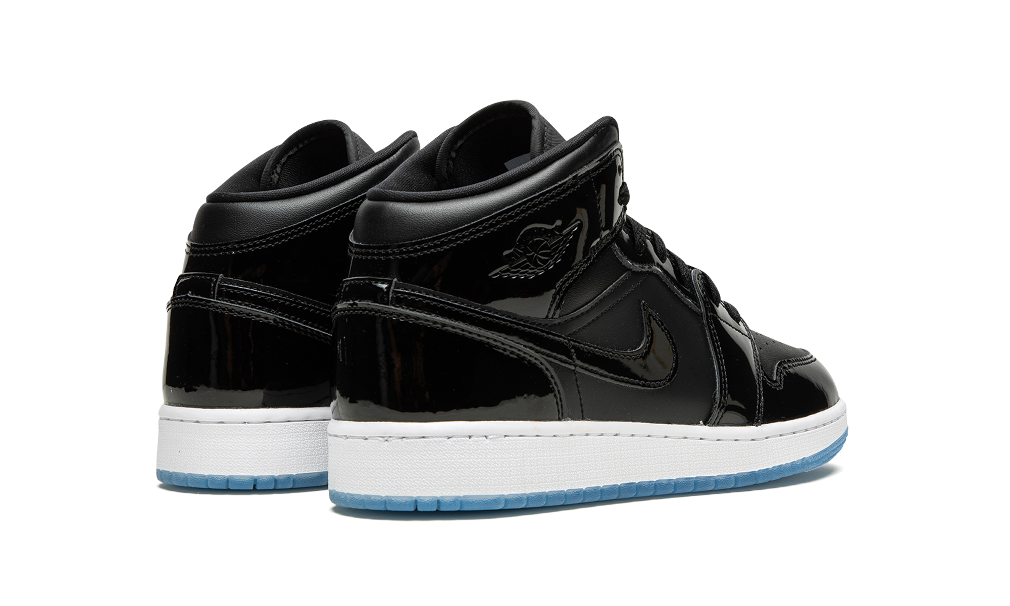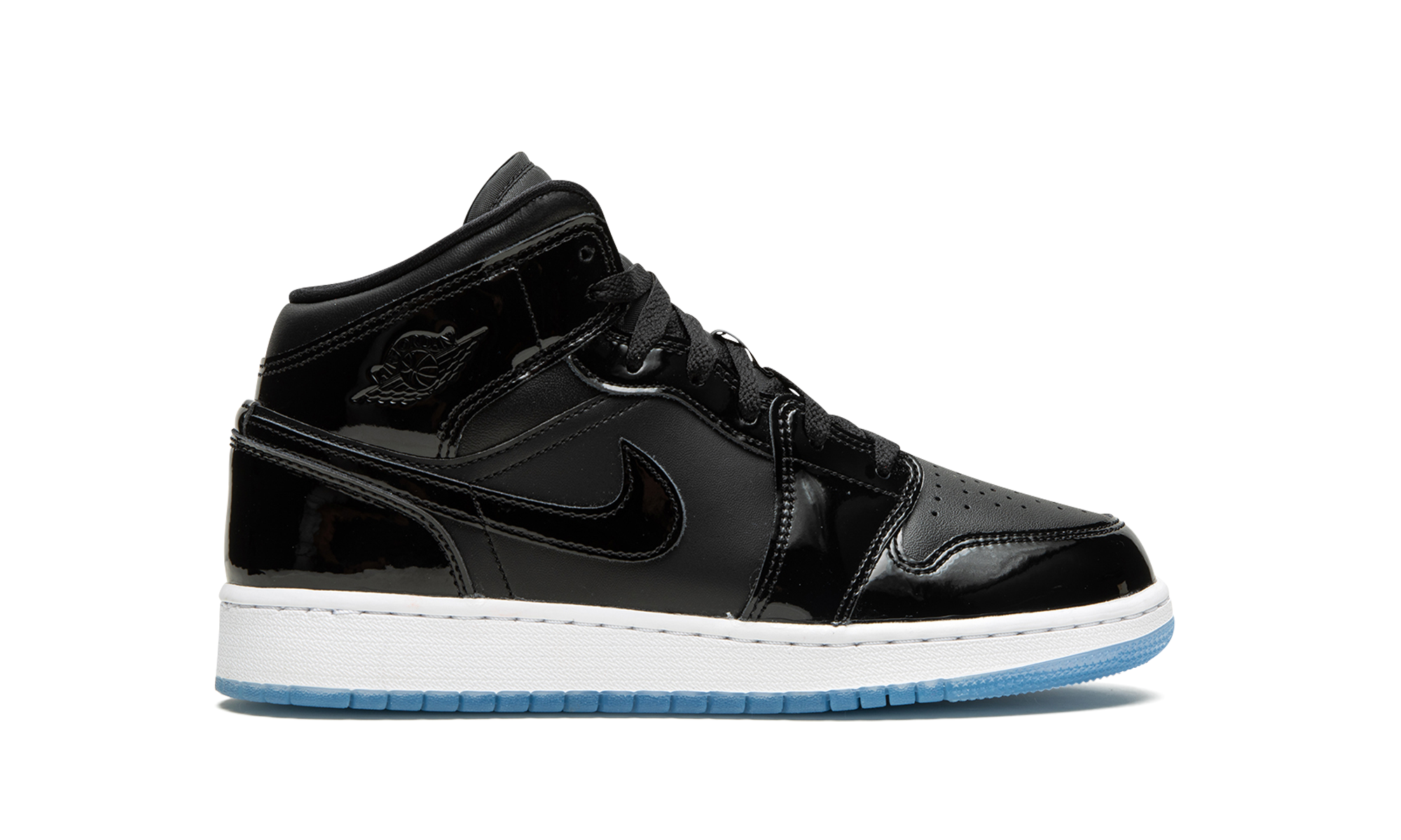 The Air Jordan 1 Mid GS “Space Jam” is the youth sizing of the colorway of the popular lifestyle shoe that is inspired by a classic Air Jordan design. The design we’re referring to is the Air Jordan 11’s “Space Jam” colorway that was worn by Michael Jordan in the movie of the same name. The Jordan 1 Mid “Space Jam” draws favorably from the Jordan 11 in that it is constructed with black patent leather on its design, here on its overlay panels and on the “Wings” branding on the collar and the Swoosh branding found on either side. The shoe’s base is designed in tonal black leather. A white rubber midsole and icy blue translucent rubber outsole completes the “Space Jam” theme.