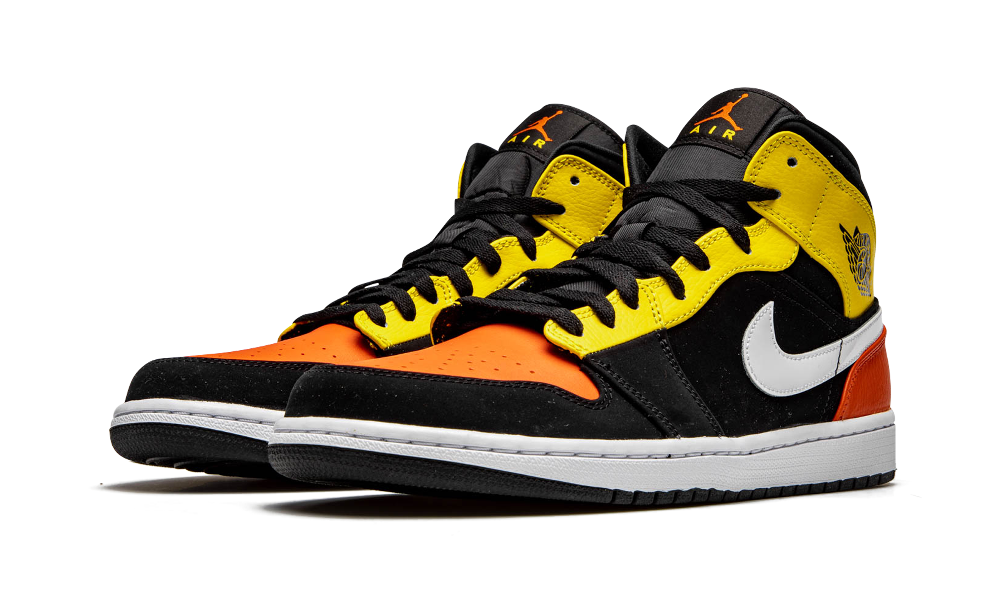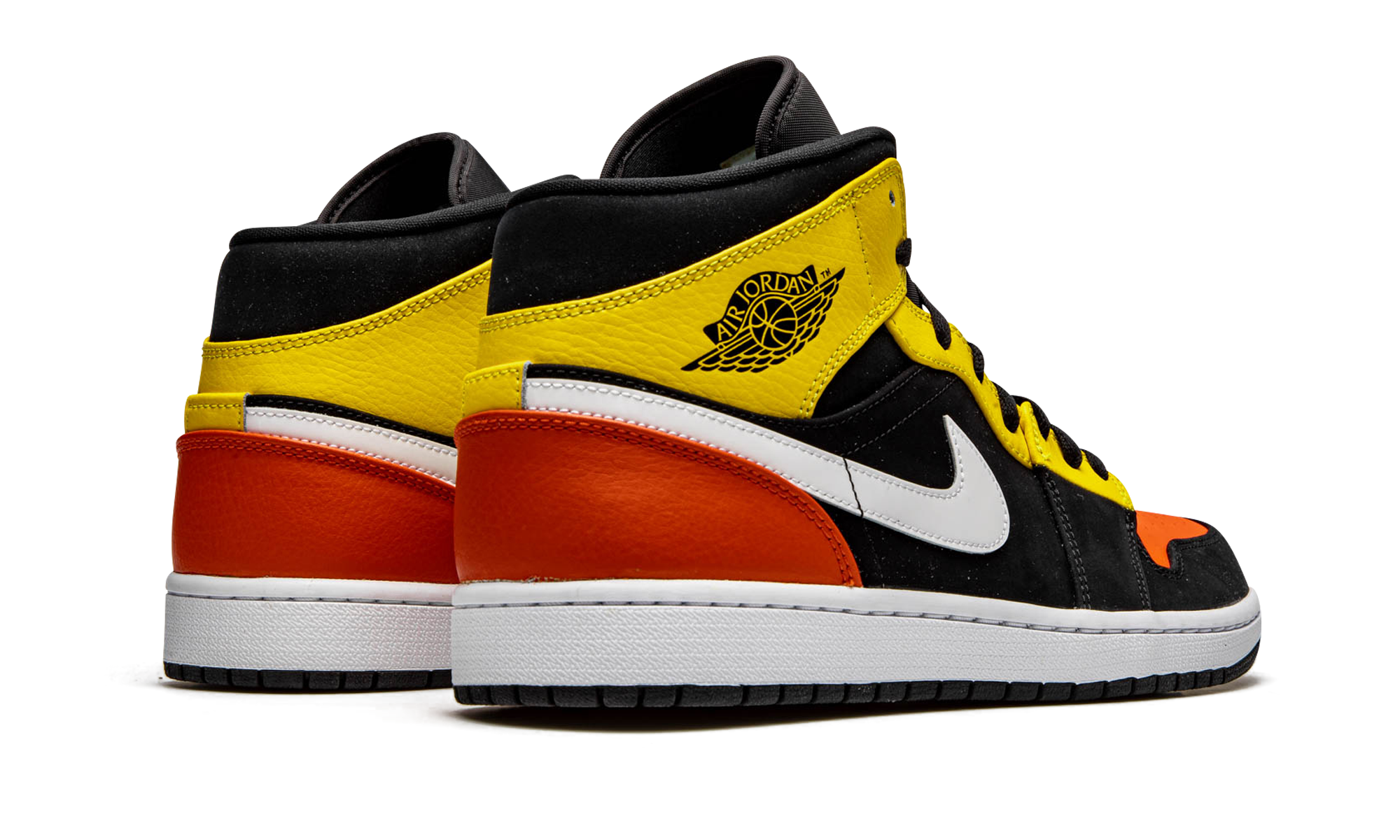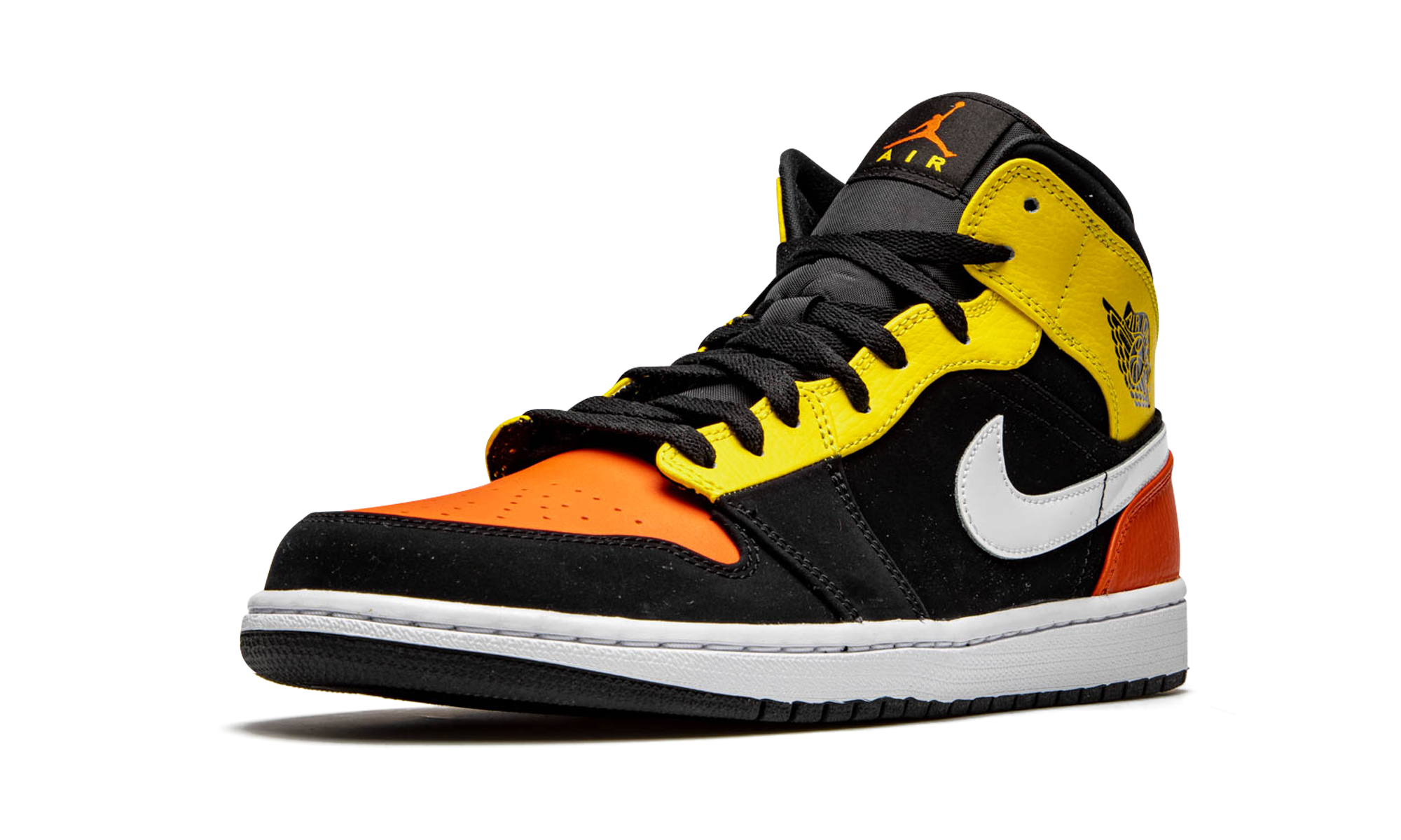 The Air Jordan 1 Mid SE “Amarillo Orange” gives the alternate mid-top version of Michael Jordan’s first signature shoe a decidedly off court look. Over the years, few silhouettes in Jordan Brand’s footwear collection have been released in more exciting and bold colorways than the Air Jordan 1 Mid. The “Amarillo Orange” is a testament to the notion. A black synthetic nubuck material is applied to the mid-panel, forefoot, and collar. Team Orange leather detailing appears on the perforated toe and bright shade of yellow leather is used on the eyelets and collar. Branding wise, a white leather Swoosh and black “Wings” logo adorn the mid-panel and collar, respectively. An Amarillo Orange leather panel on the heel adds to the mismatched design. Jordan Brand finishes off the look with an orange Jumpman on the black nylon tongue.