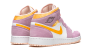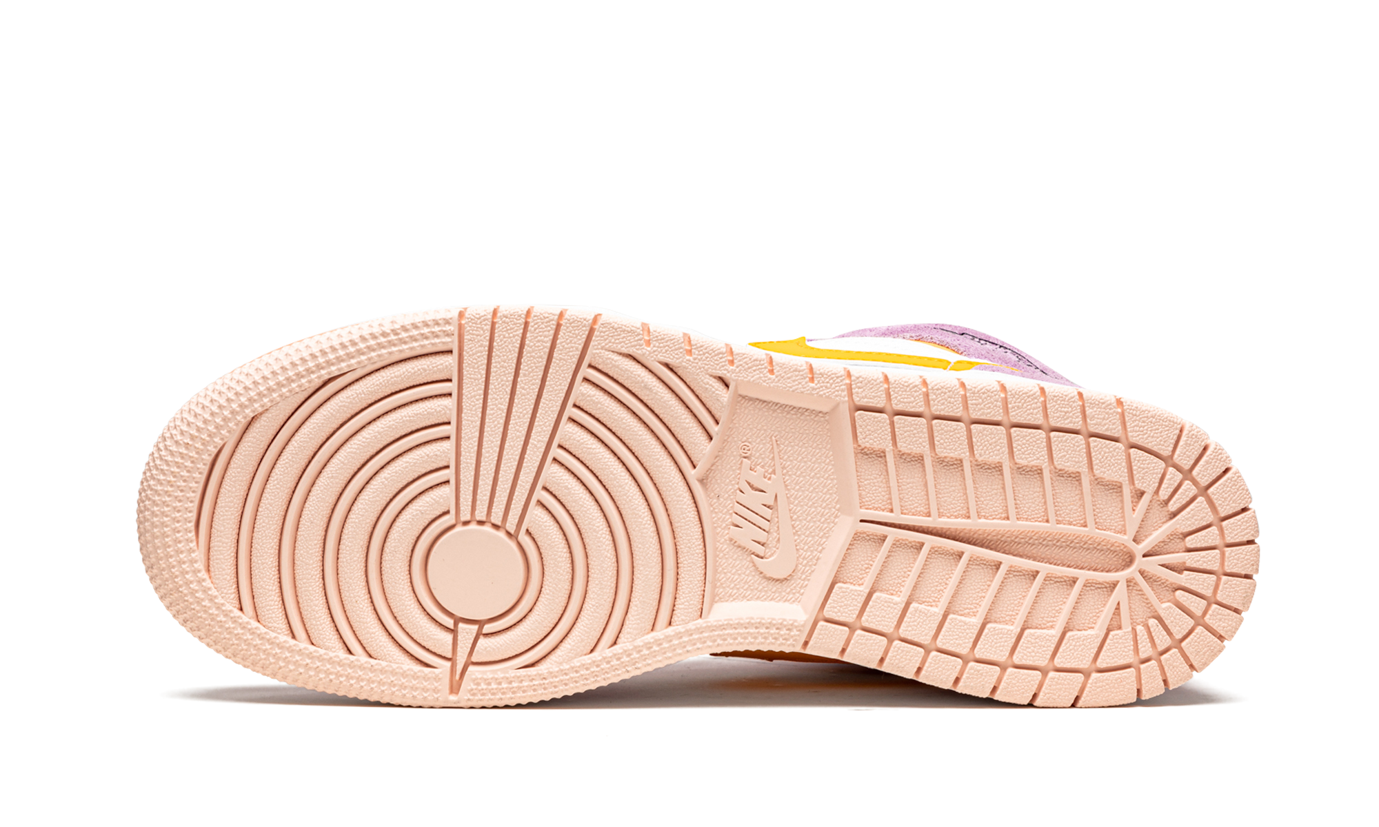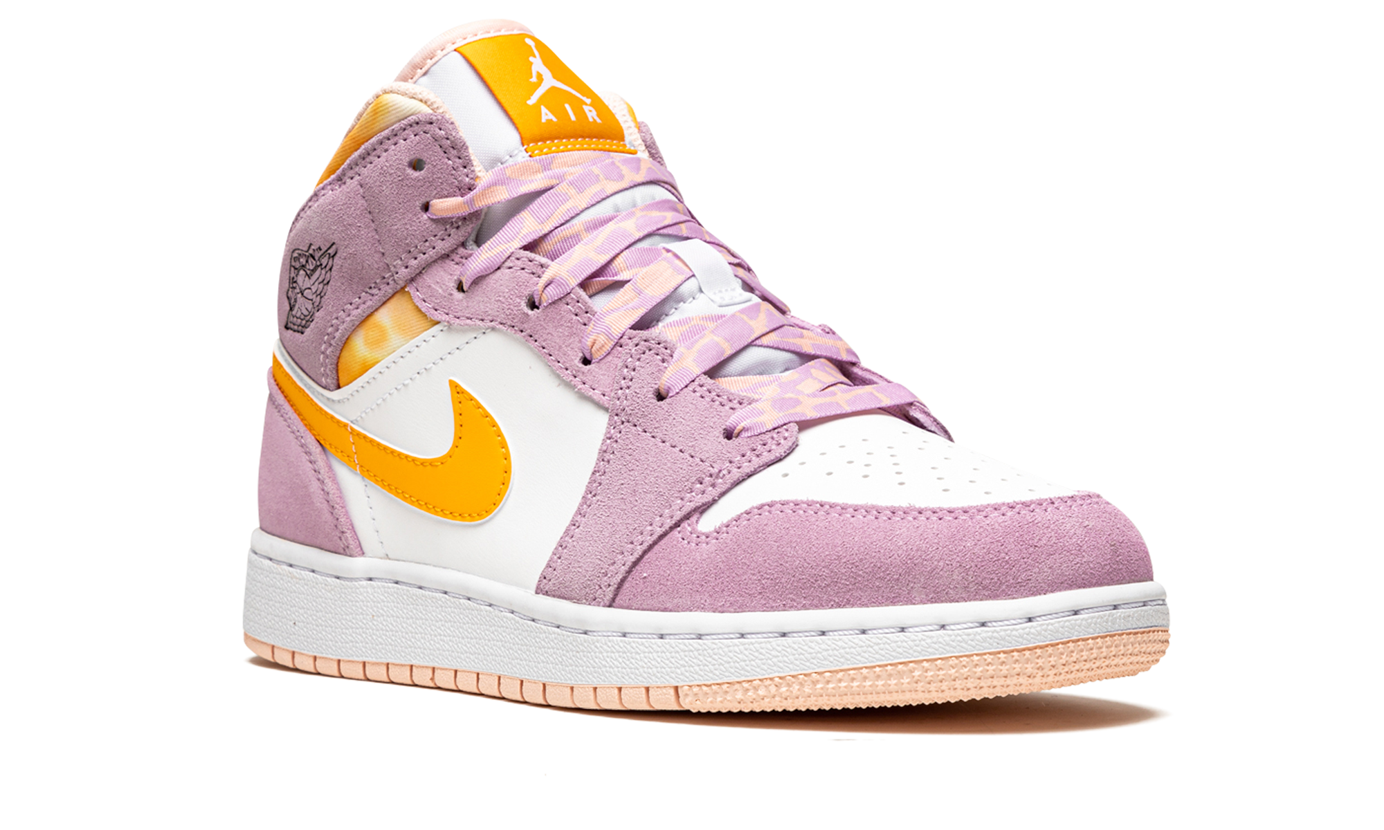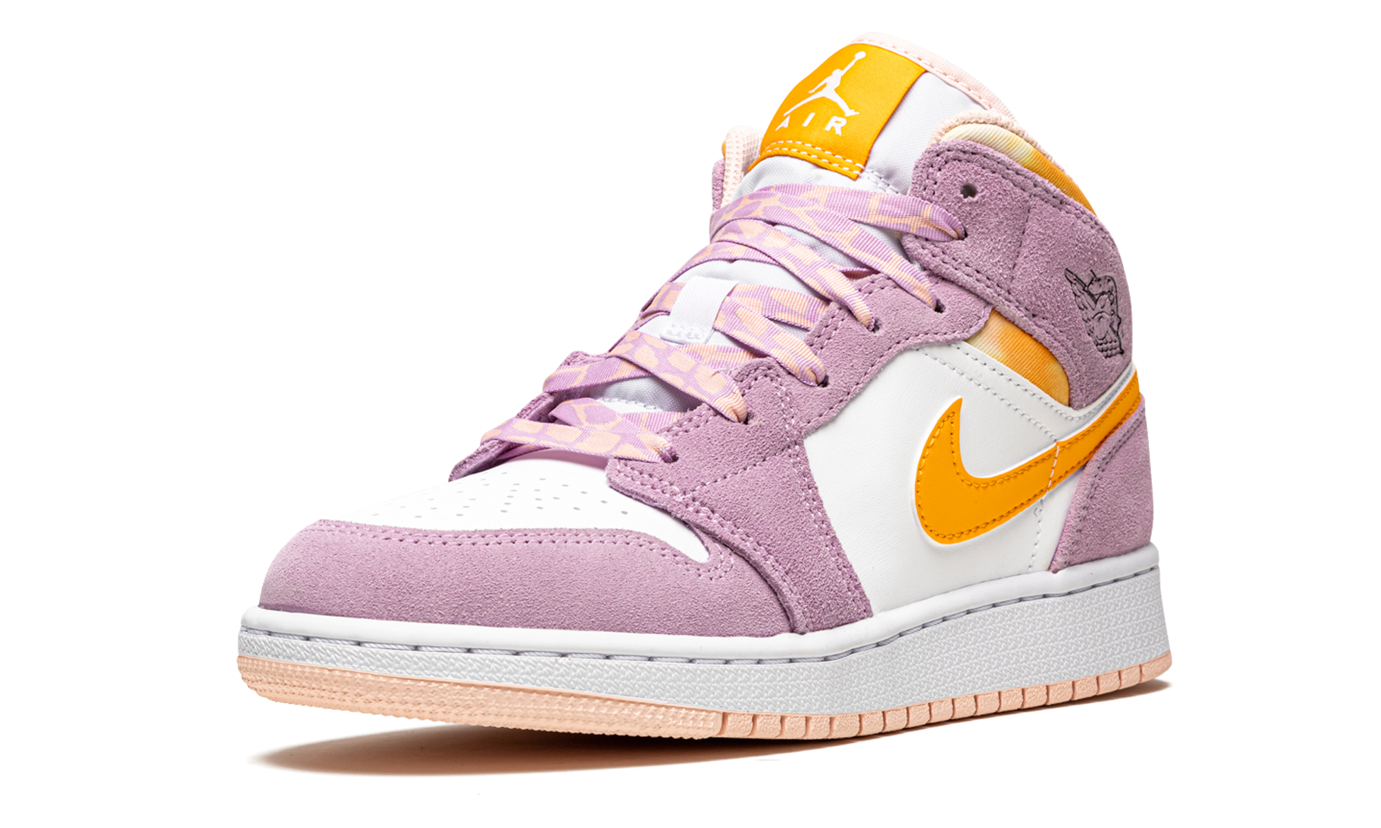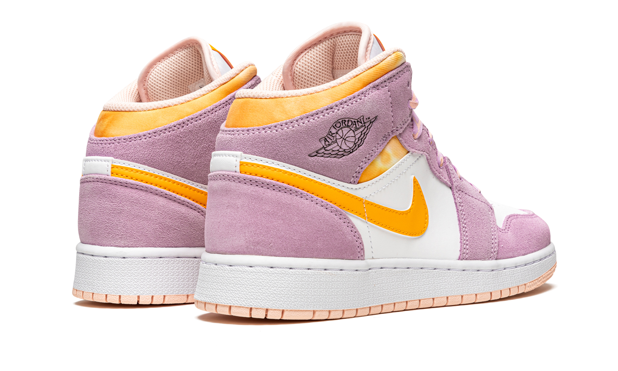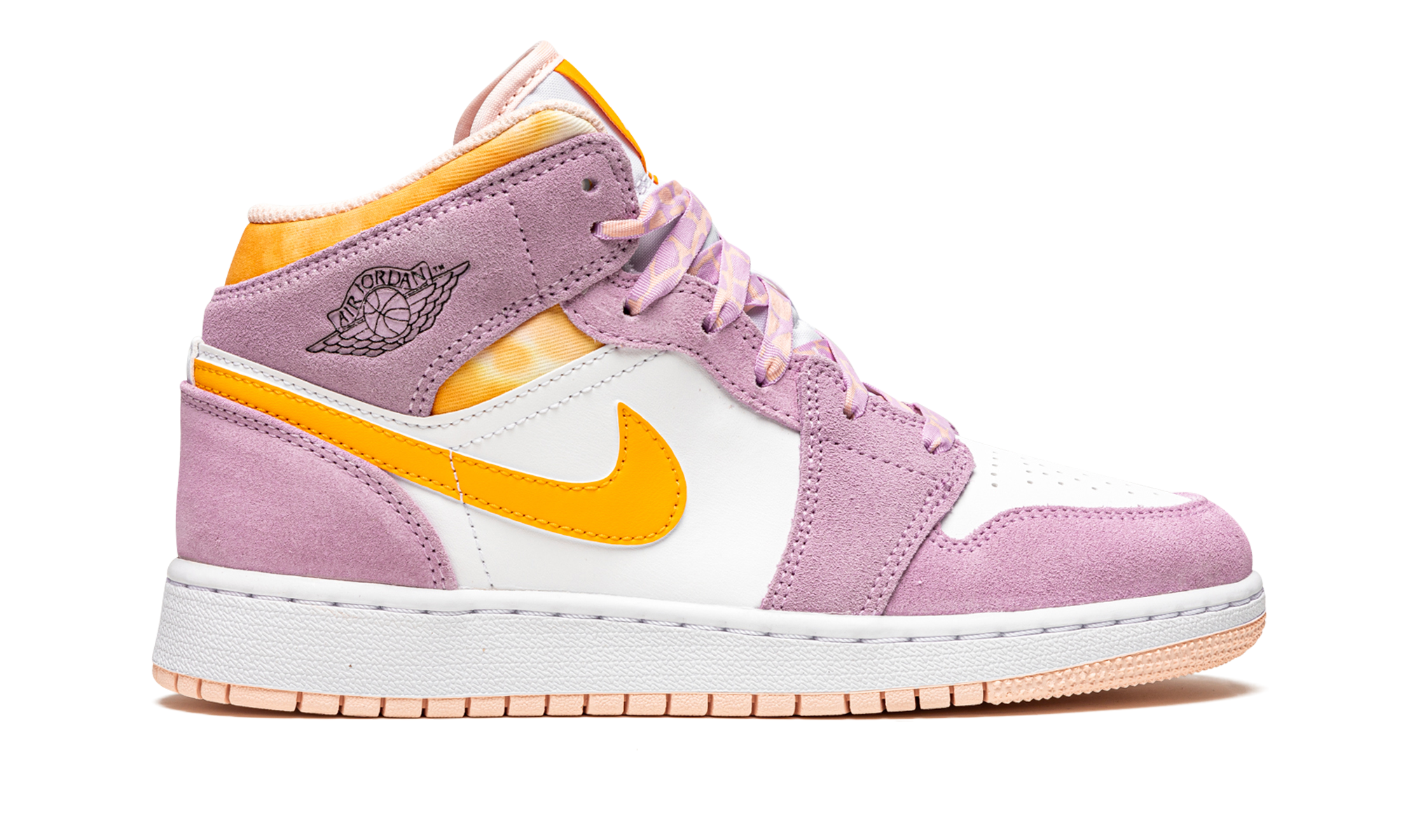 The Air Jordan 1 Mid SE GS “Arctic Pink” is the grade school sizing of the summer-inspired colorway of Michael Jordan’s first signature shoe. A kids exclusive release by Jordan Brand in 2021, the “Arctic Pink” features washed out purple suede panels that are contrasted by white leather on the perforated toe and mid-panel. Jordan Brand paints the leather Swoosh in a University Gold hue. The attention-grabbing shade of yellow reappears on the nylon collar in a tie-dye-like design and on the Jumpman found on the tongue tag on the white nylon tongue. A black “Wings” logo appears on the collar and purple and yellow tie-dye laces are layered over the tongue. Being that this is the the kids version of the Jordan 1 Mid, Jordan Brand adds a nylon pull tab to the heel to assist with easy on-off access.