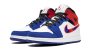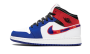 The Air Jordan 1 Mid “University Red/Rush Blue (GS) is the youth sizing of the classic silhouette that originally debuted back in the mid-80s. Nods to two iconic Jordan 1 colorways, the “Chicago” and “Royal” makeups, are featured throughout the look of the tiny model. Blue nubuck overlays around the forefoot and eyelets are contrasted by a white leather base that appears on the perforated toe and mid-panel. Black cotton laces and a vibrant multi-colored embroidered Swoosh on the mid-panel are contrasted by bold red nubuck around the collar. A black Wings logo on the collar and Jumpman branding on the tongue completes the look of the children’s sizing of the Air Jordan 1 Mid.