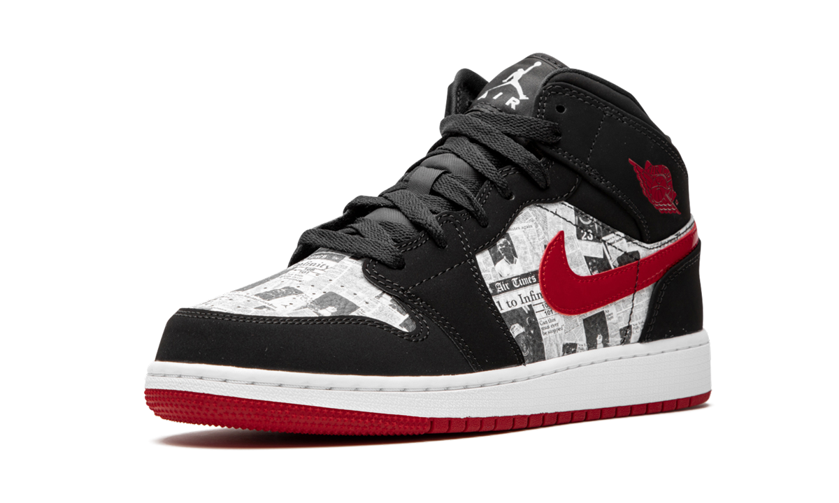 The Air Jordan 1 Mid SE (GS) “Newspaper Air Times” is the youth sizing of mid-top shoe that celebrates the storied career of Michael Jordan. Forever finding unique ways to honor its legendary namesake, Jordan Brand adorns newspaper clippings of the accomplishments and highlights of “The GOAT’s” career to the base of the shoe. Black nubuck overlays contrast the look with a red leather Swoosh appearing on the mid-panel. A red Wings logo is located on the collar while a black nylon tongue finishes off the look of the upper. Jordan Brand sticks to a classic white rubber midsole and red outsole on the grade school sizing of the Air Jordan 1 Mid SE “Newspaper Air Times.”