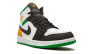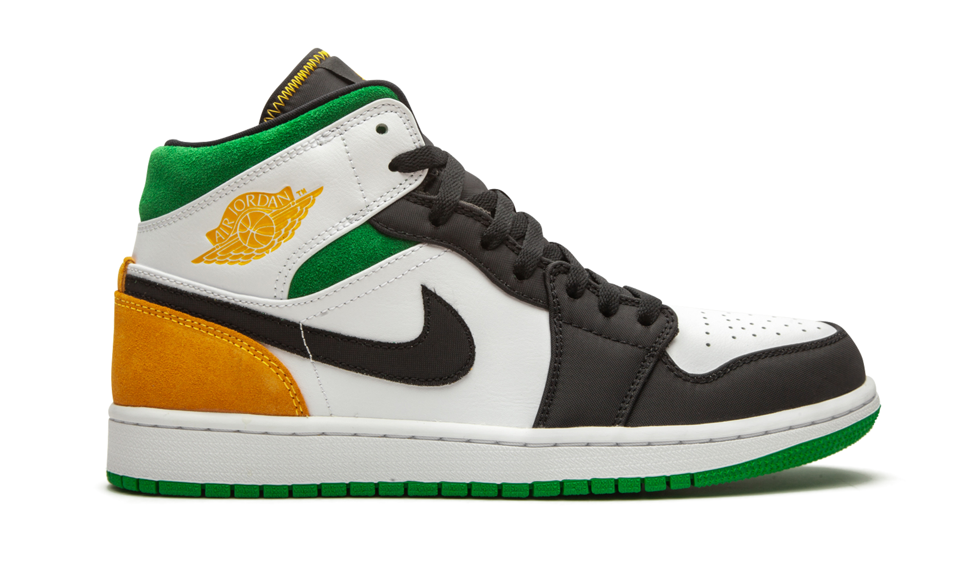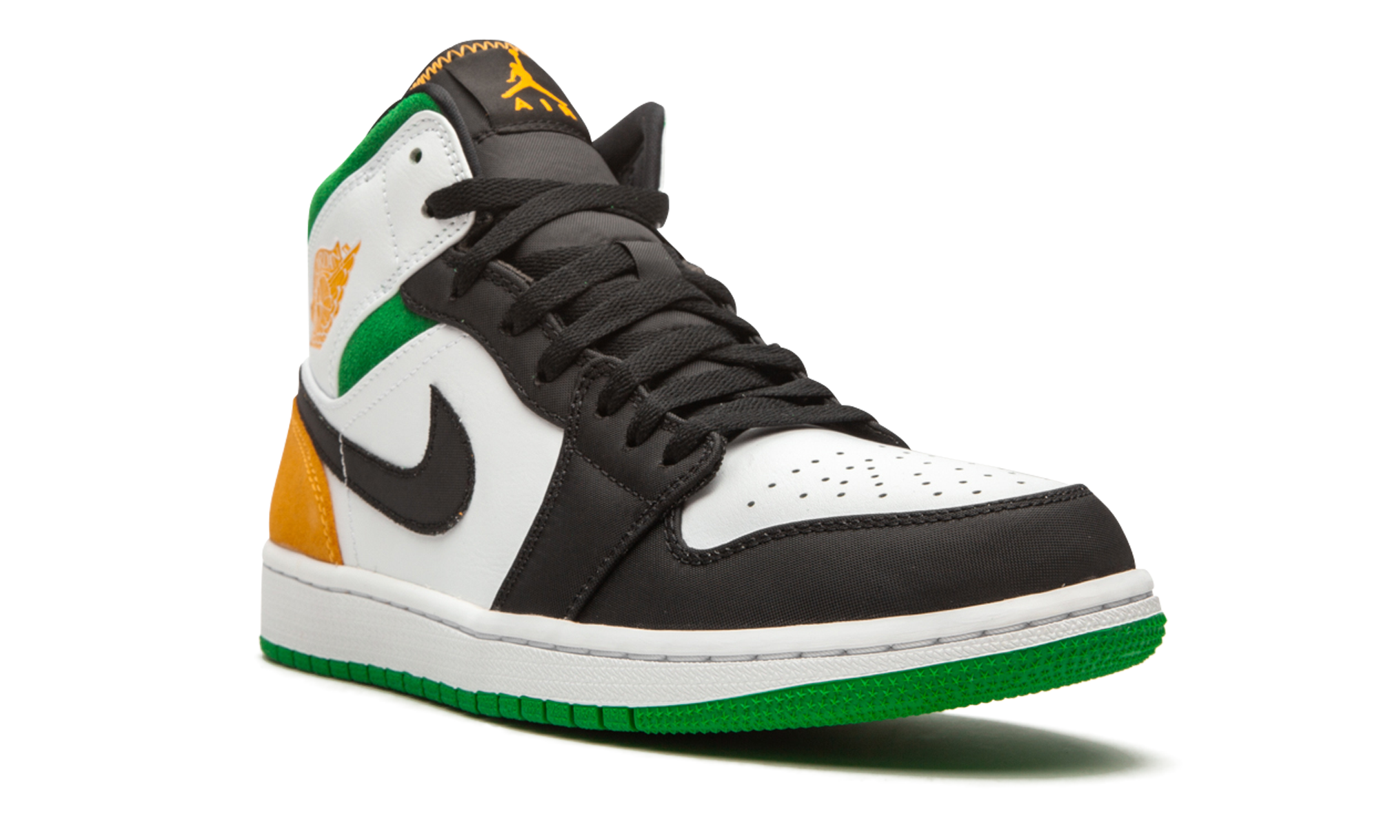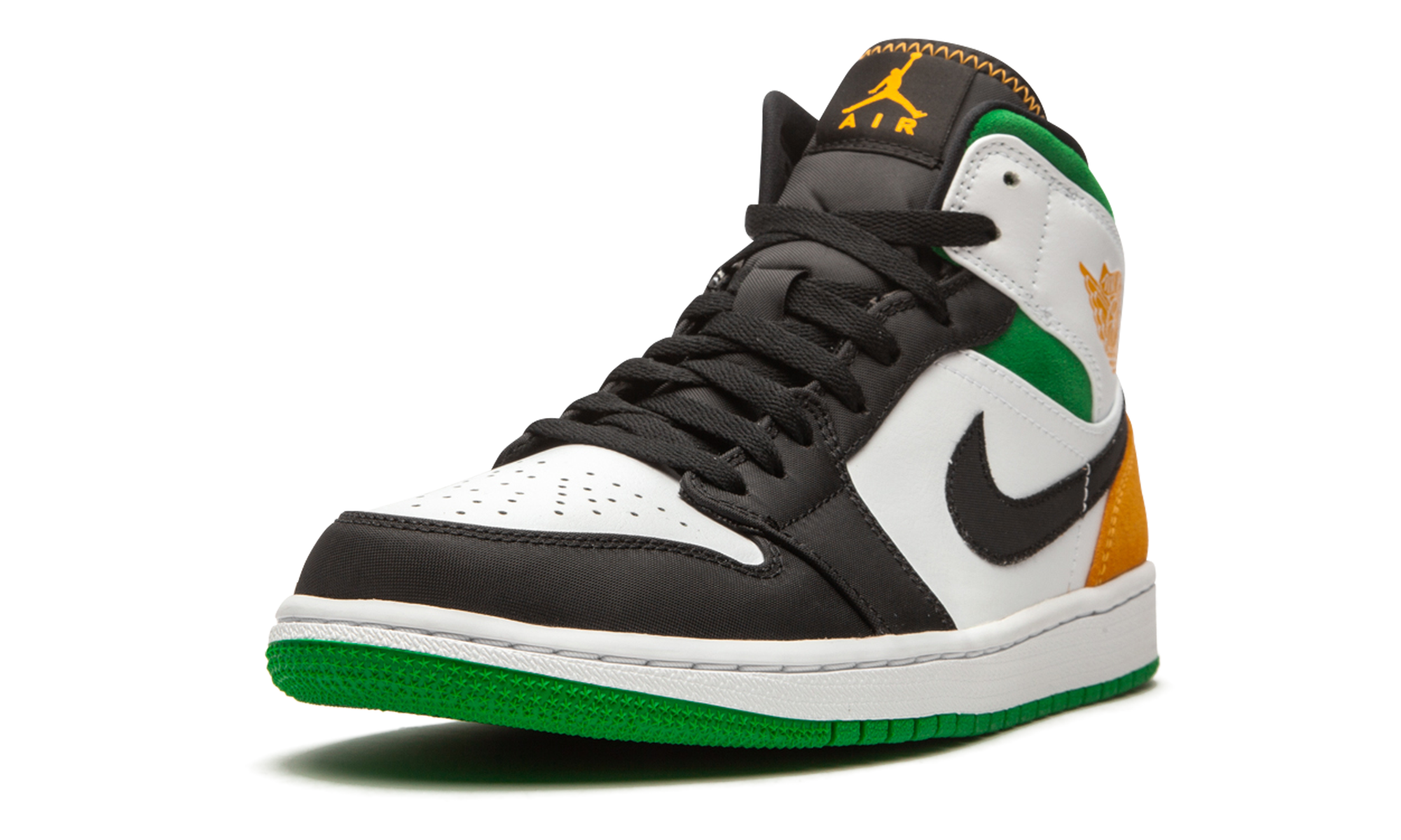 The Air Jordan 1 Mid “Oakland” features a color scheme that calls to mind the Oakland Athletics baseball team. In no way a collaborative effort between the major league baseball team and Jordan Brand, the color scheme of this design nonetheless mirrors that of the Athletics’ team uniform colors. The upper features white leather detailing on the perforated toe, mid-panel, and collar overlay. Contrasting black nylon paneling can be found on the forefoot, eyelets, and Swoosh branding on either side. A black nylon tongue with Laser Orange exposed stitching on the top and Jumpman insignia on the tongue tag add to the unique appearance of this Jordan 1 Mid. Green suede is located around the collar. An additional patch of suede, this time in a washed orange hue, dots the lower heel.