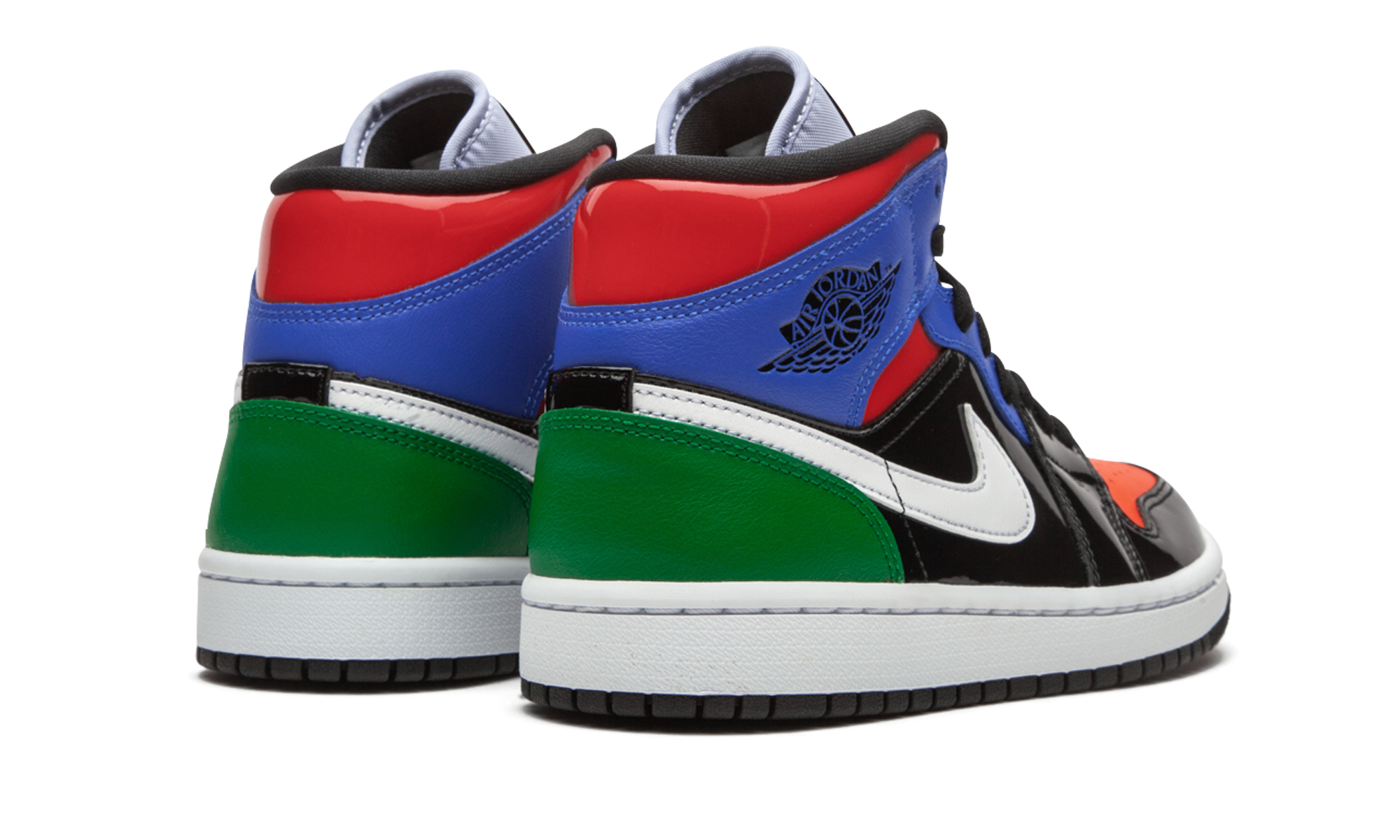 The Women’s Air Jordan 1 Mid “Multicolor Patent” is the women’s sizing of Michael Jordan’s first signature sneaker in a distinctly contrasting color scheme. Finished with select panels in glossy patent leather, the upper of this Women’s Jordan 1 Mid is reminiscent of the design used on the Jordan 1 Low “Multicolor.” On this colorway, Jordan Brand uses a fiery orange perforated toe that is contrasted by black patent leather overlays on the forefoot, lower eyelets, and mid-panel. Royal blue leather accenting appears on the upper eyelets and collar, where a black “Wings” logo provides a touch of classic Air Jordan 1 styling. Elsewhere, white leather Swoosh branding can be found on the mid-panel and a green leather panel is located on the heel. Red patent leather around the collar finishes off the eye-catching colorway. Release date: July 2020.