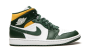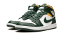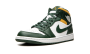 The Air Jordan 1 Mid “Sonics” is a colorway of Michael Jordan’s first signature shoe in the mid-top silhouette that features the former team uniform colors of the Seattle Supersonics. The now-defunct Sonics, who relocated to become the Oklahoma City Thunder in the late 2000s, wore green-and-yellow team uniforms and were among the most popular basketball teams in the NBA back in the day. The “Sonics” Jordan 1 Mid unofficially honors the team with Noble Green leather overlays against a white leather base. A green leather Swoosh resides on either side of the shoe. A white “Wings” logo is found on the collar and white Jumpman and “Air” detailing appears on the green leather tongue tag. A Pollen-colored collar adds to the Sonic-inspired look.