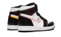 The Air Jordan 1 High “Defiant” is a unique colorway of the iconic model featuring “unstitched” Swooshes on the lateral sides. The eye-catching construction features a black and white leather upper with red contrast stitching throughout, including for the deconstructed stitching that makes the shape of the Swoosh, intended to appear as if the leather Swoosh was cut off. Intact yellow leather Swooshes are found on each medial side. A black leather tongue and Air Jordan “wings” logo patches complete the distinct colorway. The Air Jordan 1 High “Defiant” with unstitched Swooshes released in July 2019.
