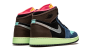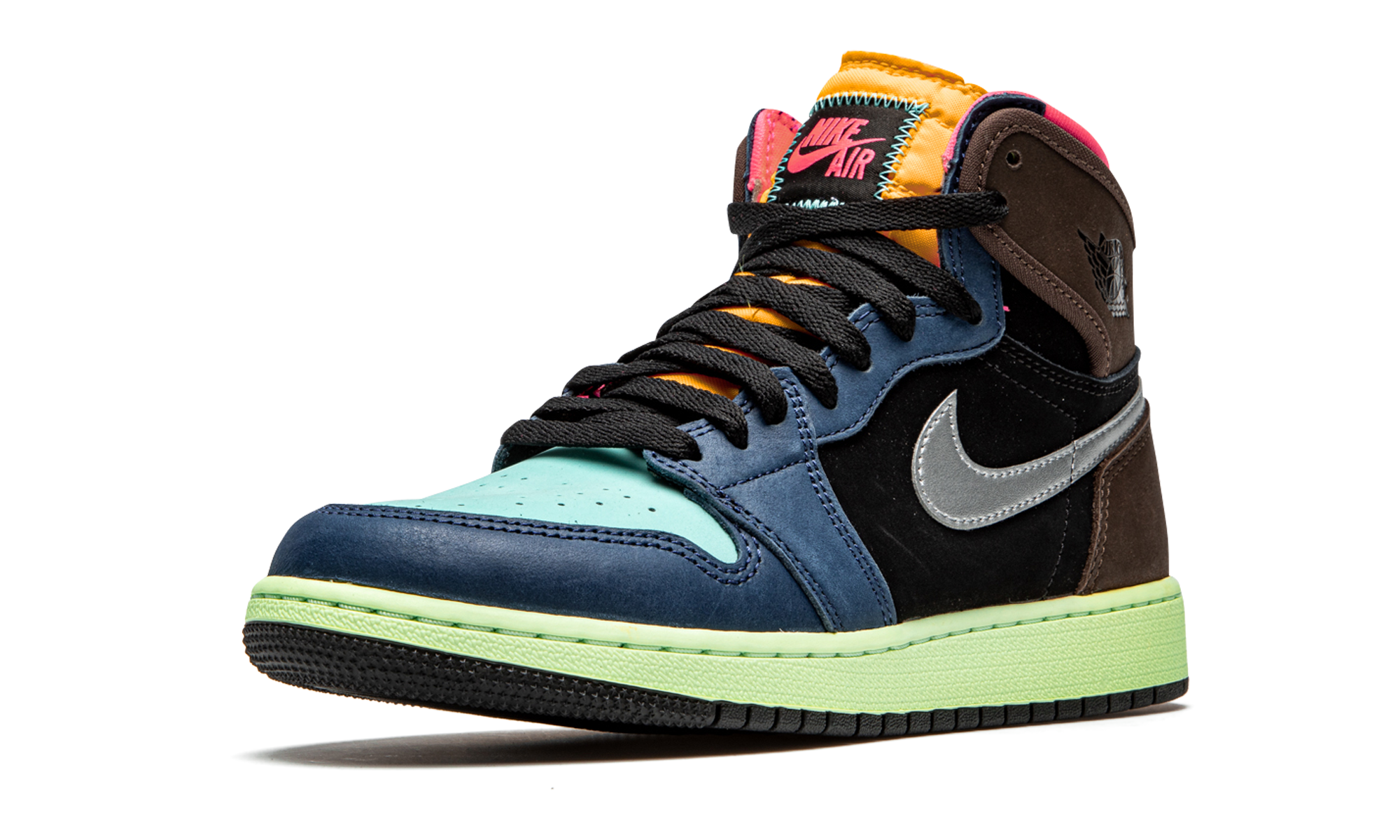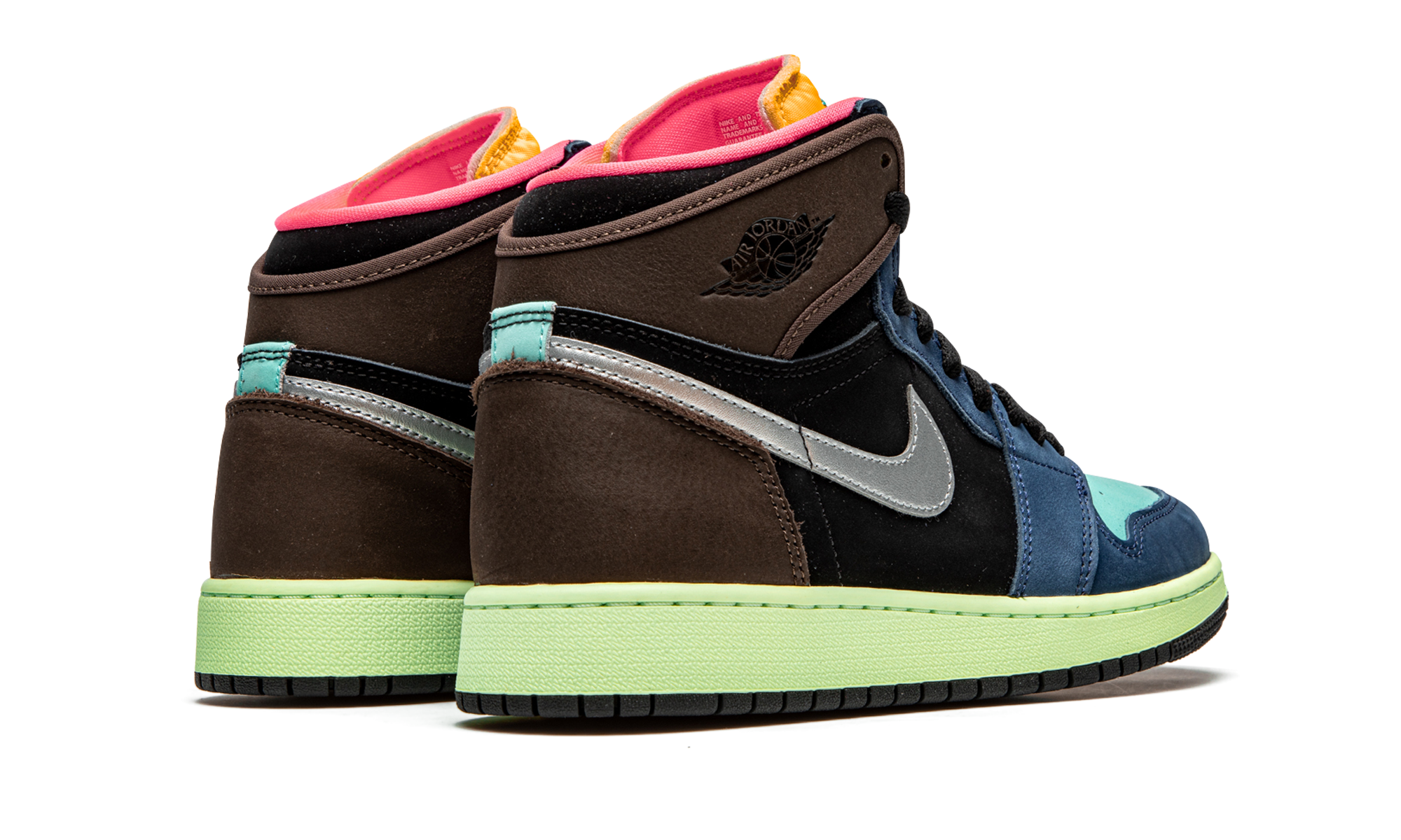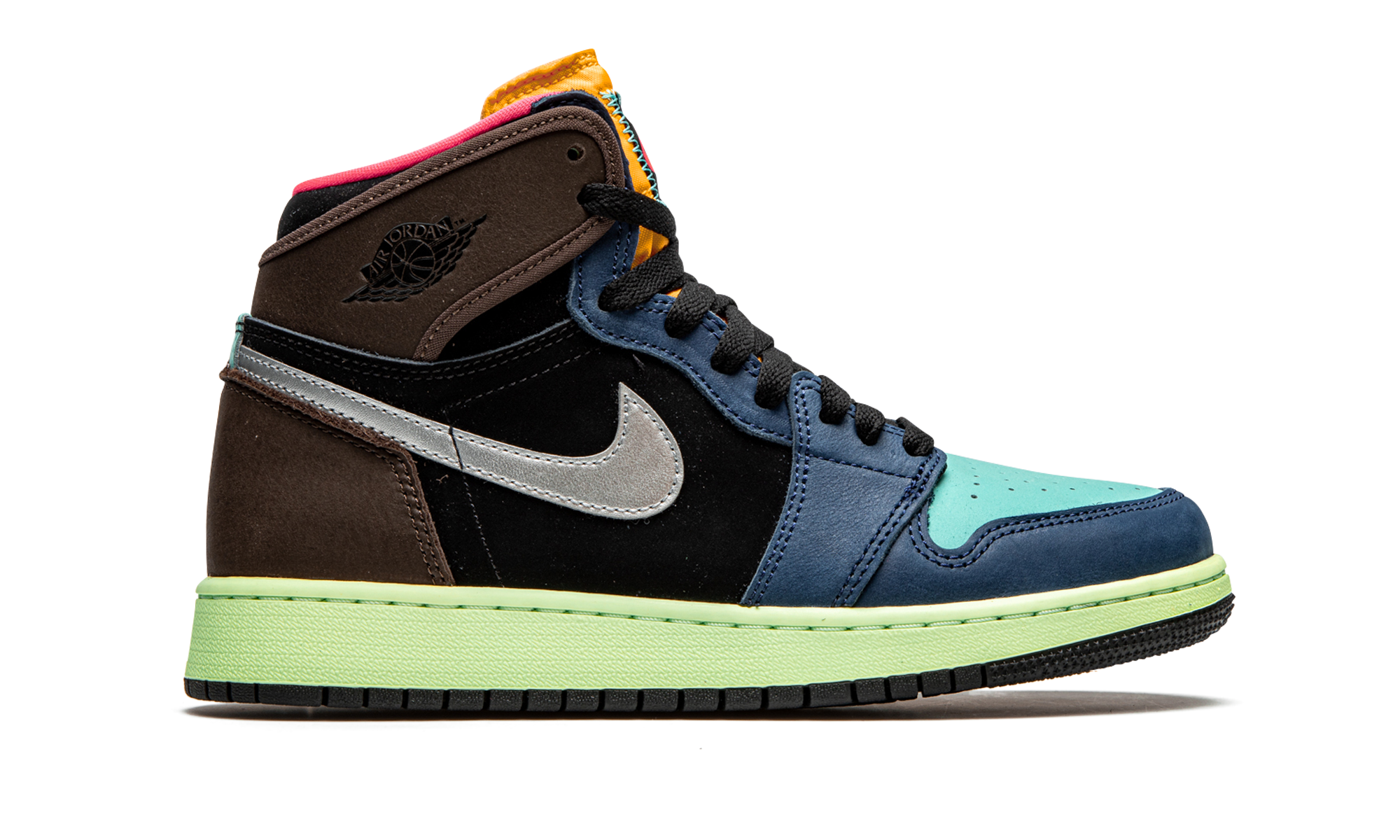 The Air Jordan 1 High GS “Bio Hack” is the youth sizing of Michael Jordan’s first signature shoe in a bold yet somewhat familiar colorway. Loosely based on Undefeated’s classic Nike Dunk collaboration from 2005, the “Bio Hack” pulls various contrasting colors together to form one of the boldest Jordan 1s yet. The Baroque Brown collar and heel is reminiscent of Travis Scott’s Air Jordan 1. A Metallic Silver leather Swoosh appears on the black nubuck mid-panel. The perforated toe is finished off in teal suede. Final design elements include a Laser Orange tongue, tonal laces, and a mint green rubber outsole. Release date: September 4, 2020.
