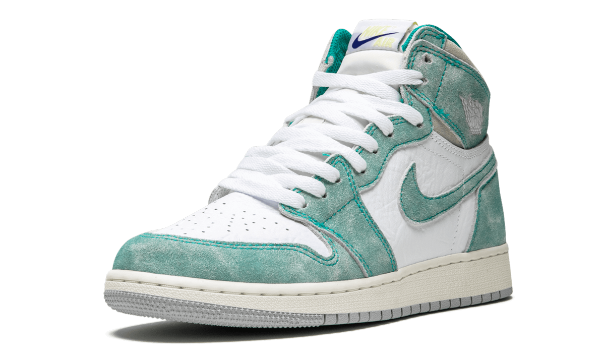 The Air Jordan 1 High GS “Turbo Green” is the kids’ grade school sizing for the popular colorway released in 2019. A distressed treatment was used on the leather of the upper to create a vintage effect, and the kids’ Jordan 1 has a teal and white color scheme with hints of purple and yellow to pay homage to the Charlotte Hornets, the NBA team that hosted the 2019 NBA All-Star Game. A cream midsole helps continue the vintage aesthetic, and each pair is completed with a grey outsole. The youth Air Jordan 1 High GS “Turbo Green” released on February 15, 2019.