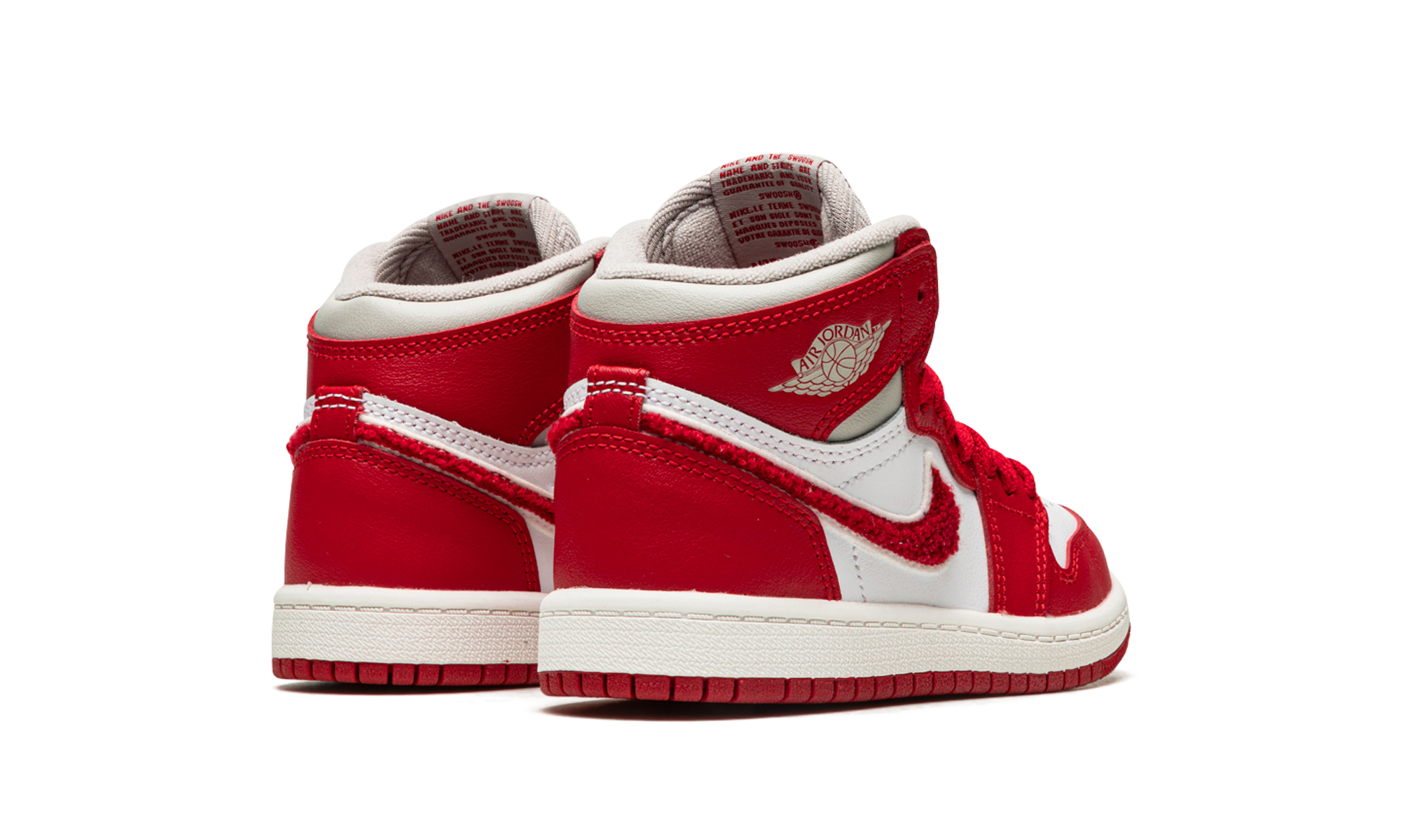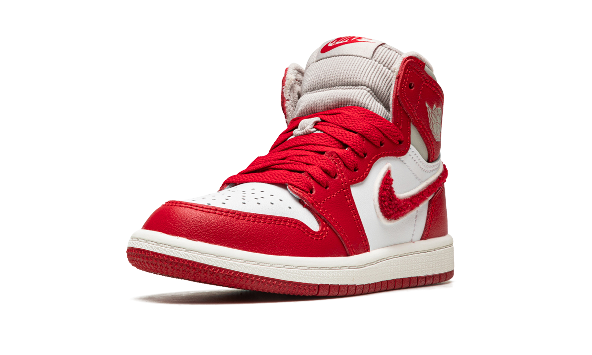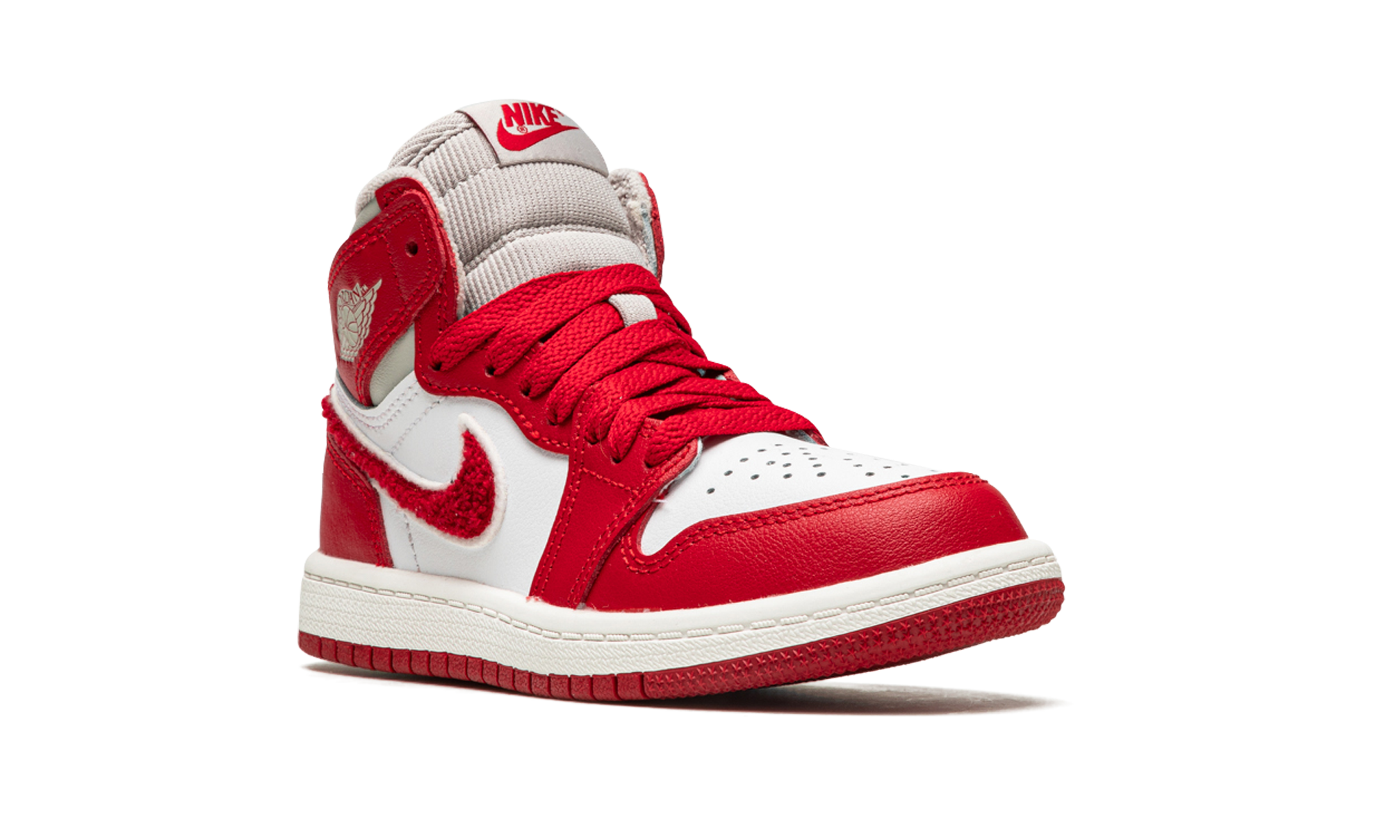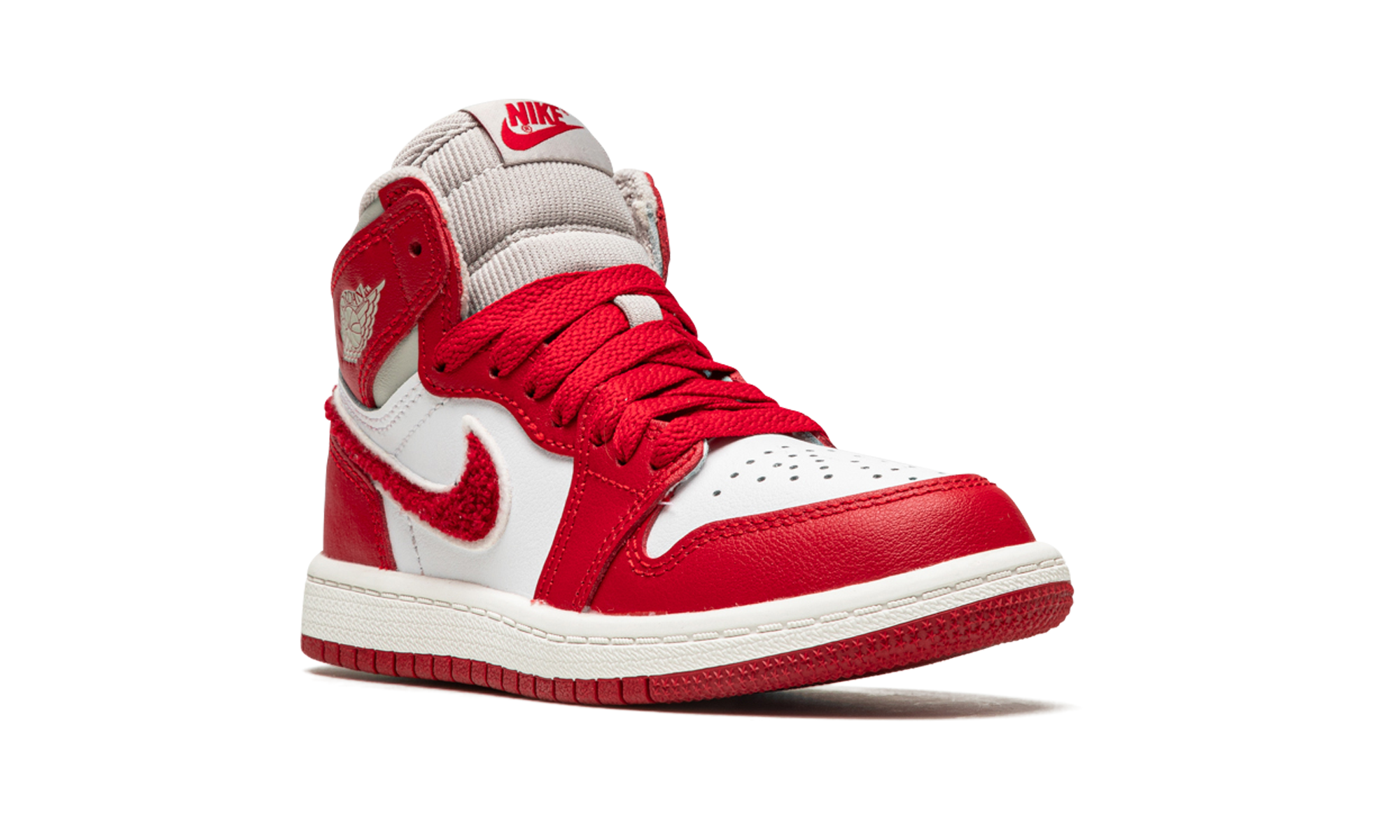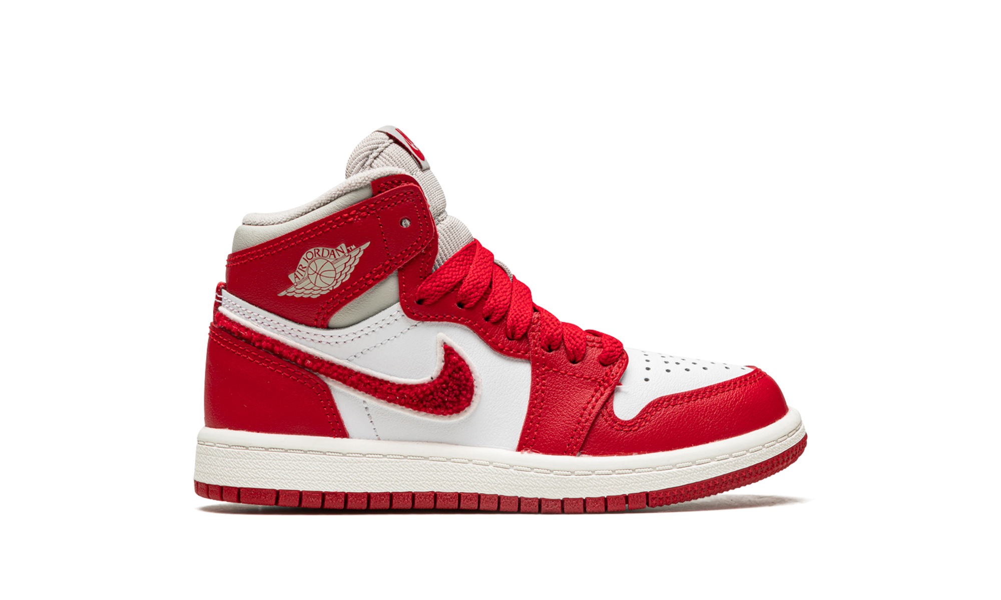 The Air Jordan 1 High OG PS “Varsity Red” is the youth sizing of the retro basketball shoe with a premium build. Also known as the “Newstalgia,” this July 2022 release of Michael Jordan’s first signature shoe looks to vintage varsity letterman jackets, specifically the chenille patches that are often found on their design, for inspiration. The shoe’s perforated toe and mid-panel are designed in white leather. Contrasting Varsity Red leather appears on the overlay panels. The side Swooshes are designed in a fiery red chenille material. A light grey “Wings” logo appears on the collar. Additional design elements include a grey corduroy collar, red “Nike Air” branding on the tongue tag, and red laces. Release date: July 20, 2022
