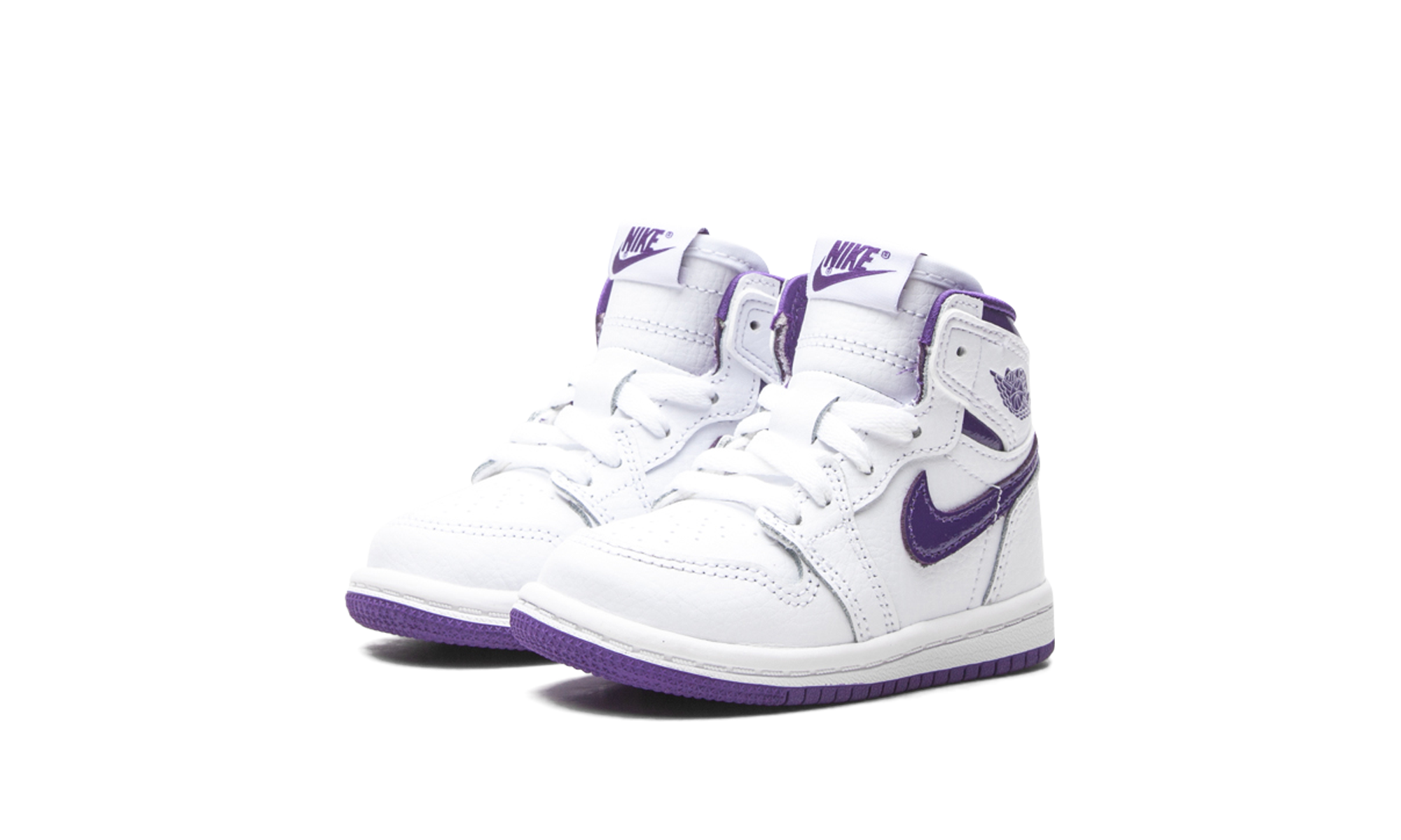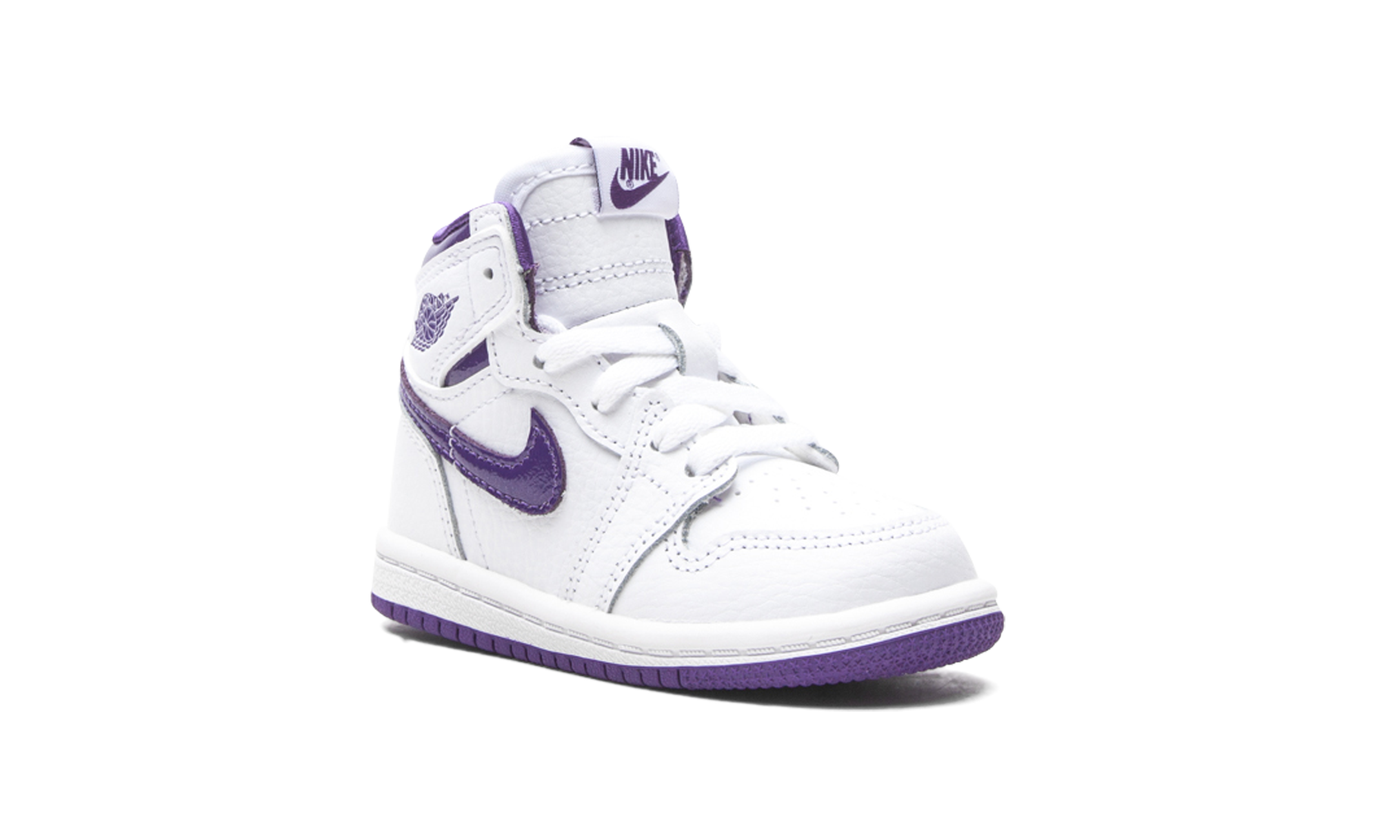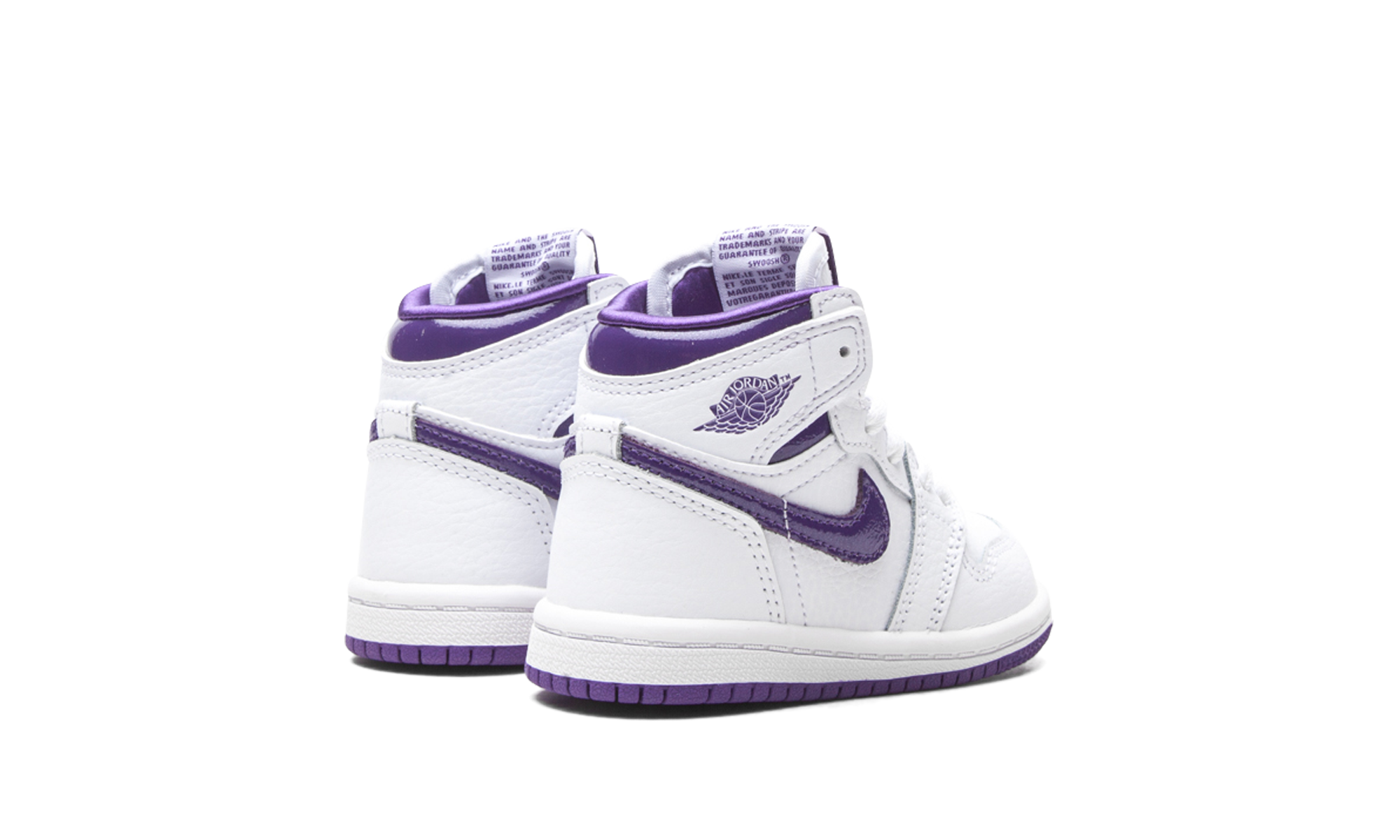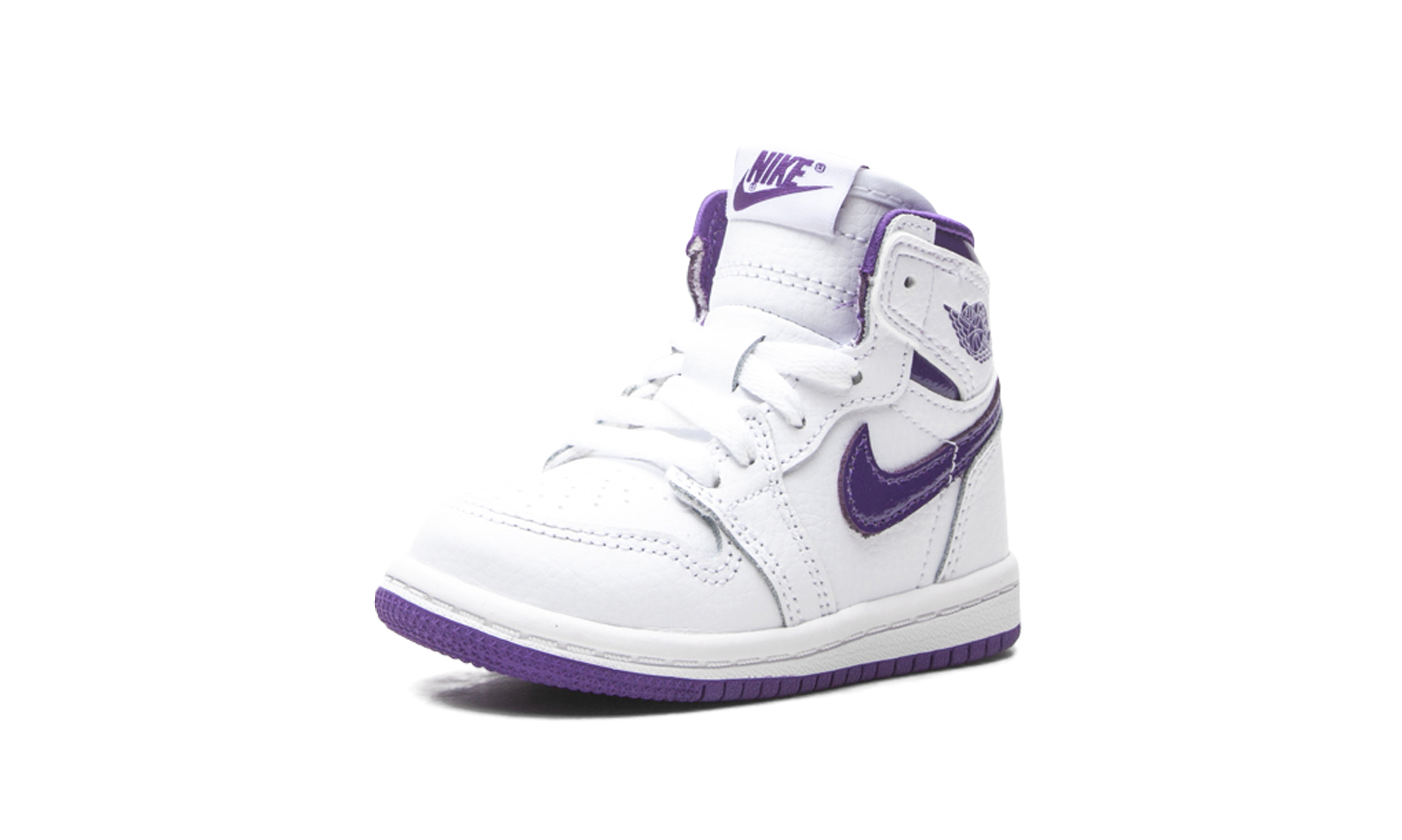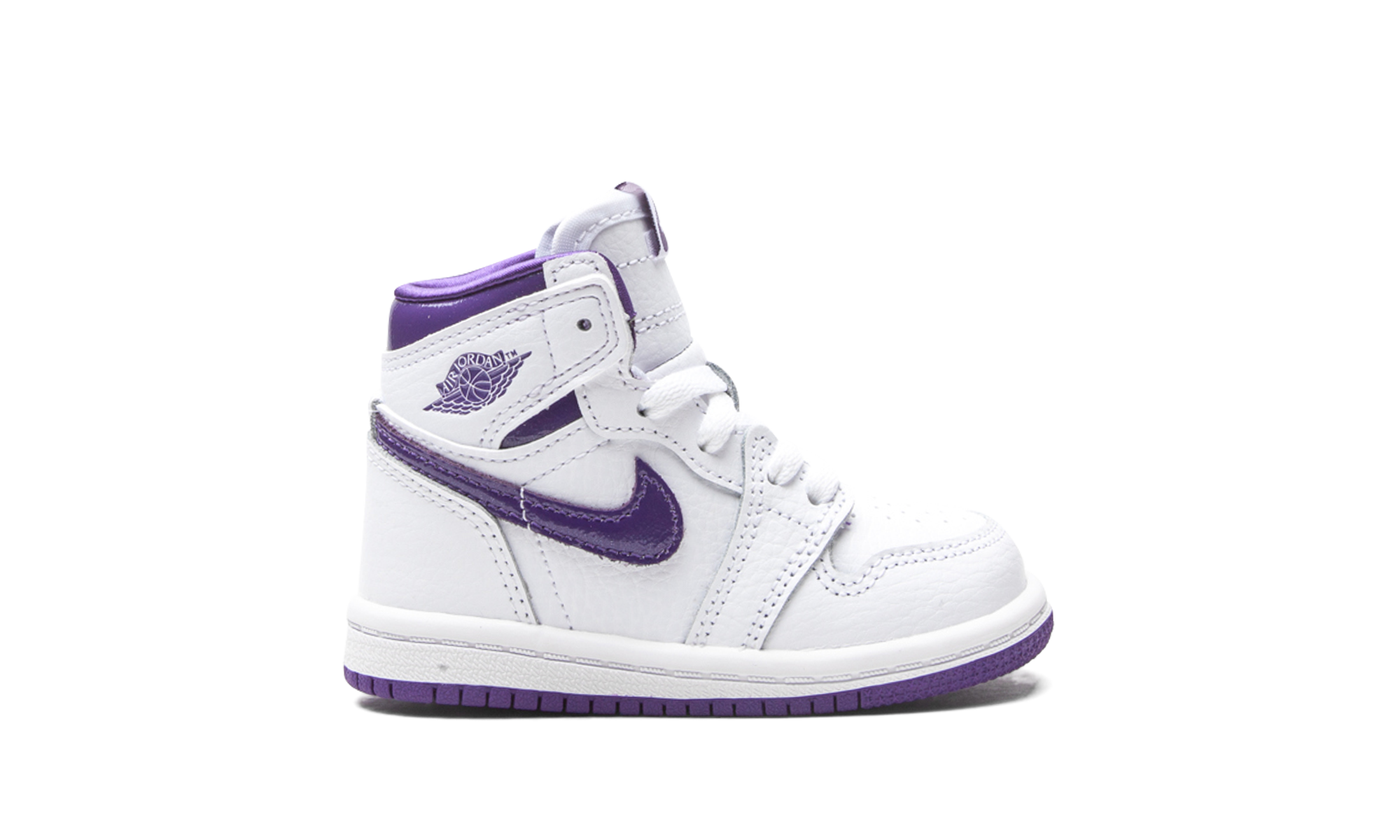 The Air Jordan 1 High TD “Court Purple” is the toddler sizing of Michael Jordan’s first signature shoe in a colorway that references one of the model’s original designs. The “Court Purple” edition of the popular high-top retro basketball shoe is a salute to the original “Metallic Purple” look from 1985. Interestingly, the “Metallic Purple” has never been retroed since its original release. This Summer 2021 version of the look is very similar to the aforementioned colorway, but there are a few differences. The upper features a white tumbled leather construction with Court Purple leather Swoosh branding on both sides. A purple “Wings” logo appears on the white leather overlay beneath the glossy Court Purple leather collar. The key difference between the “Court Purple” and “Metallic Purple” is in the material used on the inner lining and tongue. Here, a satin material is used for the lining in lieu of the standard cloth found on most Jordan 1s, and the tongue is constructed in leather, not nylon like the original version of the shoe. Finally, the purple accents on the “Court Purple” do not emit the sparkle finish seen on the “Metallic Purple.” Release date: June 3, 2021.