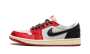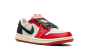 The Trophy Room x Air Jordan 1 Low OG “Away” is a collaboration by Marcus Jordan’s sneaker boutique and Jordan Brand inspired by Michael Jordan’s 1986 Fleer Basketball rookie card and a 1984 Sports Illustrated photo featuring Jordan in his Chicago Bulls warm-up uniform. From the “Home & Away” Jordan 1 Low OG collection by Trophy Room and Jordan Brand, the “Away” colorway has a “Reverse Black Toe” inspired look and is made from an interesting combination of materials. Specifically, the upper has a Varsity Red-colored polyester fabric on the toe that replicates vintage jersey material, and a white leather base. A black fabric material appears on the heel, while a black Swoosh is embroidered on either side. A Metallic Gold “Wings” badge appears on the heel tab and classic “Nike Air” branding can be found on the tongue tag. A Sail rubber midsole gives the shoe a vintage look, tying into the colorway’s old school vibe.