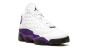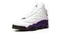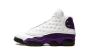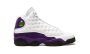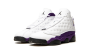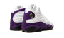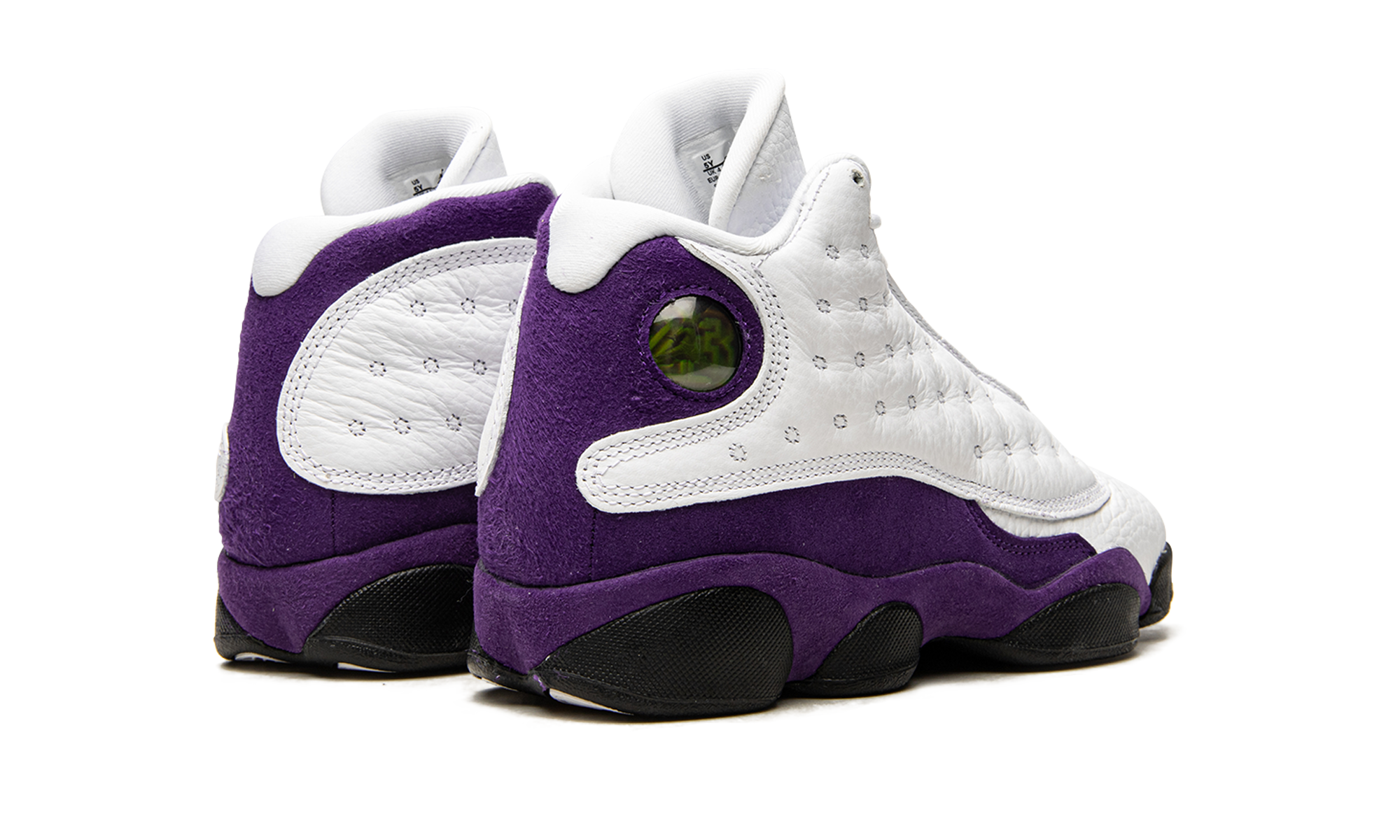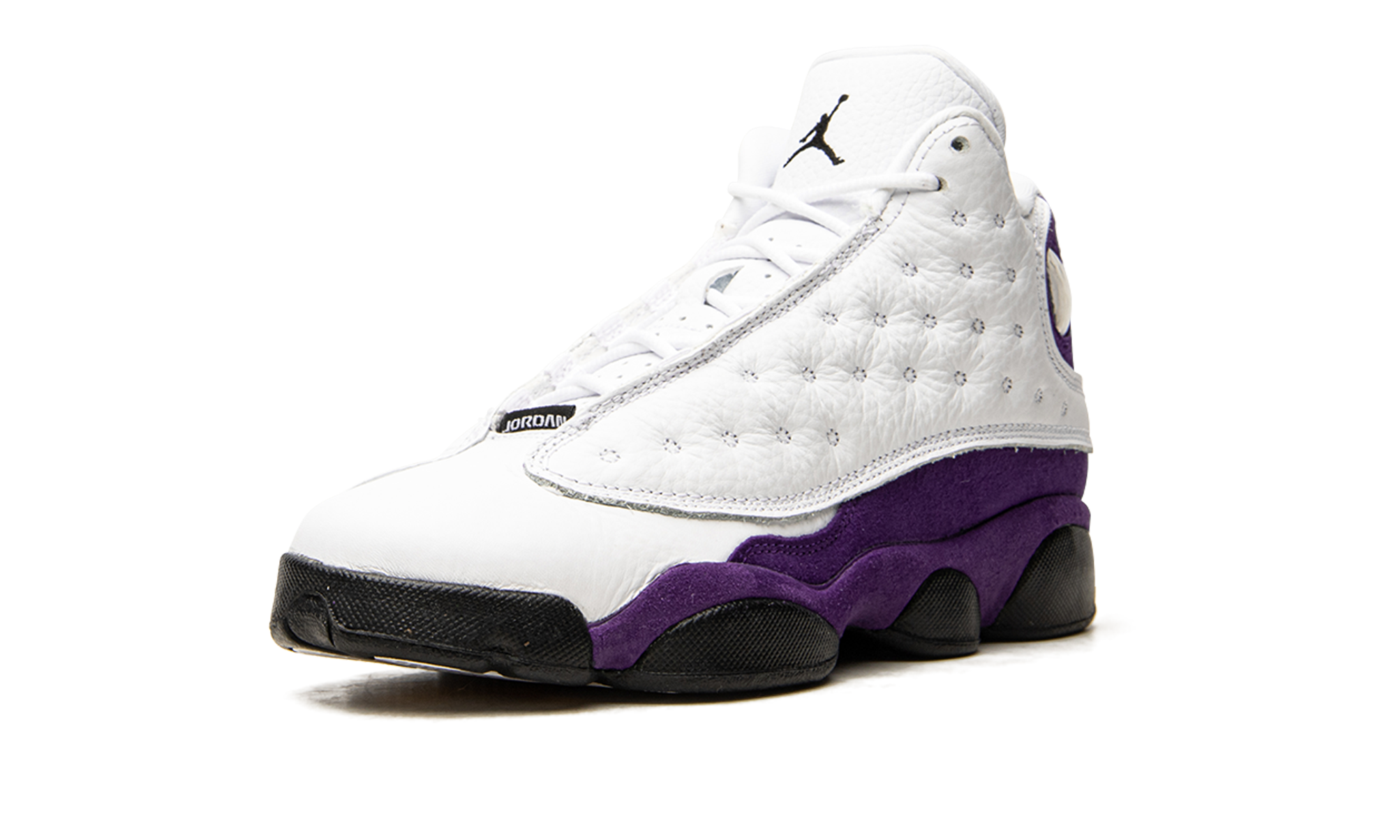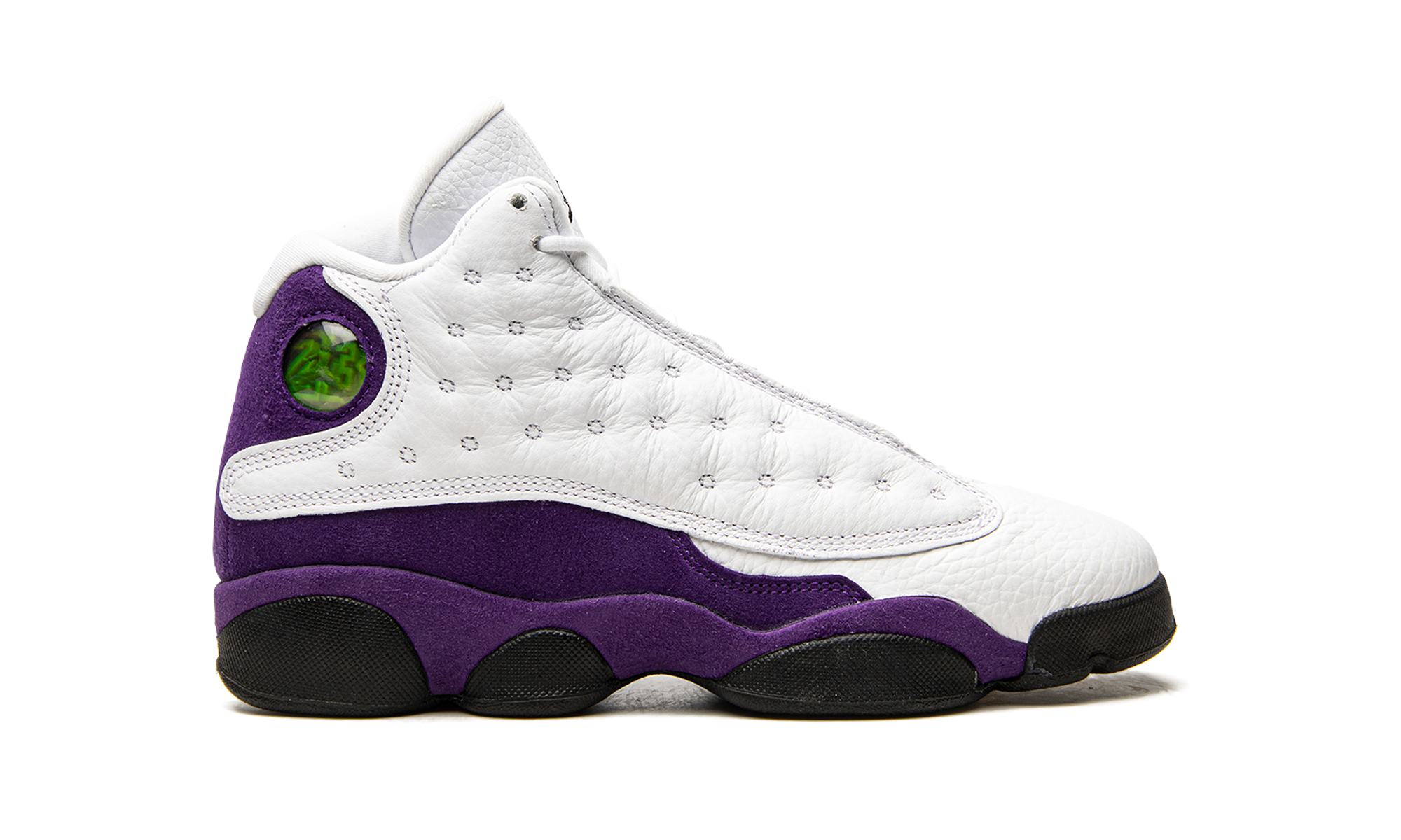 The youth sizing of the Air Jordan 13 “Lakers” is dedicated to Los Angeles Lakers purple and gold uniform colors. Worn by Michael Jordan during the 1997-98 NBA season, his last with the Chicago Bulls, the Jordan 13 model is famous for its of-the-time ‘90s looks and high-top silhouette. An eye-pleasing purple suede appears on the mudguard and heel while a soft tumbled white leather mid-panel offers a solid base allowing for the purple suede to pop. Details unique to the Air Jordan 13 include the signature circular holographic logo on the collar, a black Jordan tag on the forefoot, and a black embroidered Jumpman logo on the tongue. The grade school sizing of the Air Jordan 13 “Lakers” was released on July 19th, 2019.