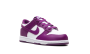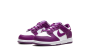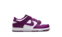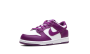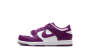 the Nike Dunk Low in the “White/Viotech-White” colorway, designed for Little Kids or Preschoolers (PS). This classic basketball-inspired sneaker features a premium leather upper, a soft foam midsole for cushioning, a padded collar for comfort, and a durable rubber outsole with pivot-point tread for excellent grip.