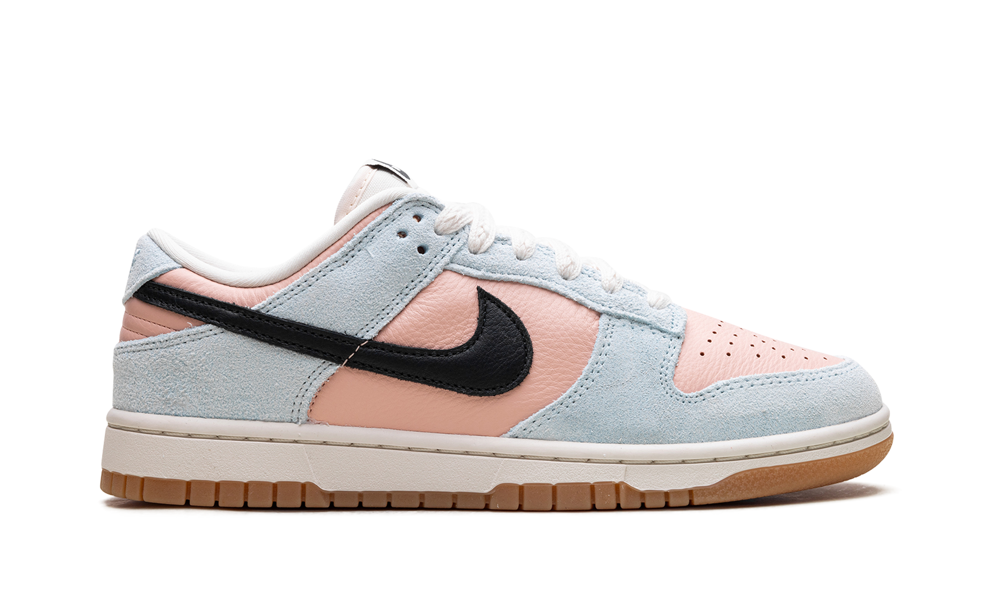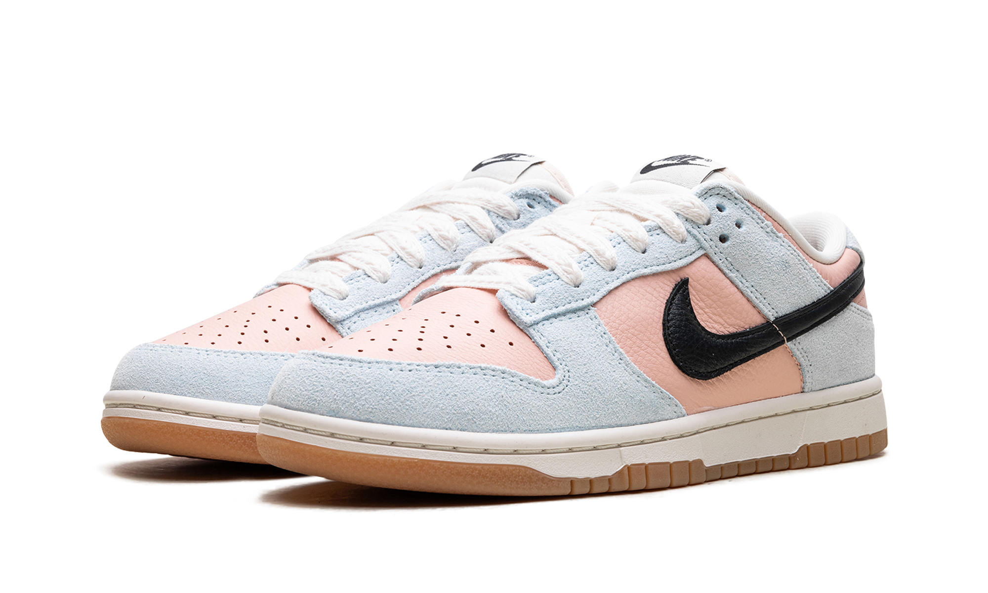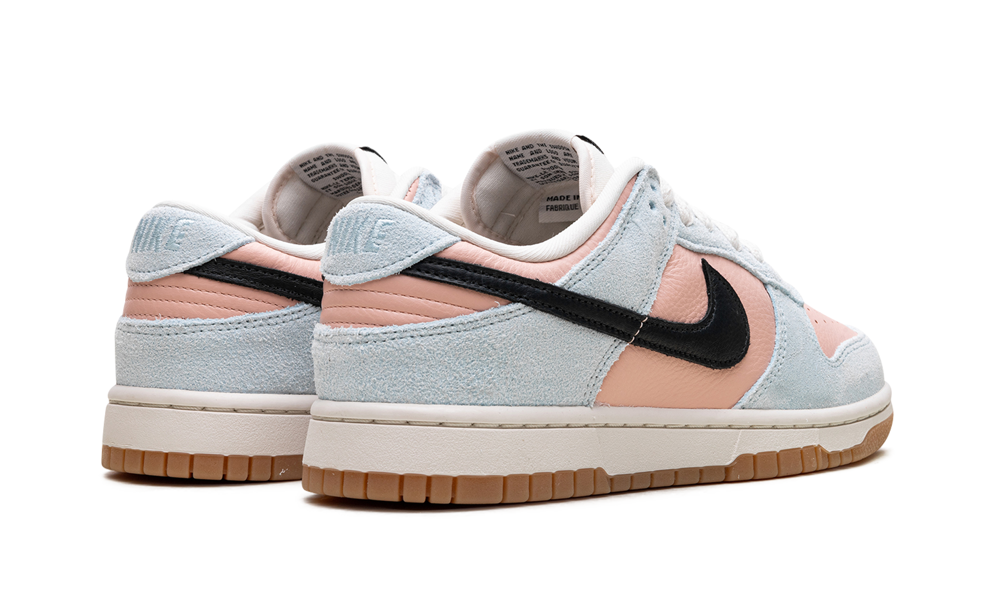 The Nike Women’s Dunk Low ‘Glacier Blue Arctic Orange’ showcases a solid black leather Swoosh on the upper, which is crafted from pink tumbled leather with suede overlays in a light blue hue.