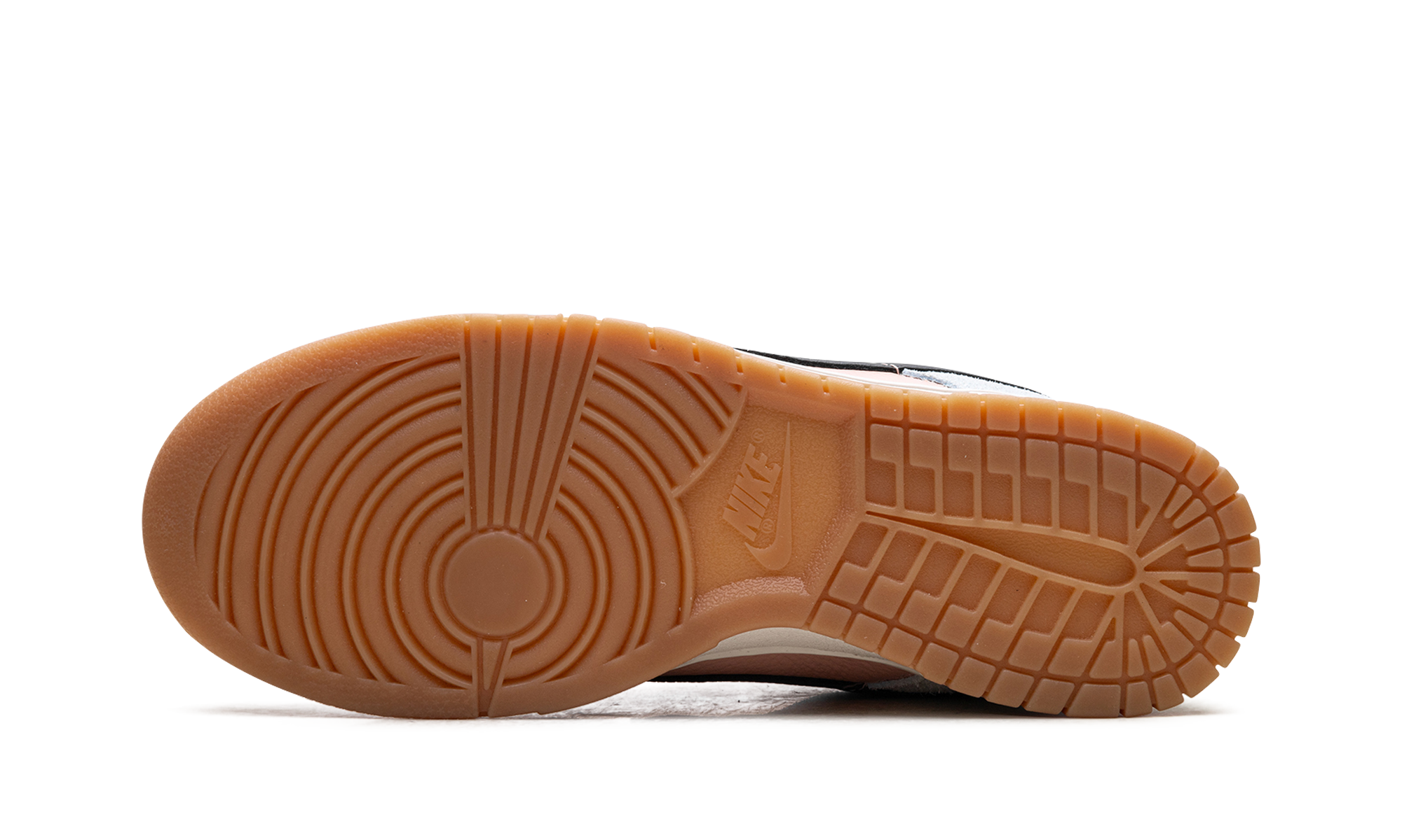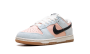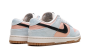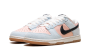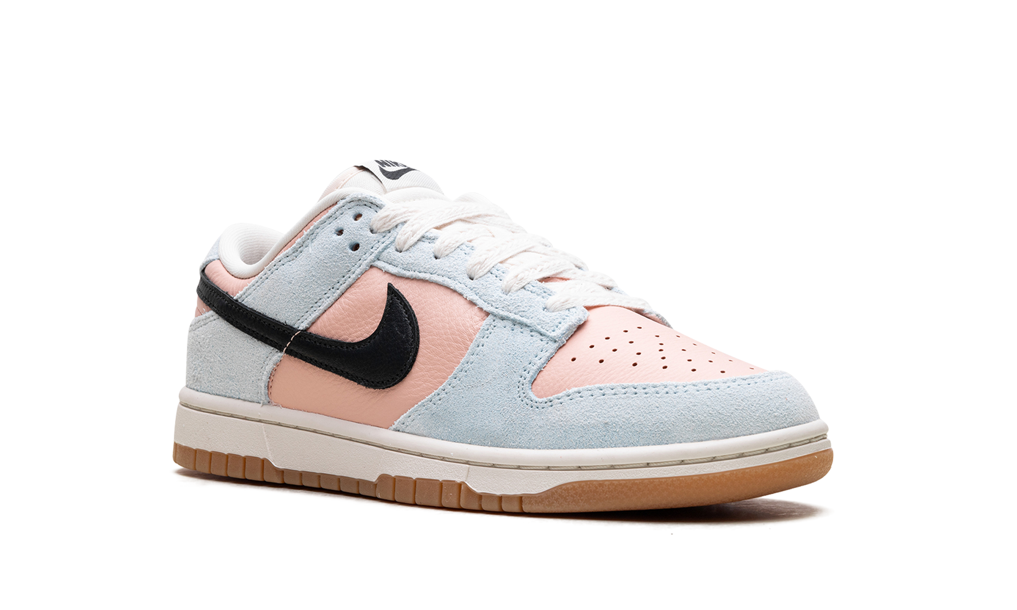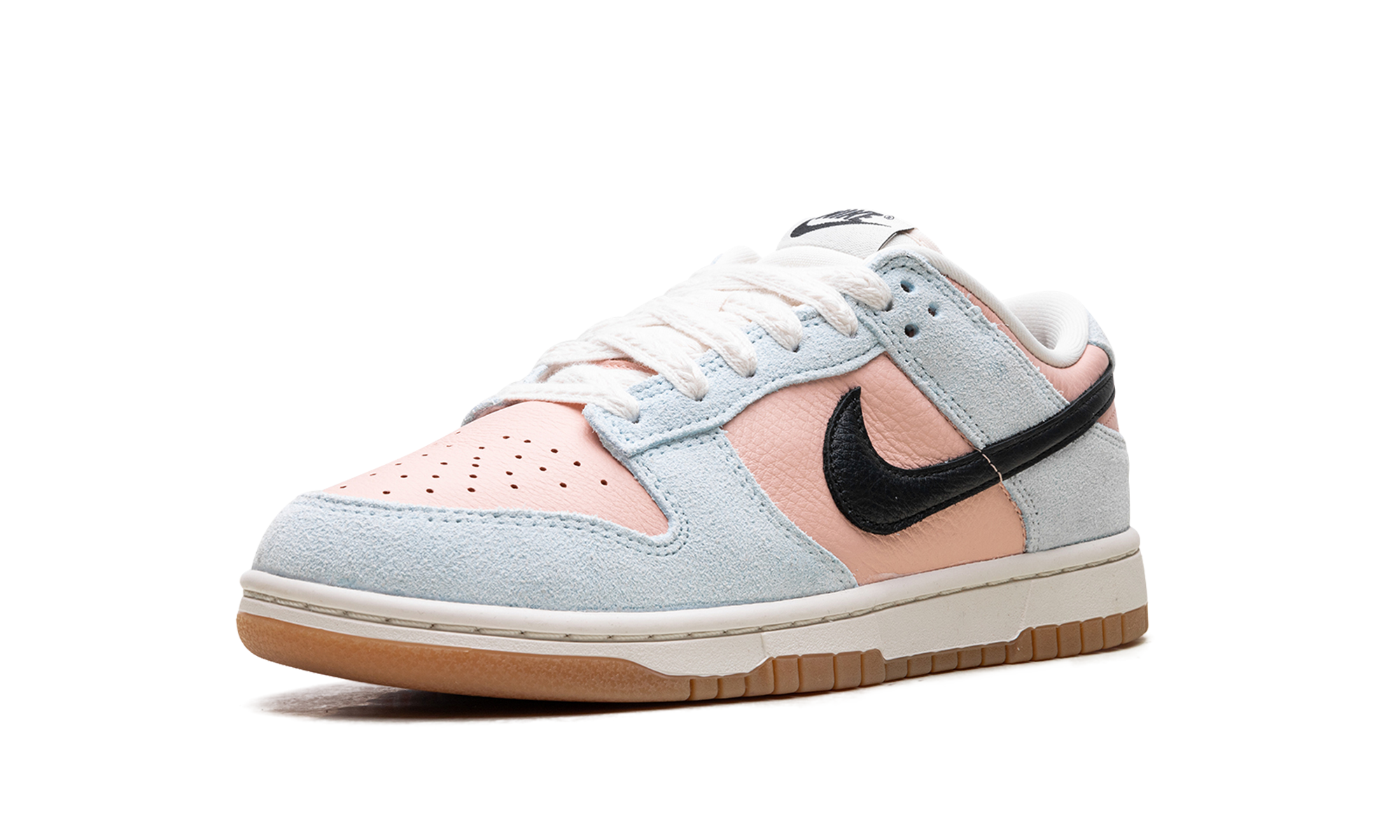 The Nike Women’s Dunk Low ‘Glacier Blue Arctic Orange’ showcases a solid black leather Swoosh on the upper, which is crafted from pink tumbled leather with suede overlays in a light blue hue.