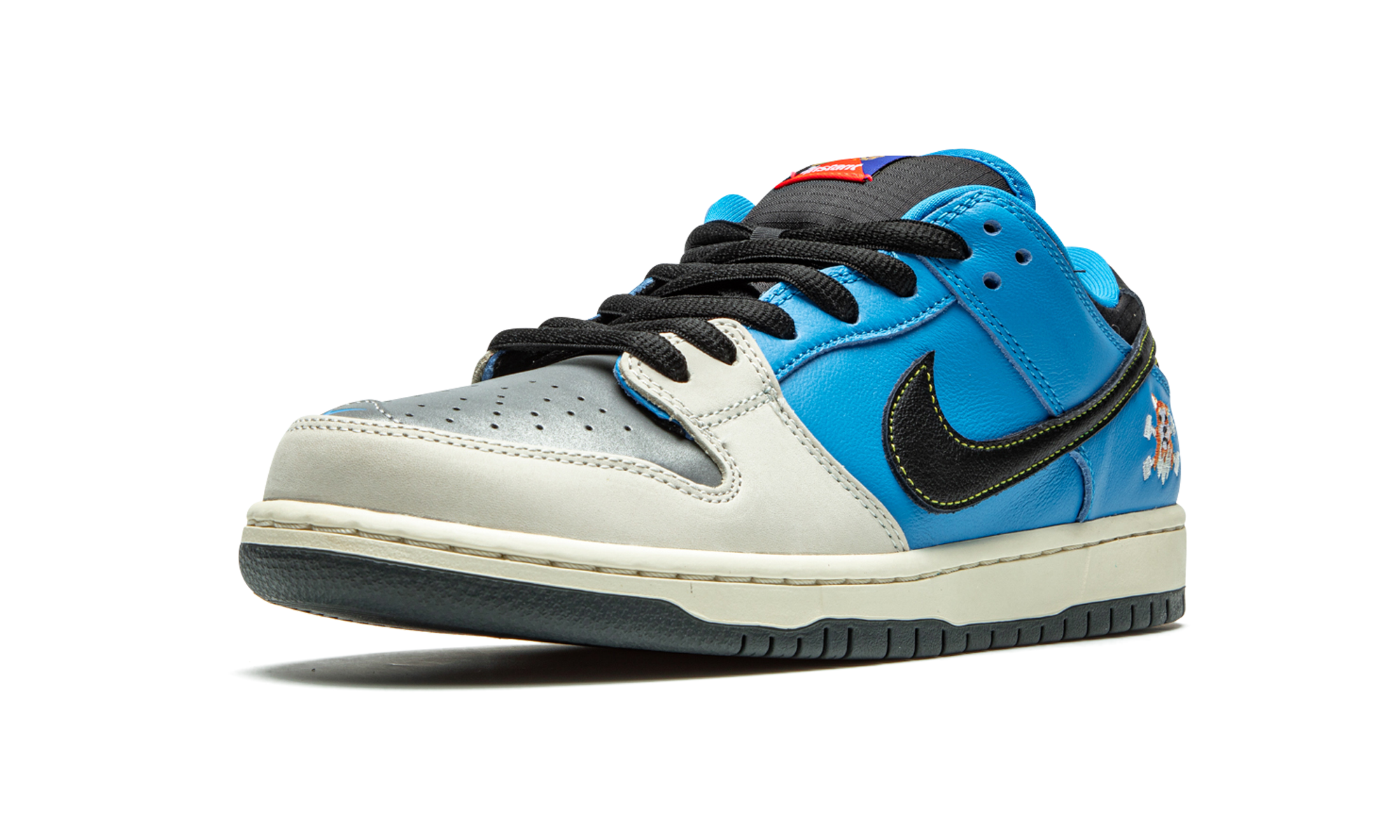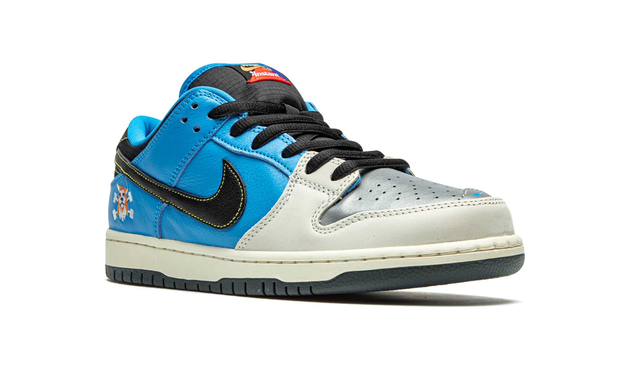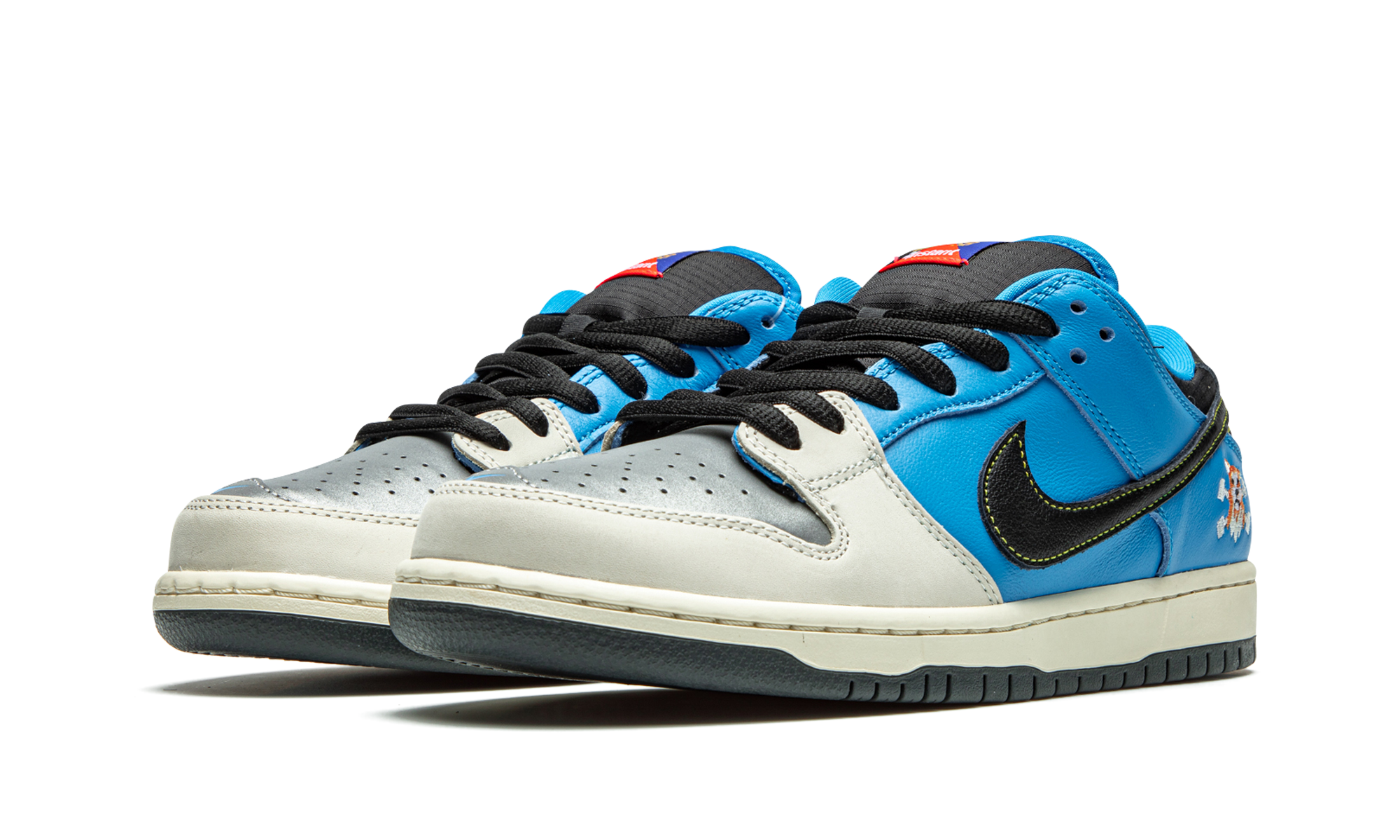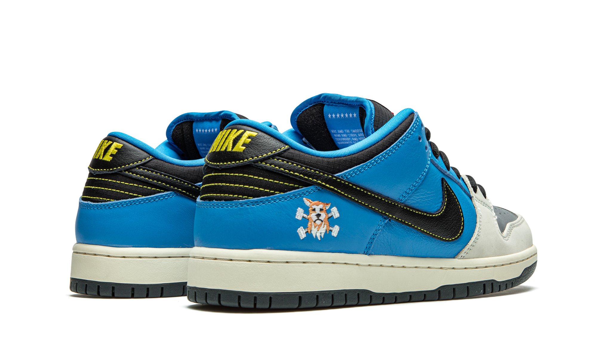 The Instant Skateboards x Nike SB Dunk Low is a 2020 collaboration between the Japanese skate shop and Nike SB on the all-time classic Dunk silhouette. This special Dunk colorway celebrates Instant Skateboards 25-year anniversary. As colorful of a Dunk as there’s ever been, the upper features what Nike SB is calling Blue Hero leather on the mid-panel and heel. The electric hue also appears on the liner and underside of the puffy black ripstop tongue. Pale Ivory leather detailing is located on the forefoot. Contrasting silver leather makes up the perforated toe area. Yellow stitching surrounds the black leather Swoosh. The stitching pattern reappears on the black leather heel tab. Yellow embroidered “Nike” insignia dots the heel. An embroidered dog with crossbones can be found near the heel. A vintage inspired cream midsole completes the look of this Instant Skateboards x Nike SB Dunk Low. Release date: September 19, 2020.